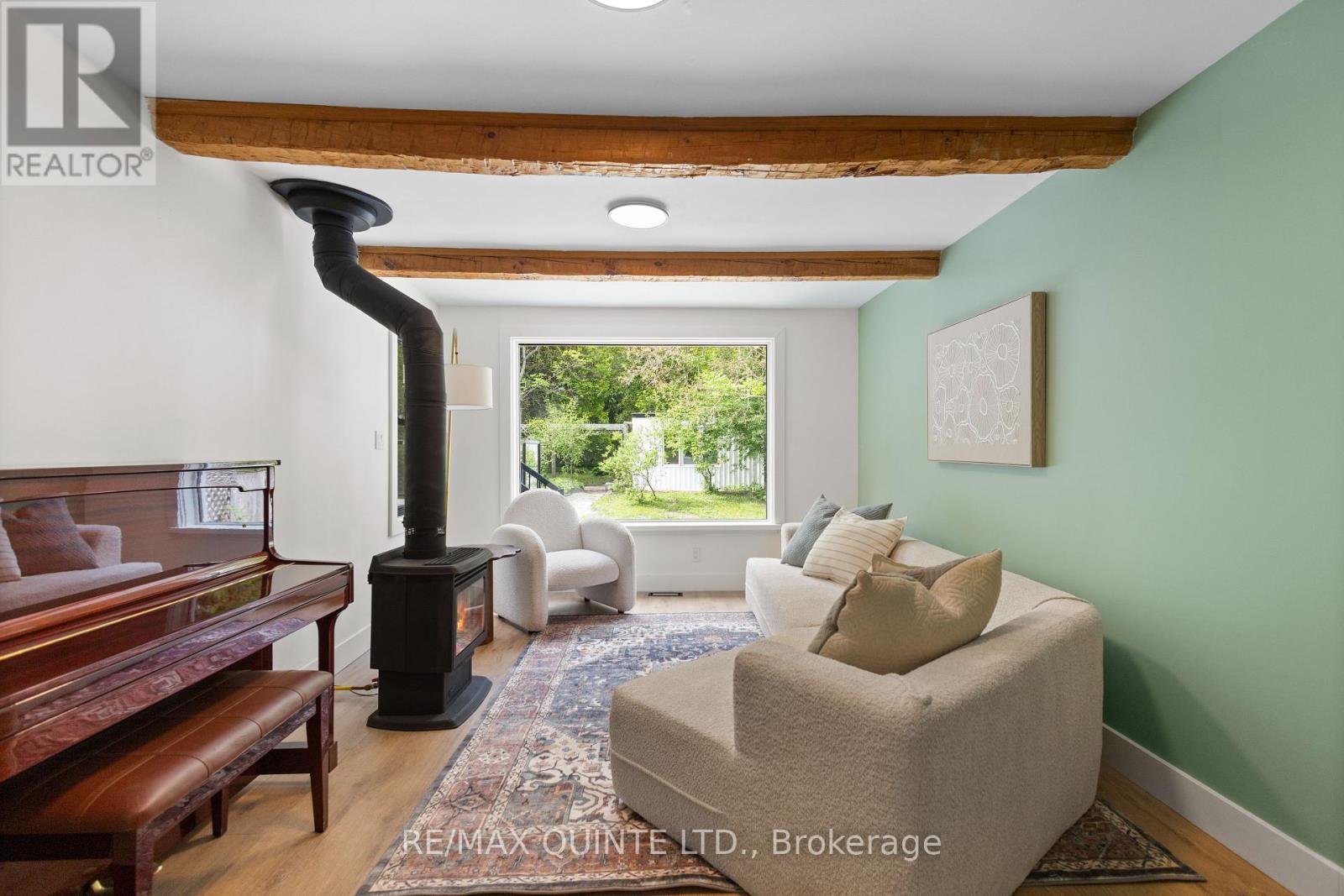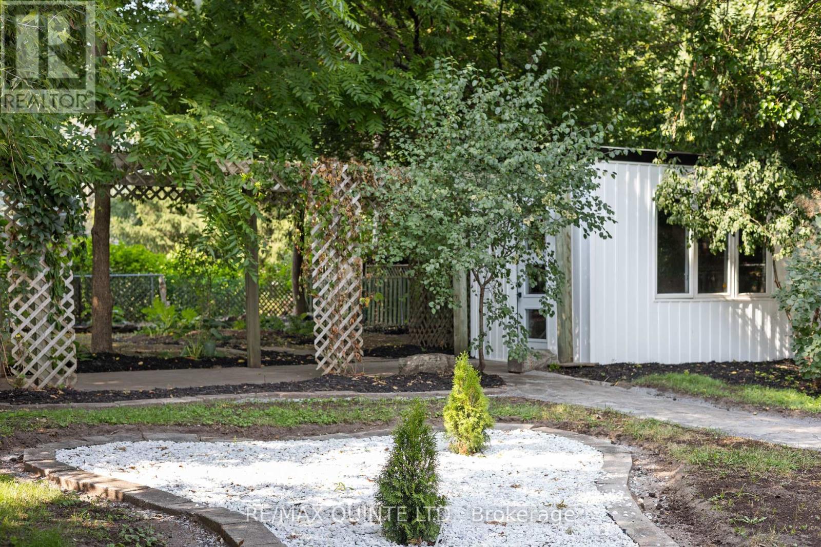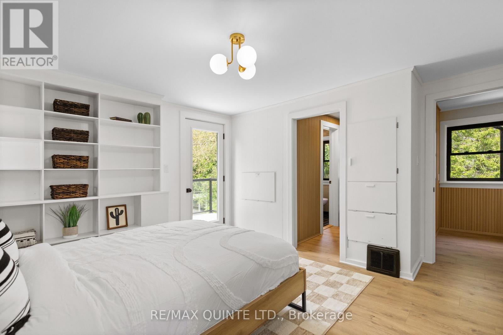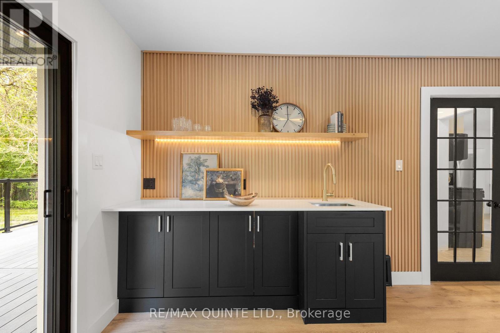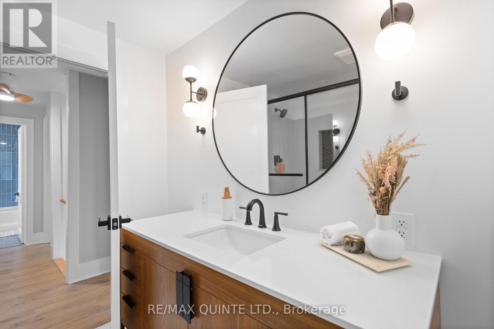 Stunning modern architectural home in the heart of Old East Hill, set on a private 175+ ft lot. Completely reimagined and thoughtfully renovated, this one-of-a-kind residence offers 3 bedrooms, 3.5 bathrooms, and multiple spaces designed for everyday living and entertaining. The striking stone and stucco exterior, attached garage, covered porch, and solarium create a bold first impression. Inside, the spacious kitchen steps down to a sunken living room with exposed beams, a gas fireplace, and oversized rear-facing windows that bring the outdoors in. A 2-piece bath and convenient laundry area are tucked away enroute to the open-concept living and dining area featuring modern lighting, a second gas fireplace, a wet bar, and access to the expansive composite deck with glass railings. Upstairs, all three bedrooms are paired with full bathrooms for ultimate convenience. The primary suite includes a walk-in closet, feature wall with sconce lighting, and a walkout to a private terrace overlooking the park-like backyard. Additional outdoor highlights include a lower-level concrete patio and steps wrapping around the eastside. Situated in one of Belleville's most sought-after neighbourhoods, this home stands out for its design, finishes, and exceptional setting. (id:51158)
