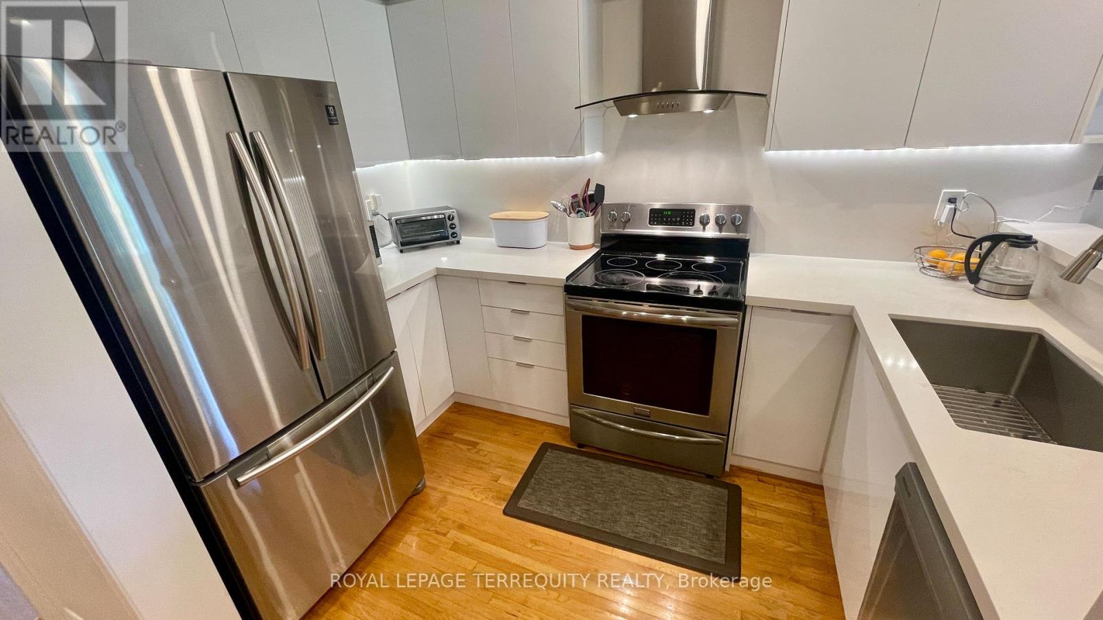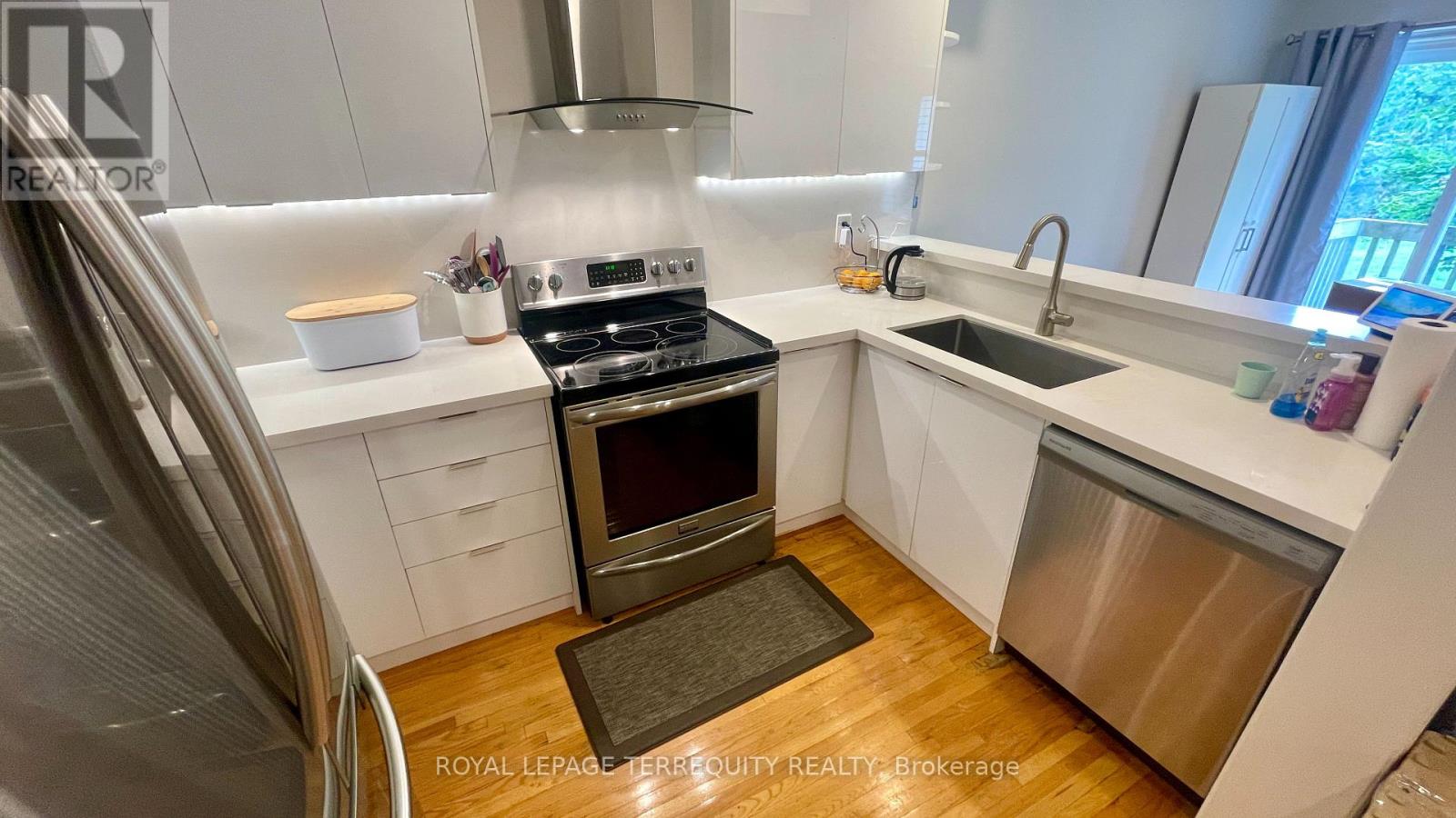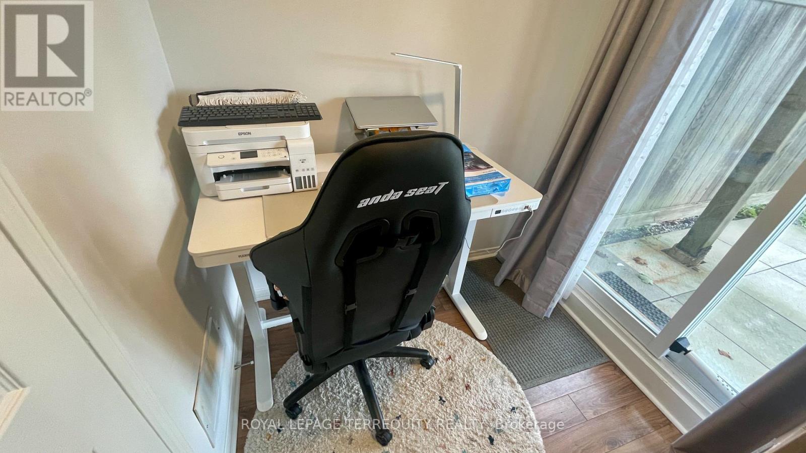 Step into this beautifully renovated 3-bedroom townhouse, where contemporary elegance meets functional design. The modern kitchen boasts sleek quartz countertops and breakfast bar, complemented by high-gloss cabinets & stainless steel appliances. The kitchen is well-lit with stylish pot lights that enhance the chic ambiance. The spacious layout is perfect for relaxing, bathed in natural light from large windows & overlooks a tranquil park. The walk-out basement adds versatility, dedicated office space and a full 3 pc bathroom, ideal for both work and leisure. A rare second-floor laundry area with ample shelving for optimal organization. Situated close to local parks, churches, & Go Stn, restaurants & shopping this townhouse combines convenience with luxury, offering a truly exceptional living experience. (id:51158)