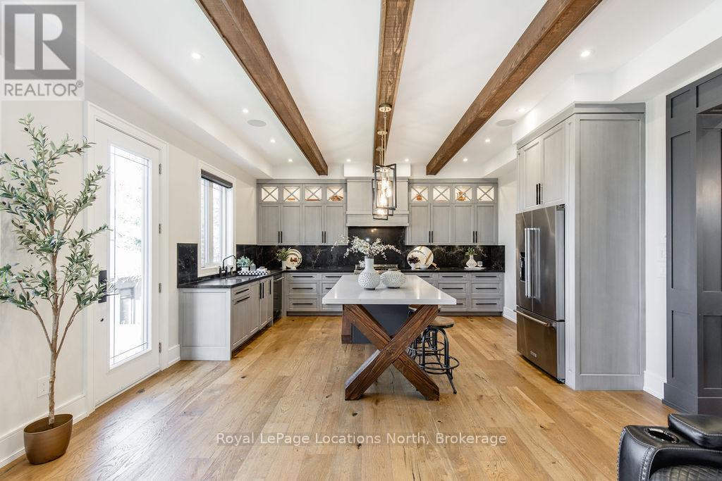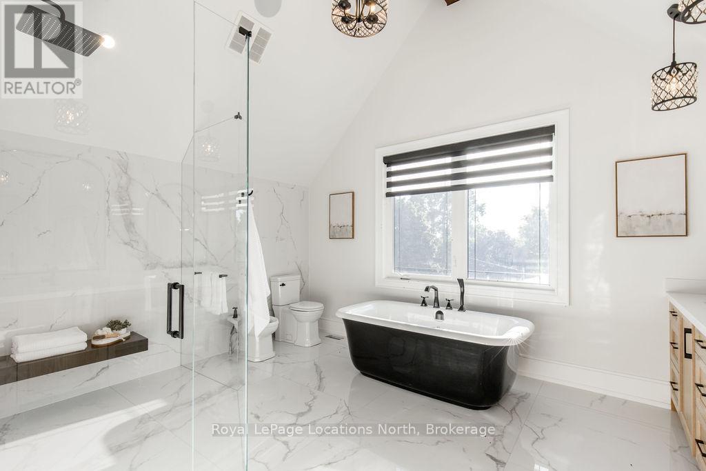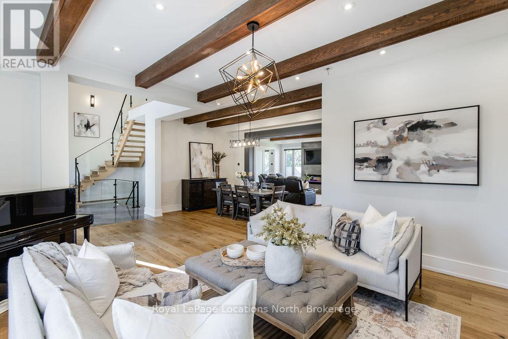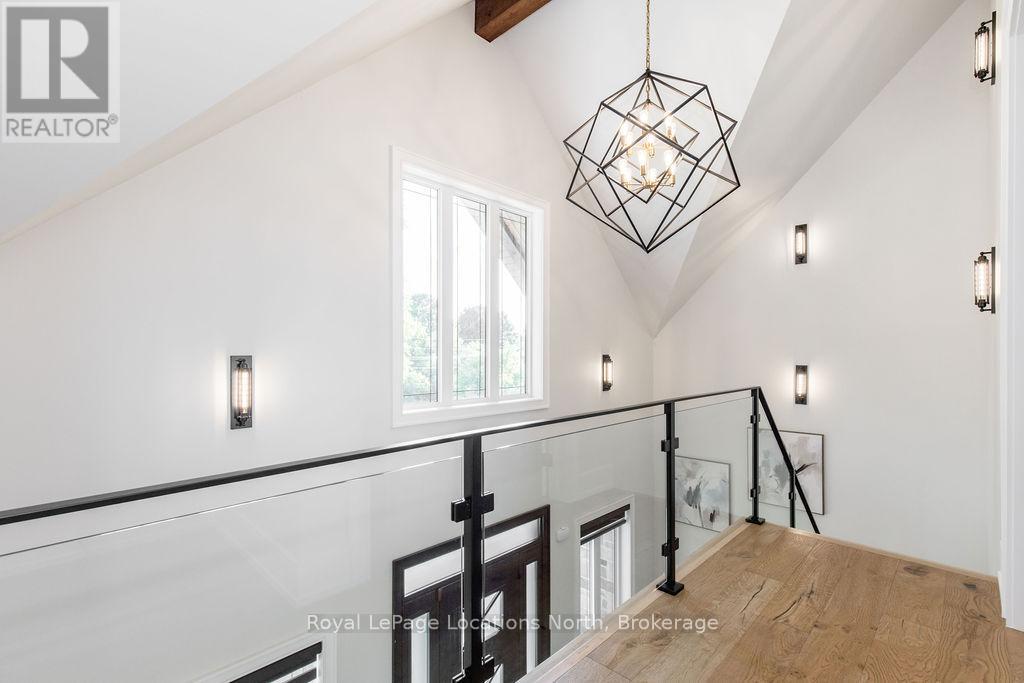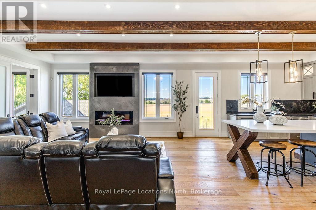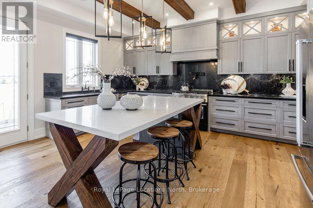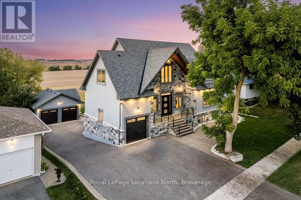 MLS# N12070419 – FOR SALE : 22 East John Street Cookstown Innisfil – 5 Beds, 5 Baths Detached House ** BACKS ONTO PROTECTED LAND. This stunning luxury home is situated on a quiet dead-end st, w/views of the countryside, + steps from park/rink/courts/library. This thoughtfully designed home offers an elegant, vibe, w/high end craftsmanship, featuring a stone + stucco exterior w/exceptional curb appeal. Upon entering, you are greeted by a grand entrance w/ heated porcelain tile floors, a custom wood staircase w/glass railing, + vaulted ceilings that create an inviting ambiance. The main level showcases engineered white oak flooring + exposed beam accents. The spacious living room offers custom-built cabinetry, a tiled feature wall with a built-in electric f/pl, + space for a TV. Adjacent is the elegant dining room, equipped w/ built-in cabinetry, dry bar, quartz counters, backsplash, +under-mount lighting perfect for entertaining. The family room flows directly from the dining room, offering a 2nd tiled wall w/ built-in electric f/pl, lg windows + seamless transition. The gourmet kitchen is classy, featuring an oversized island, quartz countertops, high-end s/s appliances, incl a gas range w/ a custom range hood + walk-in pantry. A private office w/views + a mud/laundry room w/heated tile floors, inside entry to garage w/ epoxy flrs + w/up from bsmt. 25 ft ceilings impress, flowing into 2nd flr w/white oak flooring that continues throughout, leading to the luxurious primary suite. This retreat incl access to private balcony, a walk-through clst w/ built-in organizers, + 6PC ensuite w/ dbl sinks, soaker tub, + large glass shower. Two additional bedrms each have their own 3PC bathrms w/ tiled showers + heated floors. The bsmt offers versatility, featuring expansive rec room + walk-out French doors leading to the patio, providing in-law potential. This bright space offers luxury plank flr, full kitchen, 2 bedrms, + a 3PC bathrm. Outside, enjoy an add. detached,heated ** 22 East John Street Cookstown Innisfil **