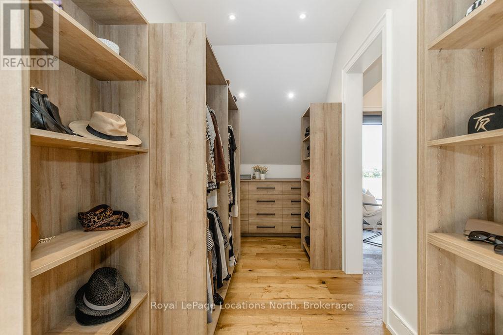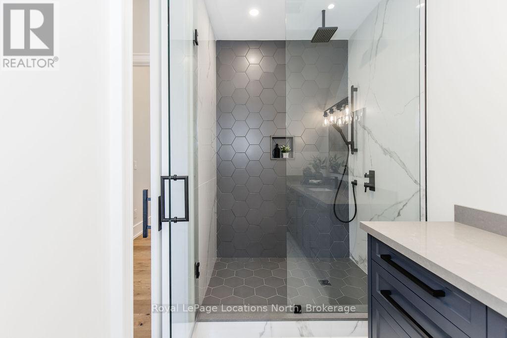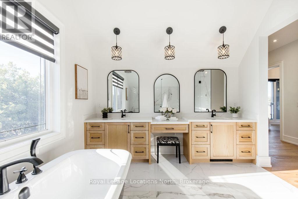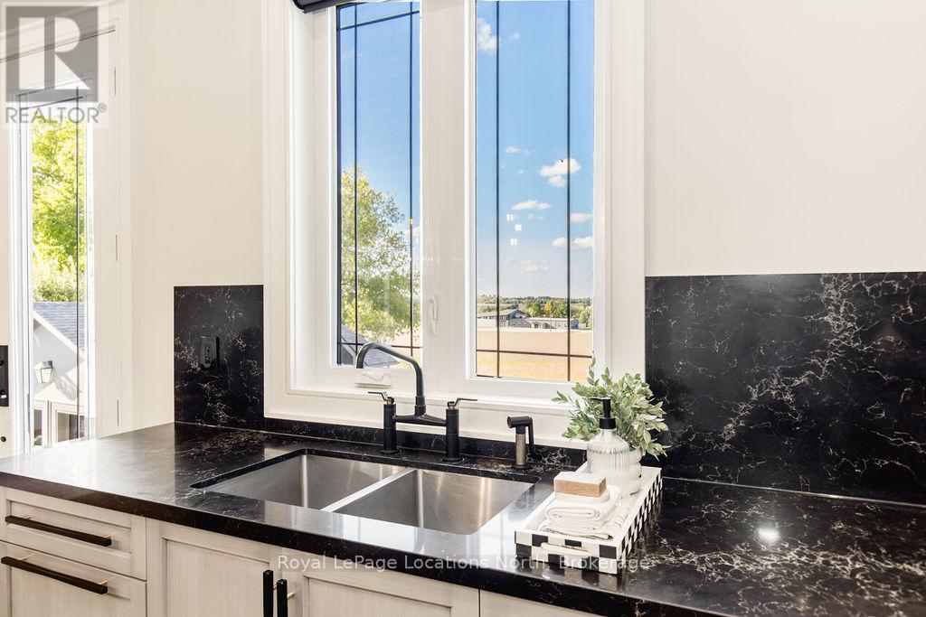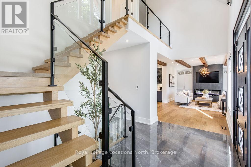 BACKS ONTO PROTECTED LAND. This stunning luxury home is situated on a quiet dead-end st, w/views of the countryside, + steps from park/rink/courts/library. This thoughtfully designed home offers an elegant, vibe, w/high end craftsmanship, featuring a stone + stucco exterior w/exceptional curb appeal. Upon entering, you are greeted by a grand entrance w/ heated porcelain tile floors, a custom wood staircase w/glass railing, + vaulted ceilings that create an inviting ambiance. The main level showcases engineered white oak flooring + exposed beam accents. The spacious living room offers custom-built cabinetry, a tiled feature wall with a built-in electric f/pl, + space for a TV. Adjacent is the elegant dining room, equipped w/ built-in cabinetry, dry bar, quartz counters, backsplash, +under-mount lighting perfect for entertaining. The family room flows directly from the dining room, offering a 2nd tiled wall w/ built-in electric f/pl, lg windows + seamless transition. The gourmet kitchen is classy, featuring an oversized island, quartz countertops, high-end s/s appliances, incl a gas range w/ a custom range hood + walk-in pantry. A private office w/views + a mud/laundry room w/heated tile floors, inside entry to garage w/ epoxy flrs + w/up from bsmt. 25 ft ceilings impress, flowing into 2nd flr w/white oak flooring that continues throughout, leading to the luxurious primary suite. This retreat incl access to private balcony, a walk-through clst w/ built-in organizers, + 6PC ensuite w/ dbl sinks, soaker tub, + large glass shower. Two additional bedrms each have their own 3PC bathrms w/ tiled showers + heated floors. The bsmt offers versatility, featuring expansive rec room + walk-out French doors leading to the patio, providing in-law potential. This bright space offers luxury plank flr, full kitchen, 2 bedrms, + a 3PC bathrm. Outside, enjoy an add. detached,heated 2-car garage w/ gas + water lines for future pool installation. (id:51158)