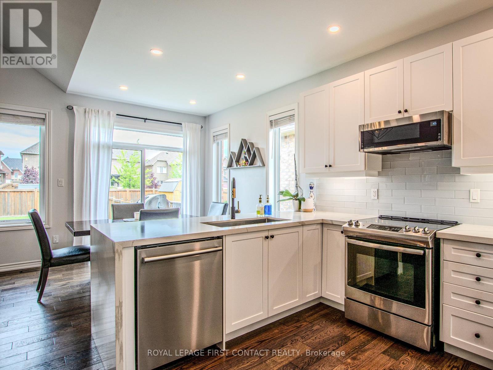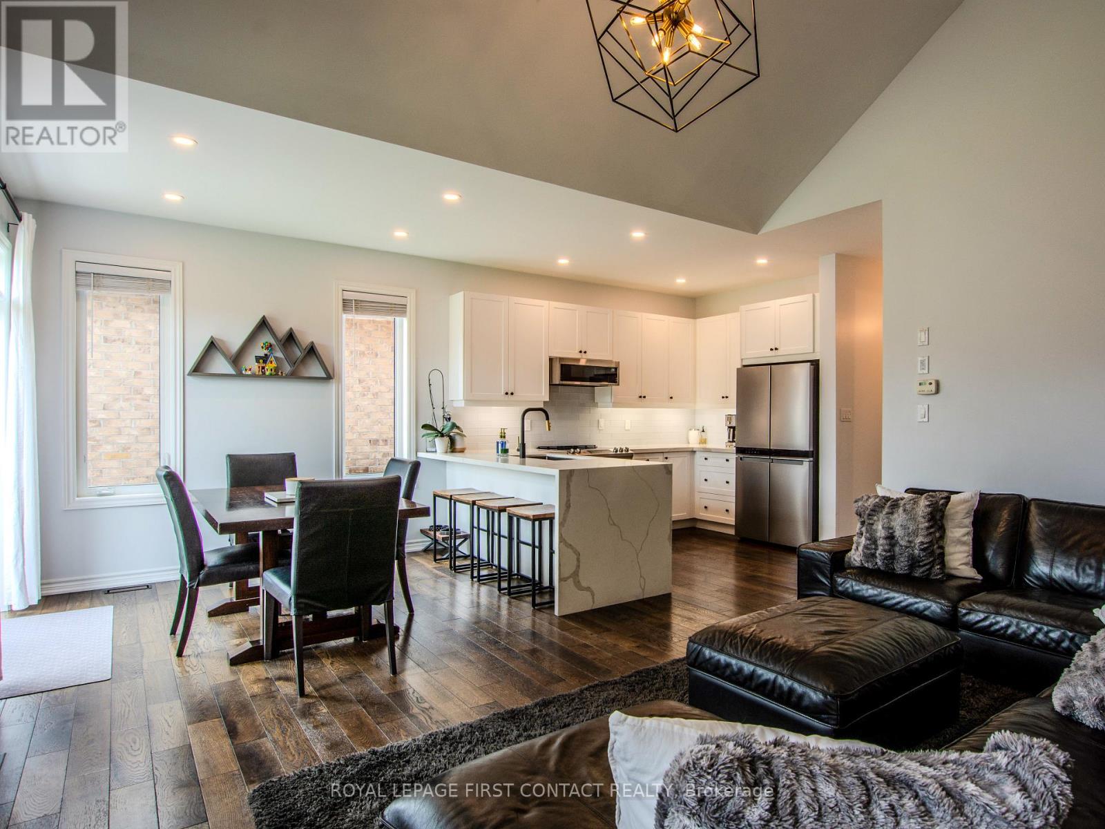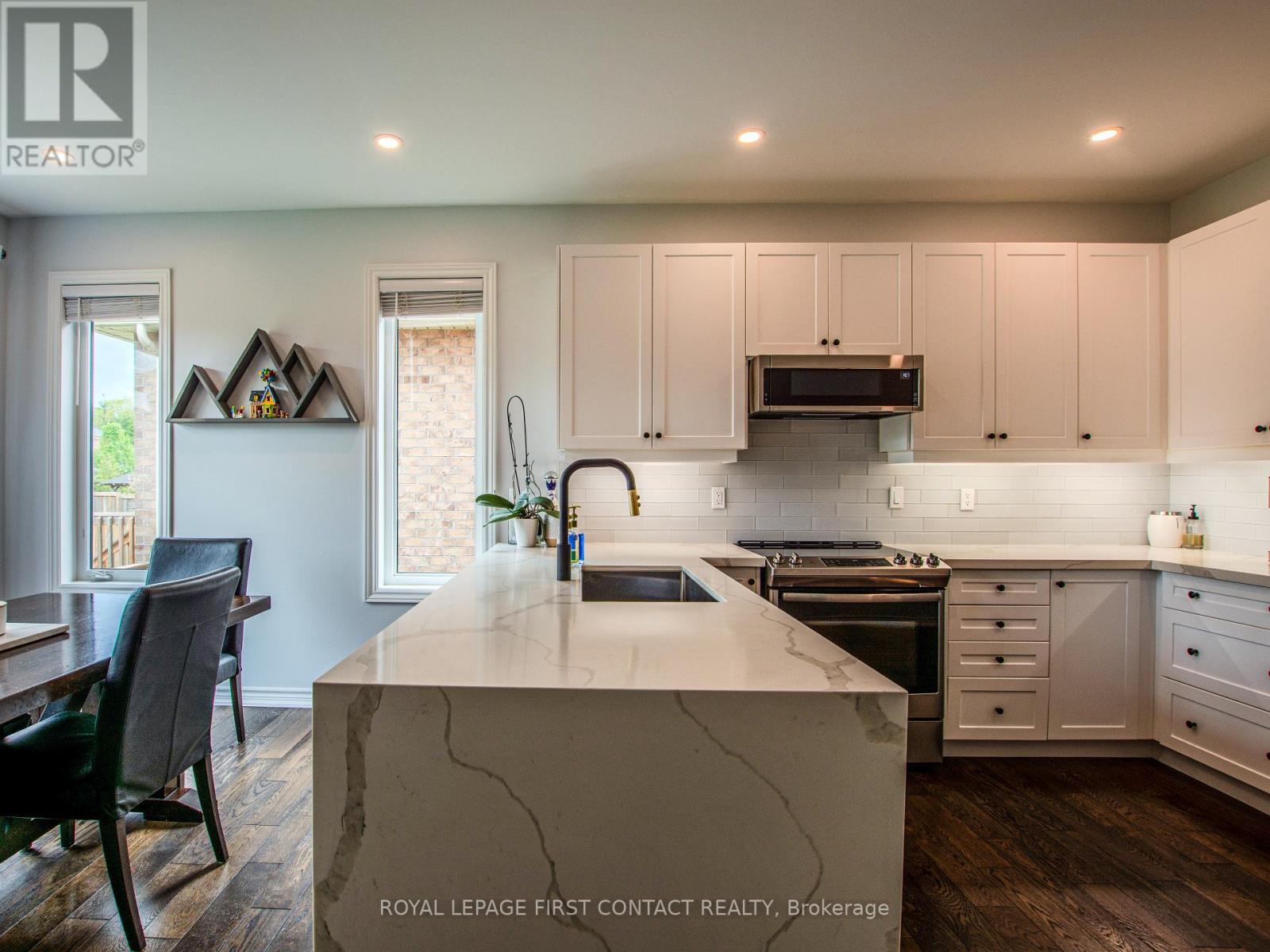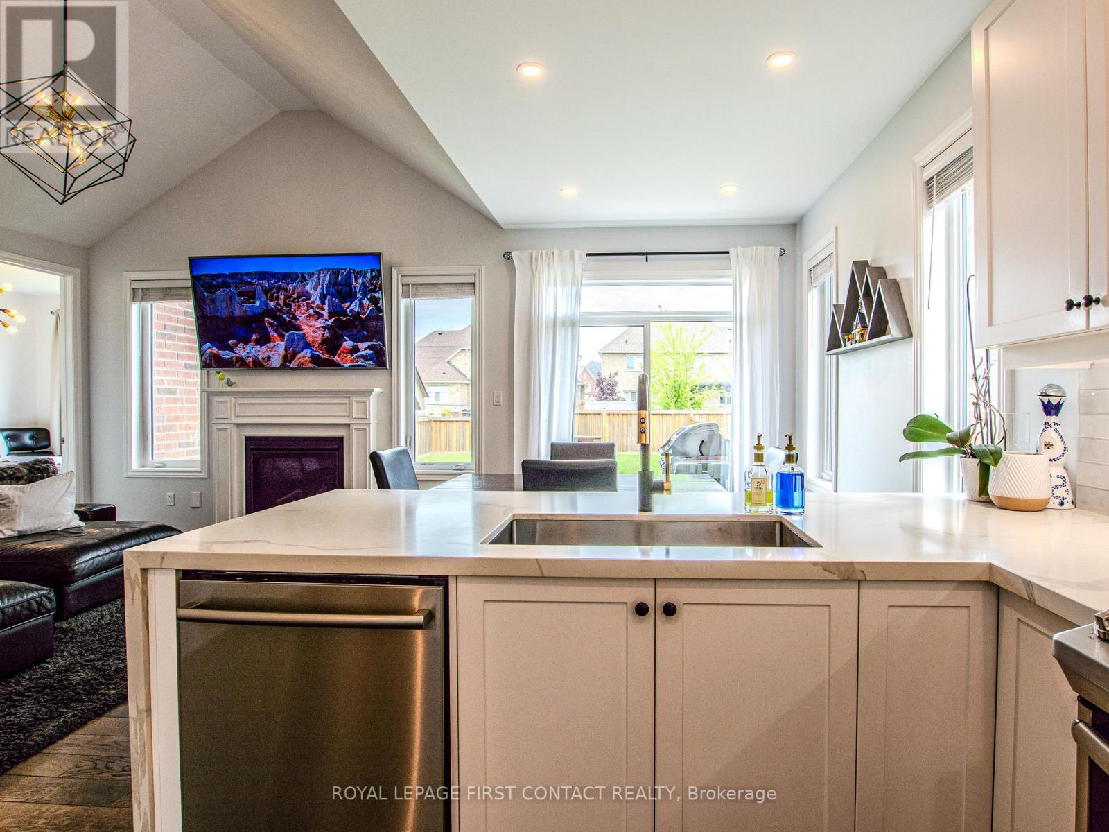 Welcome to this immaculate brick and stone bungalow offering comfort, space, and style in a truly family-oriented setting. With 3 bedrooms and 2 full baths, including a private primary suite complete with spa-like ensuite, this home delivers both everyday ease and a touch of luxury. The heart of the home is the open-concept kitchen, dining, and great room perfect for entertaining or cozy family time. Soaring vaulted ceilings, abundant natural light, and a warm gas fireplace create a welcoming atmosphere, while the kitchen impresses with crisp white cabinetry, quartz countertops with waterfall edge, and modern finishes. Enjoy the convenience of main floor laundry, a spacious double garage, and a fully fenced backyard that stretches over 147 feet deep, ideal for outdoor play or future landscaping dreams. Across the street, you'll find a park, playground, and serene forested space, adding to the peaceful, community-focused vibe. The partially finished basement features a large rec room and offers potential for an additional bedroom/bathroom suite and generous storage space. This is a home thats been lovingly maintained and thoughtfully designed for modern family living... move in and make it yours! (id:51158)