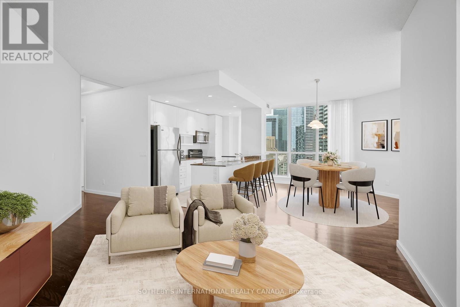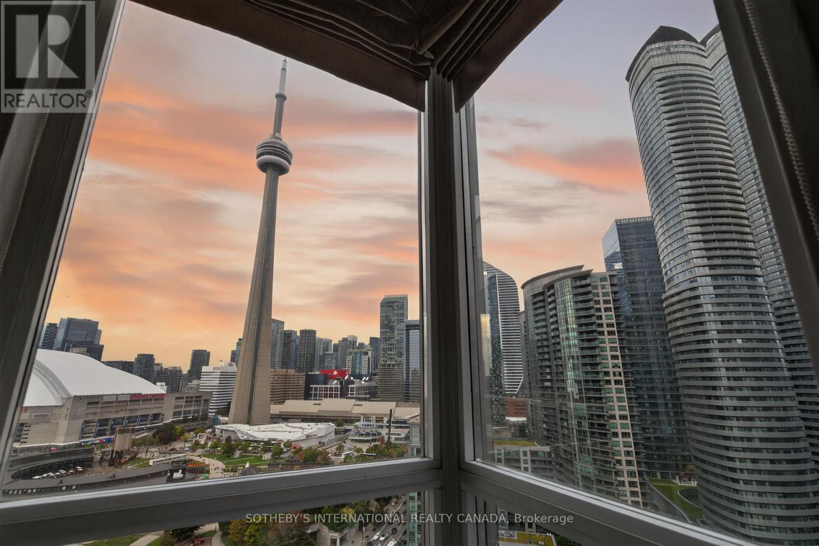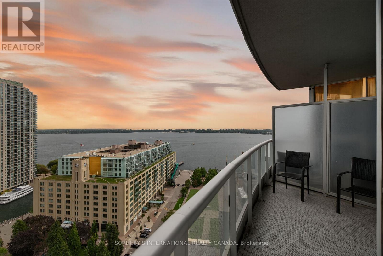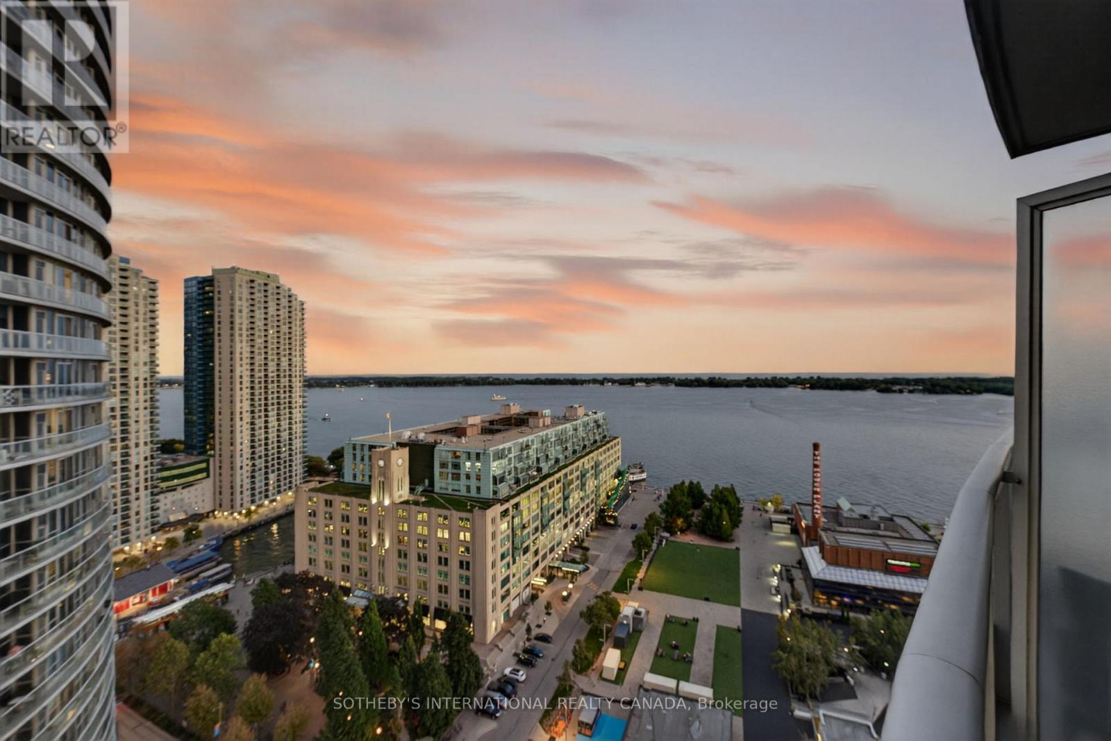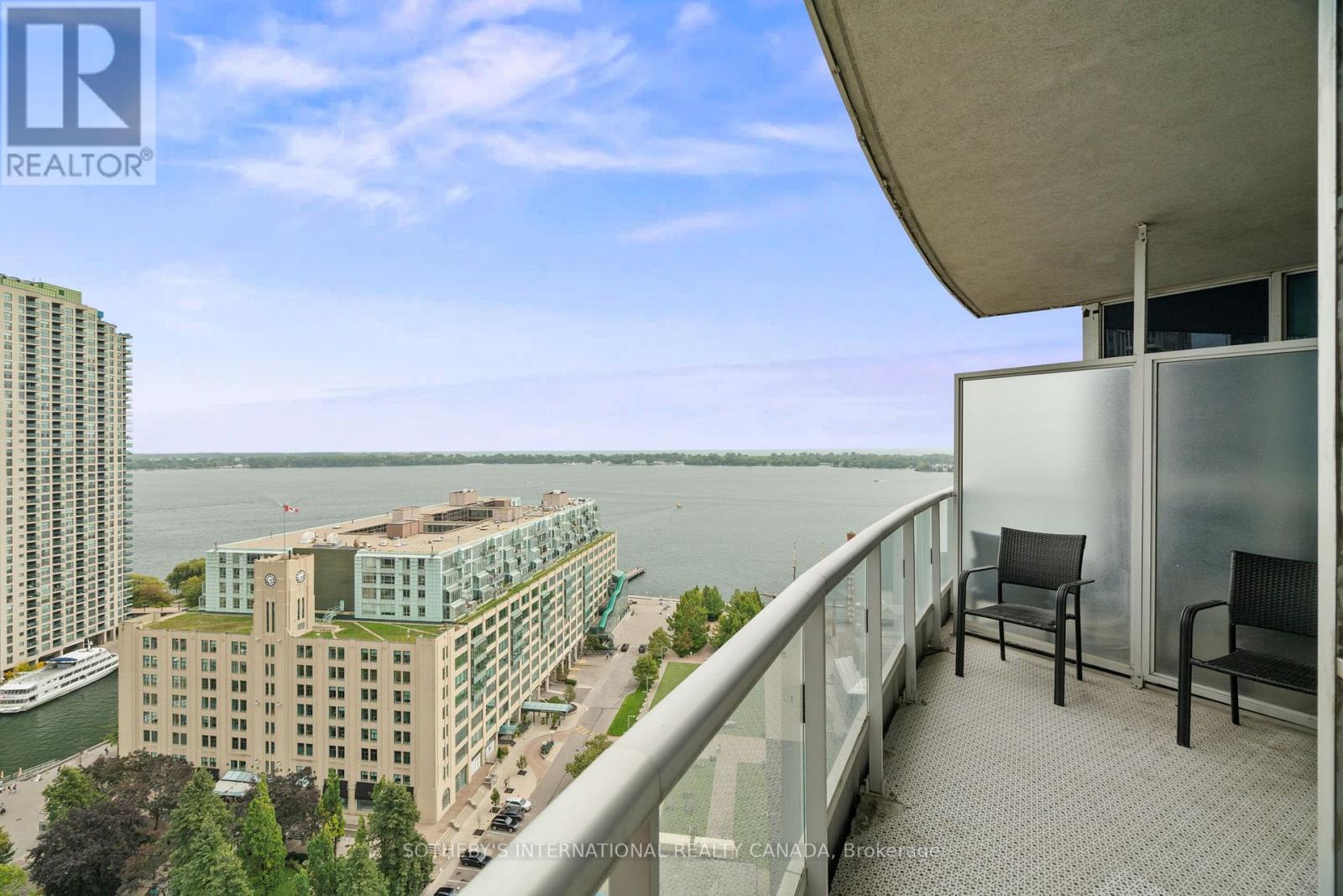 Welcome to Waterclub Condominiums - Toronto's premier waterfront address! This upgraded southeast corner suite was customized by the builder and features real hardwood floors, soaring 9 ft ceilings, and floor-to-ceiling windows that frame breathtaking views of Lake Ontario, the CN Tower, and Toronto's skyline. With approximately 1,200 sq. ft. of thoughtfully designed space, the open-concept layout is ideal for both everyday living and entertaining. The kitchen is appointed with granite counters, a breakfast bar, and ample cabinetry. The private primary suite offers a walk-in closet with custom organizers and a 4-piece ensuite, while the second bedroom also includes a generous walk-in closet and expansive windows. A welcoming foyer with a custom coat closet, convenient in-suite laundry, one parking space, and two lockers complete the home. Residents enjoy resort-style amenities including 24-hour concierge, indoor & outdoor pools, a fitness centre, sauna, guest suites, and BBQ terraces. The location is unmatched: walk across the street to Farm Boy for daily essentials, or stroll to the Financial District, Harbourfront Centre, Scotiabank Arena, Rogers Centre, parks, and the waterfront boardwalk. With Union Station, the PATH, TTC, and highway access just minutes away, this suite offers the ultimate downtown waterfront lifestyle. (id:51158)