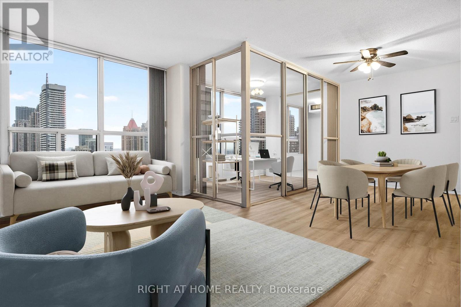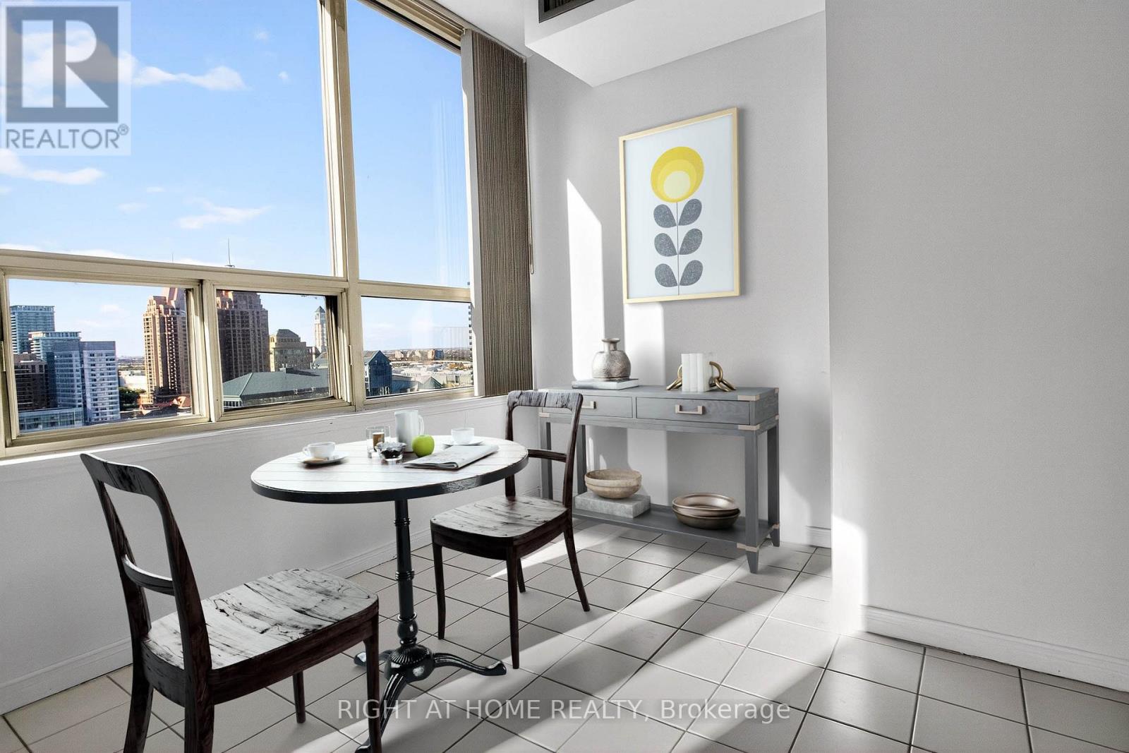 This stunning 1,275 Sq.Ft (per MPAC) corner unit condo in the heart of downtown Mississauga offers a bright and spacious split 2-bedroom layout plus a solarium/den, perfect for modern living. The open-concept living and dining room features a walkout to a beautiful balcony with incredible views, while the lovely kitchen boasts stainless steel appliances, quartz countertops, undermount sink and a cozy breakfast area. New Flooring in the Living / Dining & Solarium, plus the Bedrooms! The spacious primary bedroom includes a walk-in closet and a 5-piece ensuite with a separate shower, and the second bedroom offers a double closet with access to a 4-piece bath. Upgraded quartz counters in the baths. With lots of storage, an ensuite laundry with front-loading machines. *** Bonus 2 tandem parking spots that fits 4 cars, plus a locker. *** Residents can enjoy the well-maintained buildings amenities, including a gym, indoor pool, sauna, party room, billiard room, squash and racquetball courts, a tennis court, and beautifully landscaped grounds with plenty of visitor parking. Ideally located steps from Square One, Celebration Square, the library, shopping, transit, entertainment, and major highways, this condo is an absolute must see, with heat, hydro, and water included in the maintenance fees. ** Digitally staged for illustration purposes only.** (id:51158)