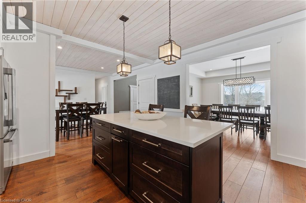 This stunning 5-bedroom, 2.5-bathroom home spans over an energy efficient 3,800+sq/ft and is perfectly positioned to overlook the breathtaking Grand River. Nestled on a generous lot overlooking rolling fields at the back and river access just across the street, it’s an ideal setting for those who love the outdoors. Adding to its appeal, a massive 100’ x 40’ detached shop provides endless possibilities for hobbies, storage, or business use (w/ high speed fibre internet). The main floor boasts a spacious and inviting layout with 9ft ceilings, featuring a custom kitchen with a wood-paneled ceiling, stone countertops, a stylish herringbone backsplash, and a large island—perfect for gathering with family and friends. The adjacent dining room, with its tray ceiling and wood accent wall, offers picturesque views of the Grand River. The oversized great room is a true showstopper, complete with a floor-to-ceiling stone fireplace, vaulted ceiling, and expansive windows that frame stunning views in every direction. Step through one of two patio doors to your private outdoor oasis, featuring a large covered patio and built-in outdoor kitchen, ideal for entertaining. On one elevated side of the home, the primary suite offers a peaceful escape with a walk-in closet and a luxurious ensuite, complete with a custom tile shower. The second level hosts four additional bedrooms and a full 4-piece bathroom. The versatile basement offers even more potential, with its own private entrance from the attached double garage, making it an excellent option for an in-law suite or additional living space. For those needing extra room for vehicles, equipment, or recreational toys, this property delivers! The huge concrete parking area and driveway ensure ample outdoor storage/parking for vehicles/trailers. Don’t miss this rare opportunity to own a spectacular home in a prime location with endless possibilities! Luxury Certified. (id:51158)