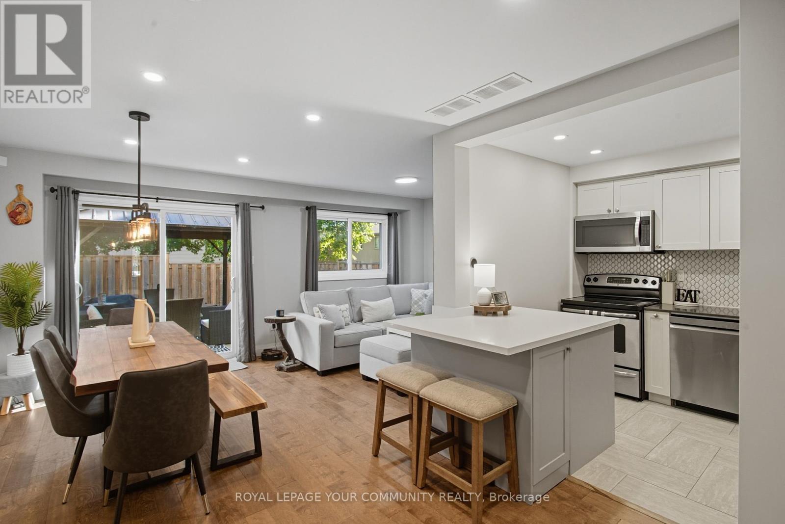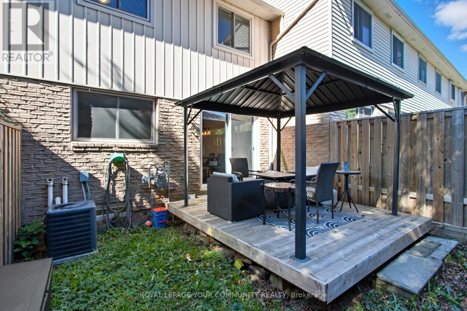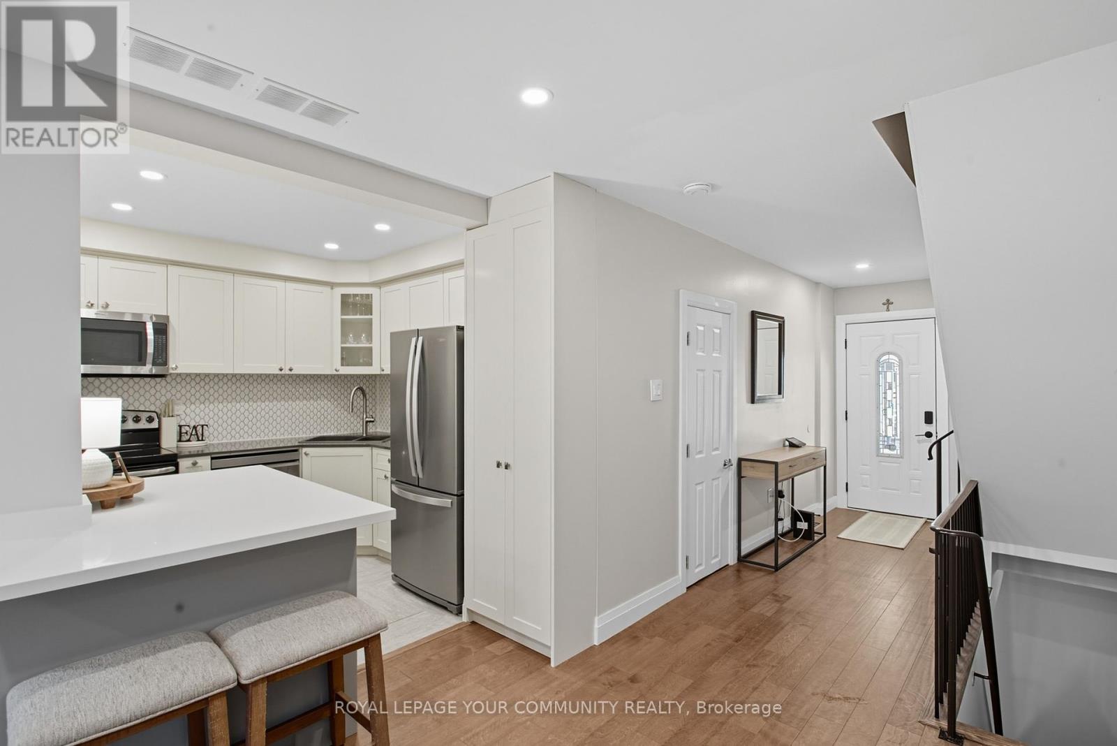 Nestled in the desirable Falgarwood neighbourhood, backing onto greenspace, this fully renovated (App $70,000) 3 bed, 4 bathroom condo townhome offers a great opportunity for young families, downsizers, or anyone eager to find a turnkey home in a fantastic location. As you step inside, you're welcomed by a beautifully updated interior that boasts fresh, contemporary finishes throughout. The main level offers an open concept layout with a sleek, new kitchen equipped with a large centre island. Beautifully Updated and Renovated W 2 (4pc) bathrooms in the 2nd floor, 1 (2pc) washroom in the main floor, and 1 (2pc) washroom in the basement. Main floor boasting an inviting open-concept living/dining and kitchen area. Custom kitchen, hardwood floors, pot lights. Master bedroom with ensuite bathroom and large closet. Two large size bedrooms with a sharing 4pc bathroom. Walk out from the living room to a nice fenced backyard overlooking a green area. Furnace, Central A/C, Windows, doors and stairs are 7 years old. Located in the Iroquois Ridge High School area, far from main roads and noise, close to many parks, walking trails, amenities, shopping, restaurants and easy access to highways. A must see!. (id:51158)