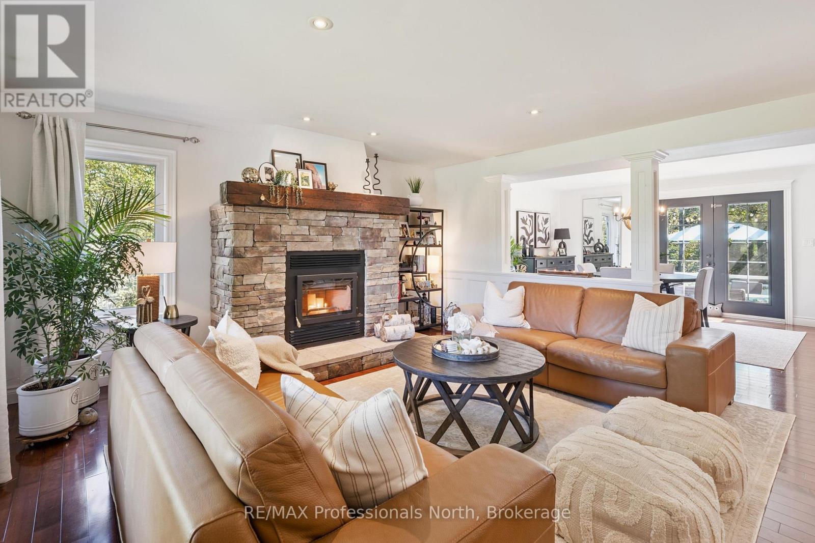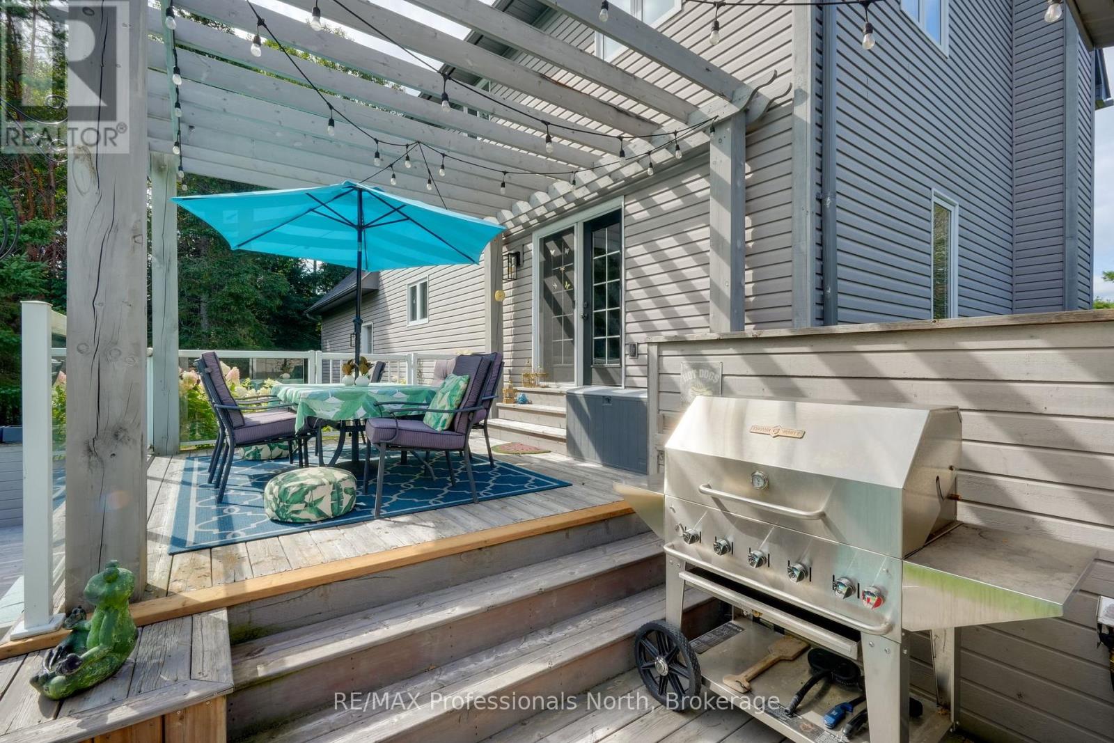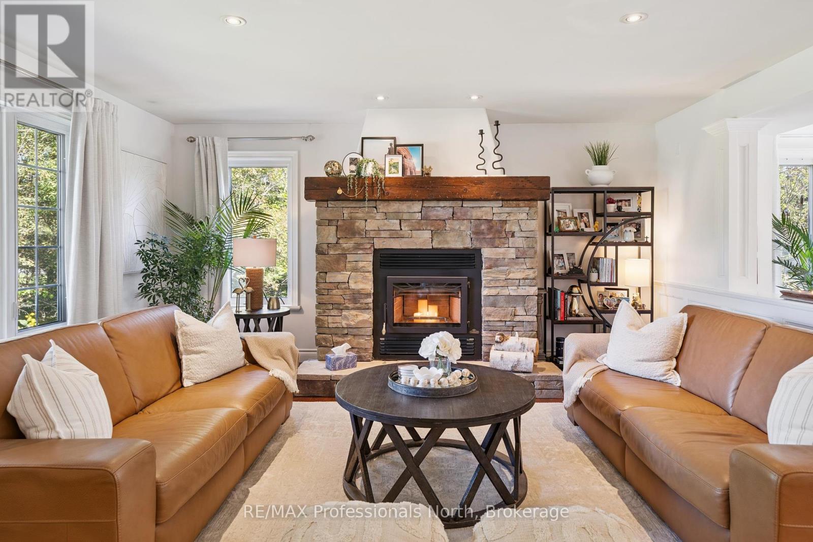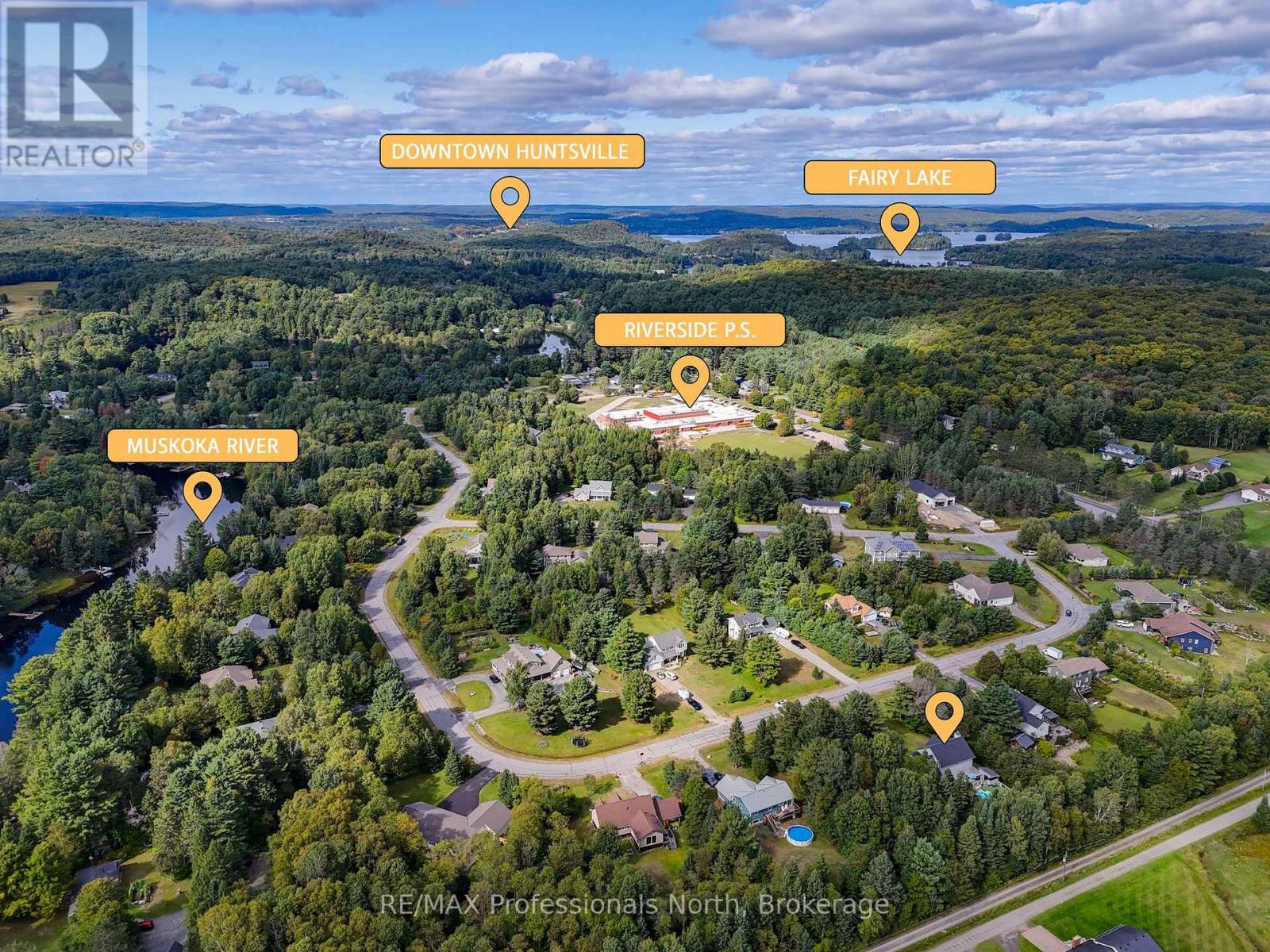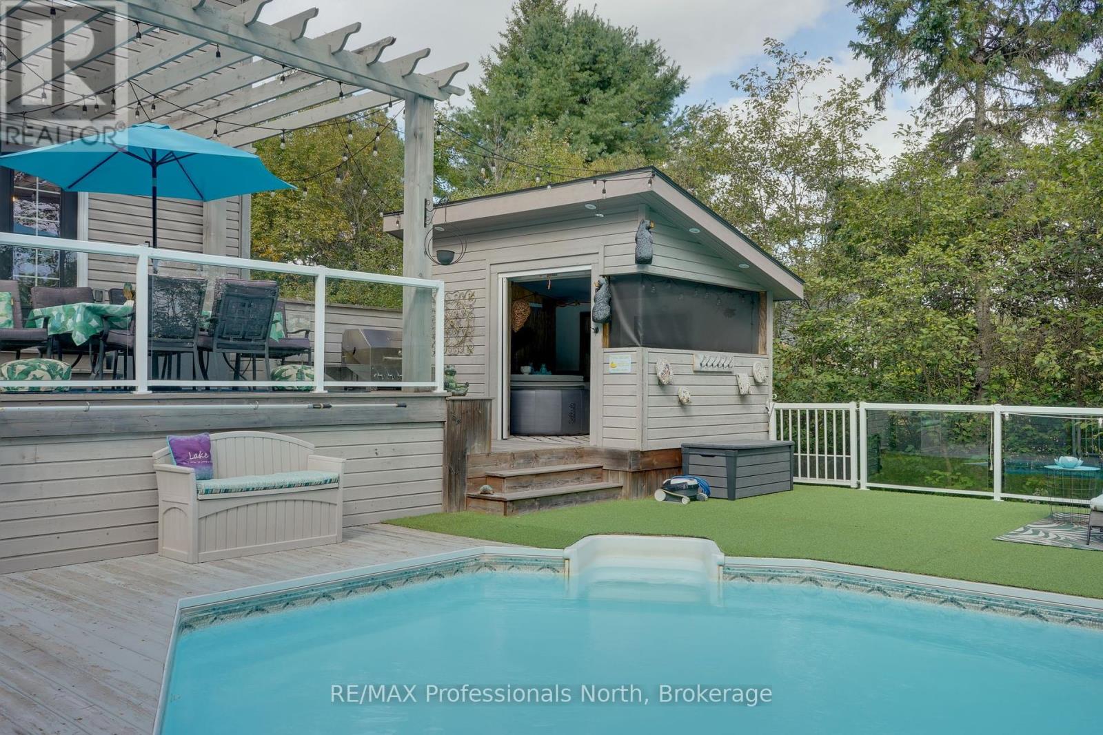 Welcome to Riverview Estates one of Huntsvilles most sought-after neighbourhoods, just minutes from downtown. Nestled alongside the Muskoka River, which connects Fairy Lake and Mary Lake, this community offers both convenience and a true Muskoka lifestyle. This charming two-storey, four-bedroom, four-bathroom home has been lovingly maintained and thoughtfully updated. A granite stone walkway leads to a spacious front porch the perfect spot for your morning coffee or evening unwind while watching deer wander by. Inside, the open-concept living and dining area is anchored by a stunning stone, wood-burning fireplace and hardwood flooring. The large kitchen is a true centerpiece, featuring brand-new quartz countertops, backsplash, and an island, gas oven and tons of storage and counter space. It overlooks a portion of the wooded backyard, bringing nature right into your cooking and dining experience. Upstairs, you'll find three generous bedrooms, including a primary suite with ensuite bath - double sinks, plus an updated four-piece bathroom. All bathrooms have been refreshed with new flooring, vanities, countertops, sinks, and light fixtures. A brand-new finished basement adds even more living space, including a large recreation room, office area, bedroom, and full three-piece bathroom. Over the garage, a bonus recreation room with a cozy gas furnace, endless possibilities here for movie nights, playroom, or home office. Step outside to your private backyard oasis, featuring a pool with a brand-new heater, large deck, and screened-in shed ideal for entertaining or relaxing in total privacy. The sellers have invested in numerous upgrades for peace of mind, including: Hot water on demand Generac system (2024)New A/C (2023)New roof Brand-new pool heater Riverview Estates is a family- and pet-friendly neighbourhood with flat streets perfect for walking and biking, nearby boat launches, and 50 acres of hiking trails just across from Riverside Public School. (id:51158)