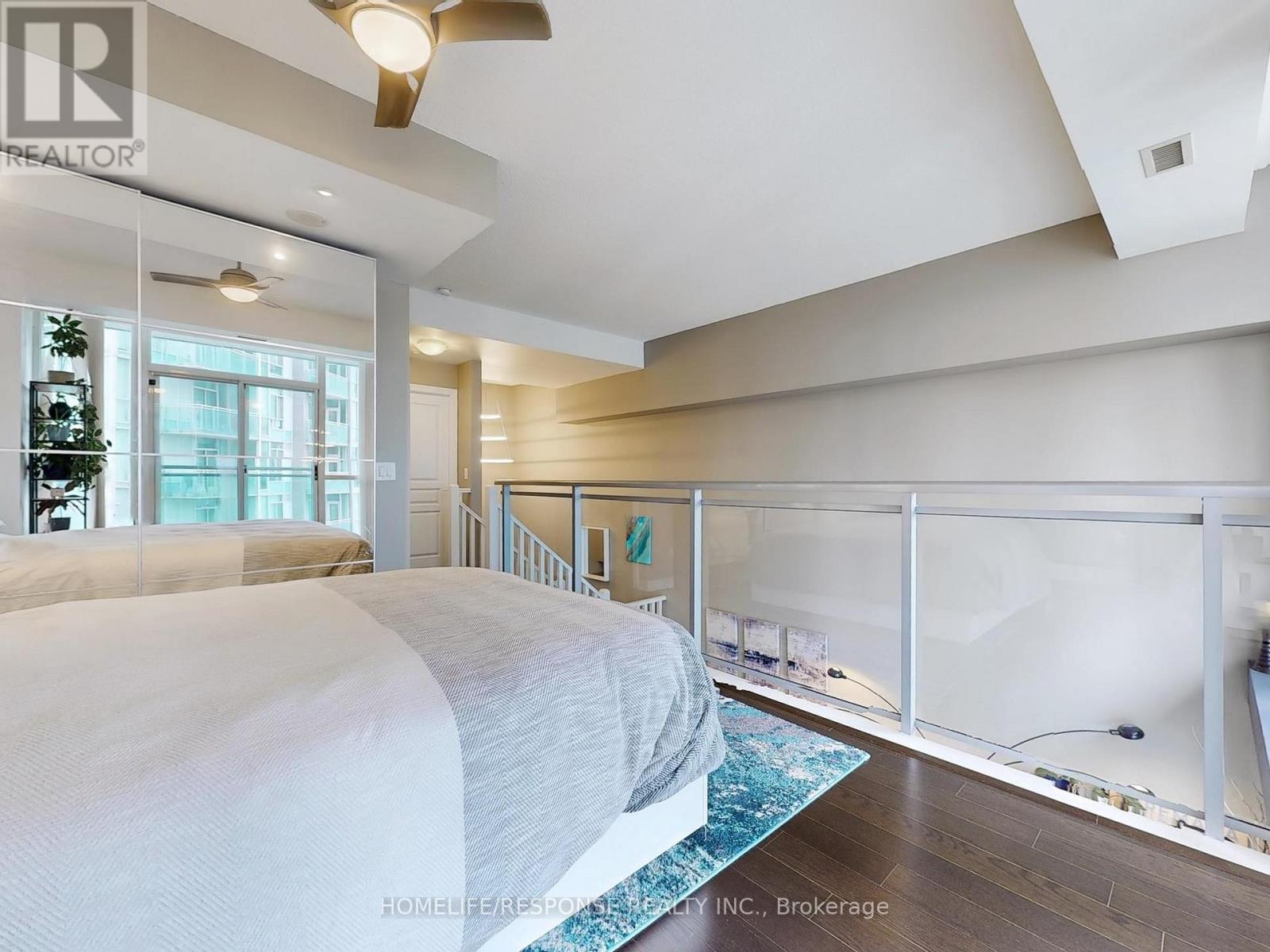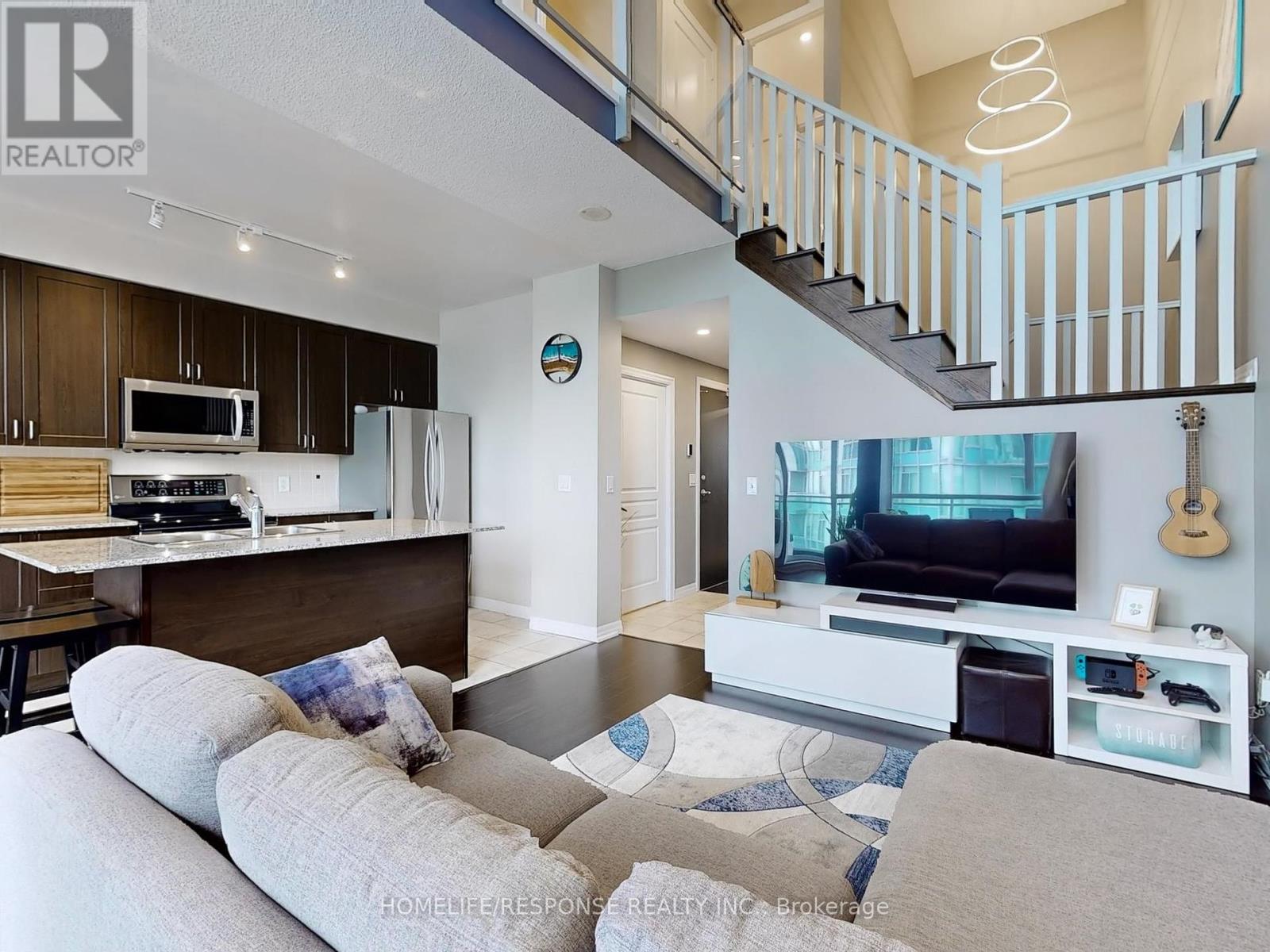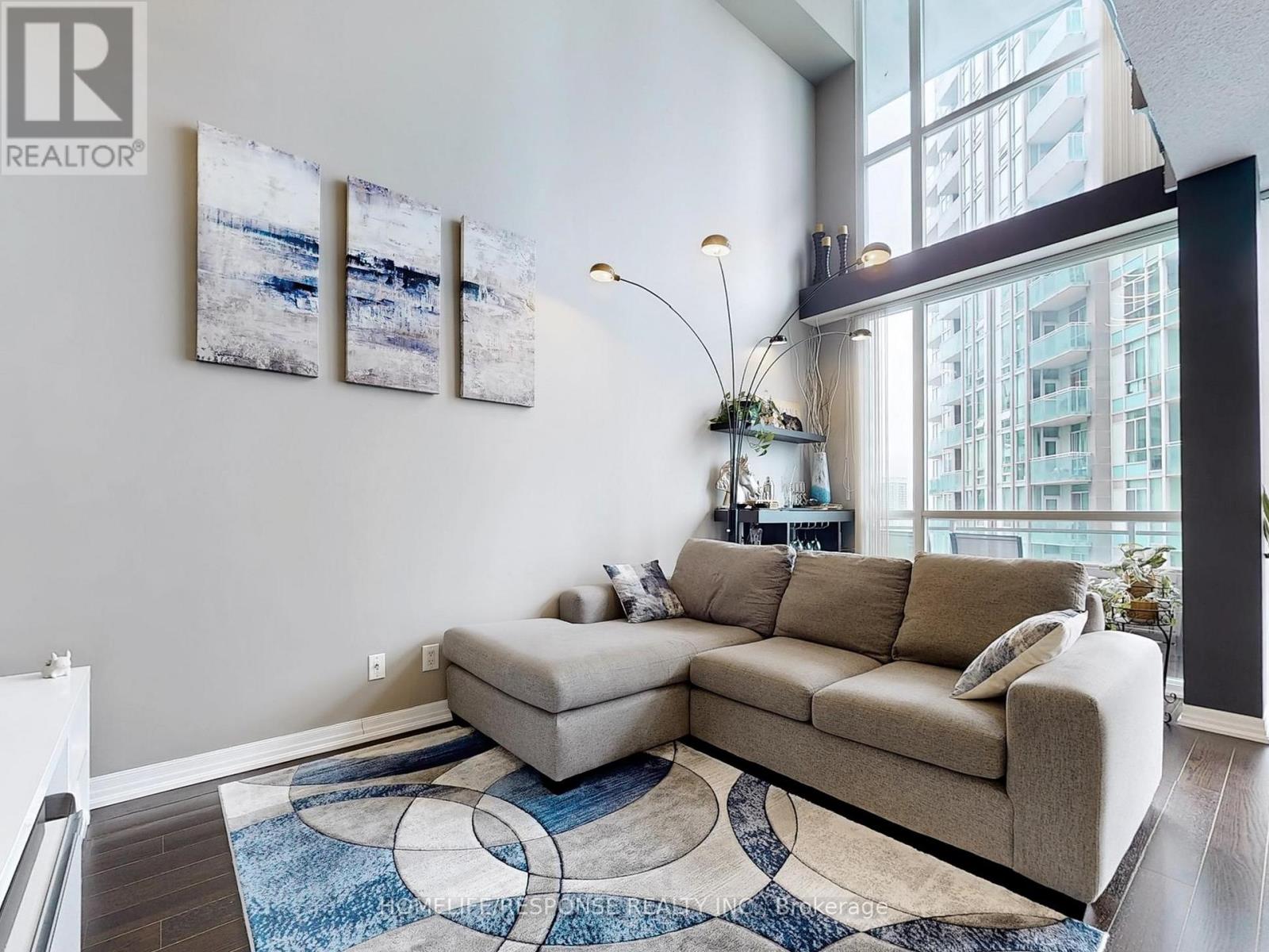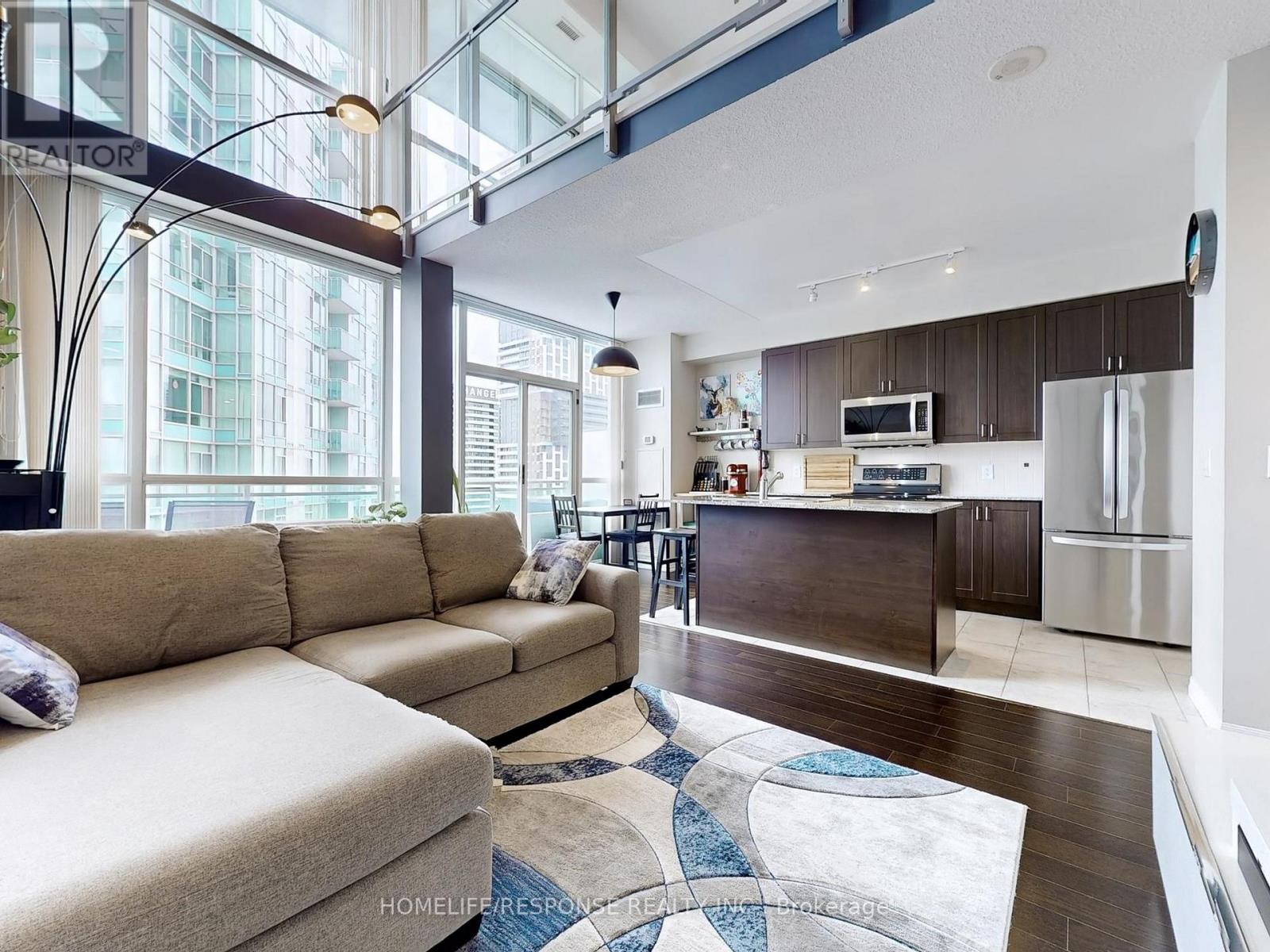 Dreams Really Do Come True! This one-of-a-kind, modern two-storey loft in the upscale Onyx building offers over 800 sq ft of luxurious living in the heart of downtown Mississauga. Featuring a gorgeous upgraded kitchen with stainless steel appliances, granite counters, and a center island, its perfect for entertaining. The bright, open-concept design boasts soaring 18-foot floor-to-ceiling windows that flood the space with natural light, a spacious living and dining area, and a large balcony with breathtaking panoramic views of Mississauga and Celebration Square an ideal spot to watch fireworks! This beautifully designed loft includes 1 bedroom + den, 2 bathrooms, a large closet, and a 4-piece ensuite. The versatile den is perfect for a home office or nursery. Residents enjoy unbeatable convenience with steps to grocery stores, medical care, Sheridan college, YMCA, Library, top restaurants, entertainment, Square One Mall, walking distance to tennis/soccer fields and easy access to buses, the QEW, 401/403, and Cooksville GO station all just minutes away. Next to Kariya park with cherry blossoms in spring. Experience refined urban living in one of Mississauga's most sought-after addresses! 2 Parking. Amenities Include: 24 Hour Concierge! Guest Parking! Rooftop Patio! Fitness Centre! Yoga Room, Indoor Pool, Hot Tub! (id:51158)