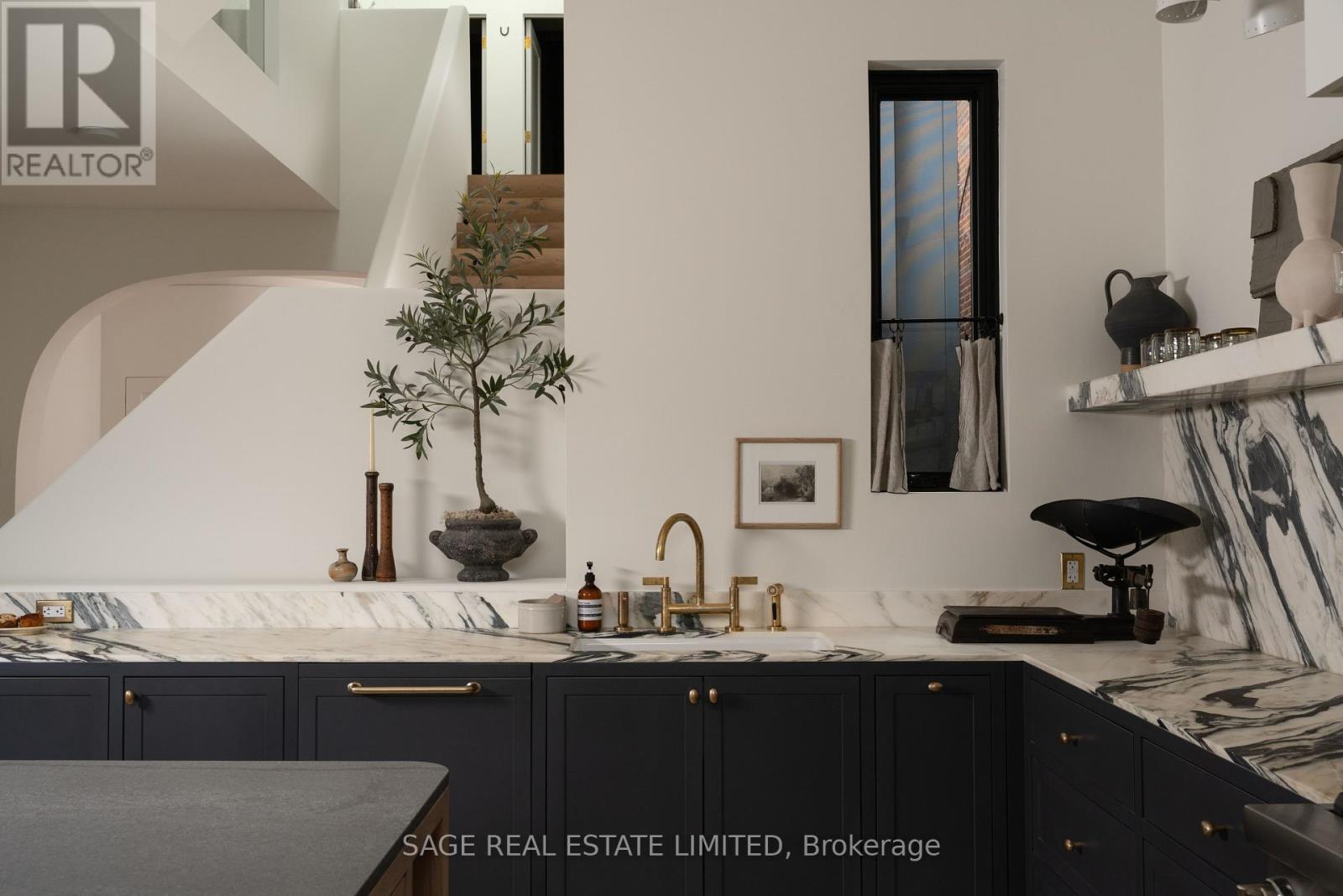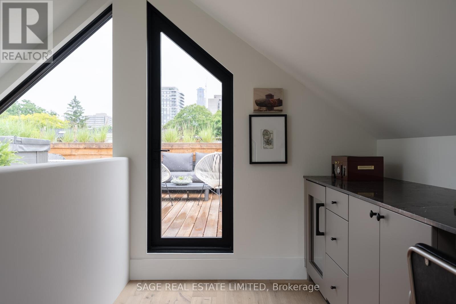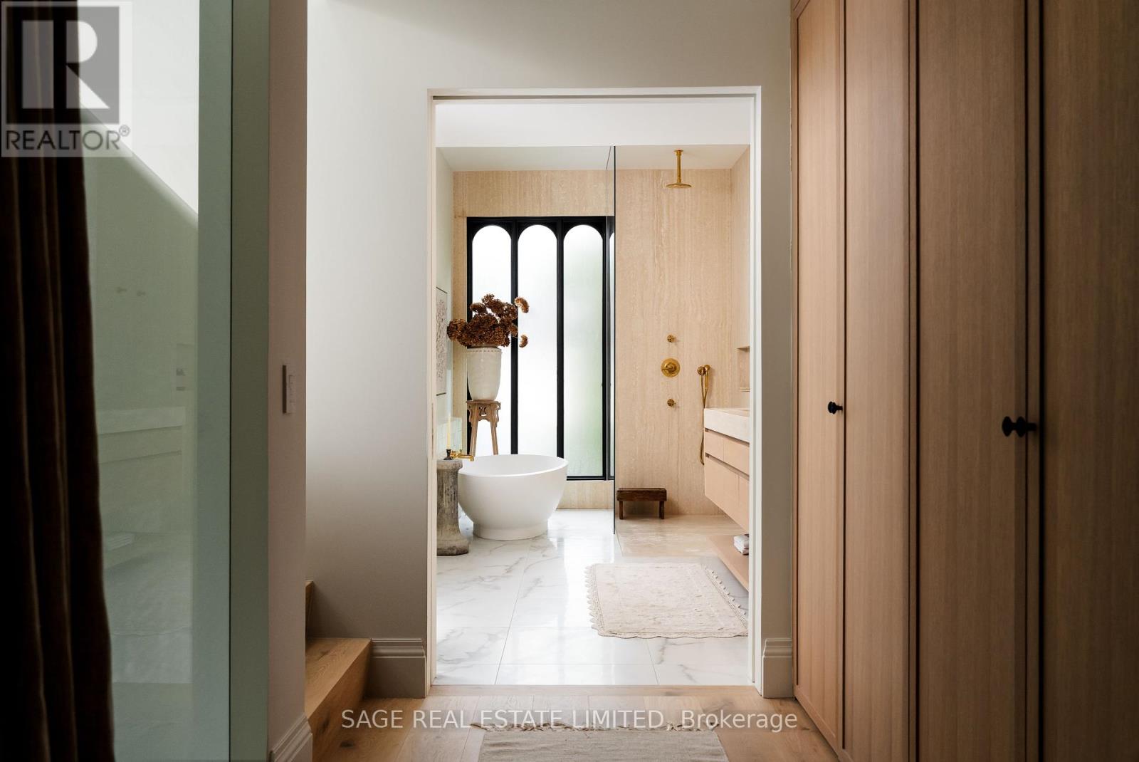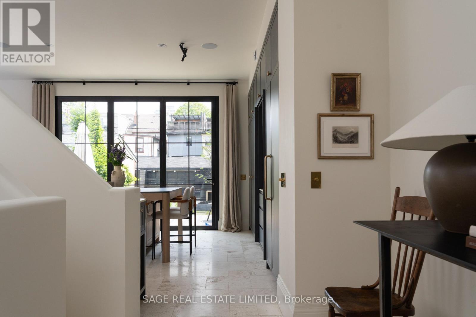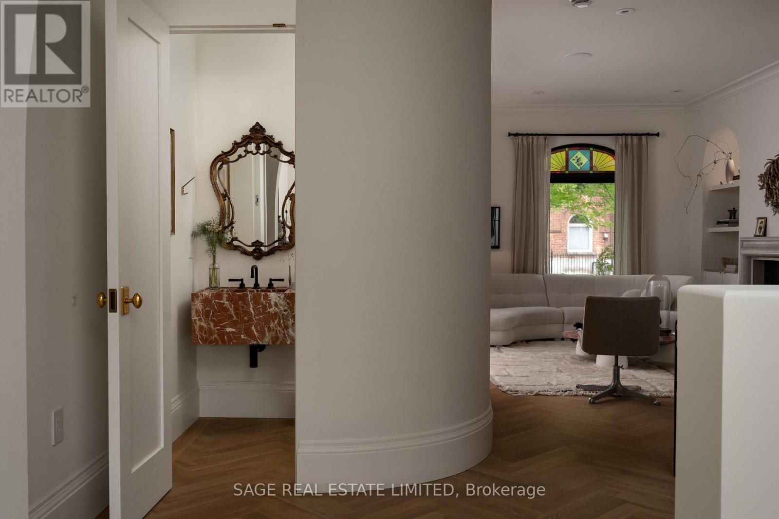 THE BOLD AND THE BORDEN. Absolute heart-stopper in the Annex with every single thing you thought of and things you hadn't even considered needing until this very second (keep reading). Designed by interior designer and homeowner, Lyndsay Jacobs Interior, this home is a gorgeous collision of design, function, soul and craftsmanship. Standout features include: meticulously restored 1878 stained glass windows, Canadian limestone fireplace mantle with gas insert, exposed brick, custom millwork throughout and soft curved walls that gently guide you through the space. Natural light pours in from 10-foot bi-fold kitchen windows/doors highlighting abundant custom cabinetry and a 17-foot floating Nero Borghini marble shelf. Built-in column fridge/freezer set up keeps things sleek, with under-counter refrigeration and prep sink offering daily luxury and professional level functionality. Skylights draw your eyes up through a four storey staircase by Ultrastairs, leading to serene, peaceful bedroom quarters where the outside world disappears and offers you a deep exhale from the chaotic energy of the day. Bathrooms feature unlacquered brass plumbing fixtures from Watermark, Waterworks and Kallista. And then there's the rooftop: a private, treetop-view sanctuary with a saltwater Arctic Spa hot tub, beverage station, natural gas fire pit hookup and pure Toronto magic in all four seasons.The lower level includes a custom media room designed by Bay Bloor Radio, with in-wall Bowers & Wilkins surround sound. Other lower level features include a 400-bottle, climate controlled wine cellar, a dog wash and a fully contained in-law suite. Perilously perfect location sandwiched between the fab restaurant scenes on Harbord and in Yorkville and a quick skip to Ossington. Boldly go to Borden. A winner in every single way. (id:51158)