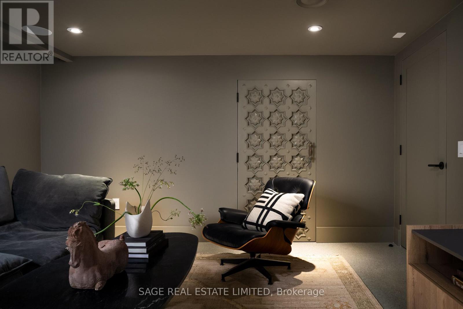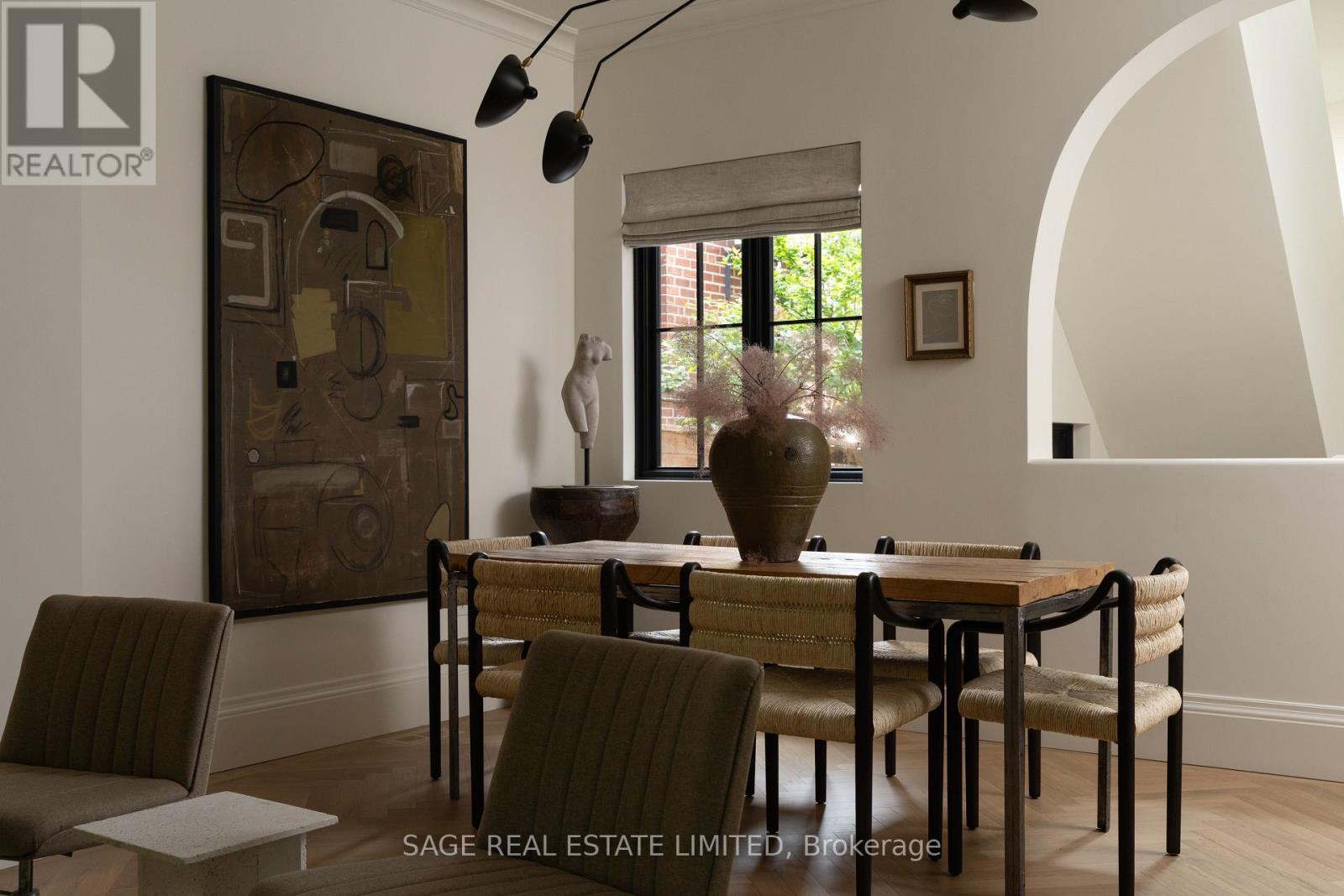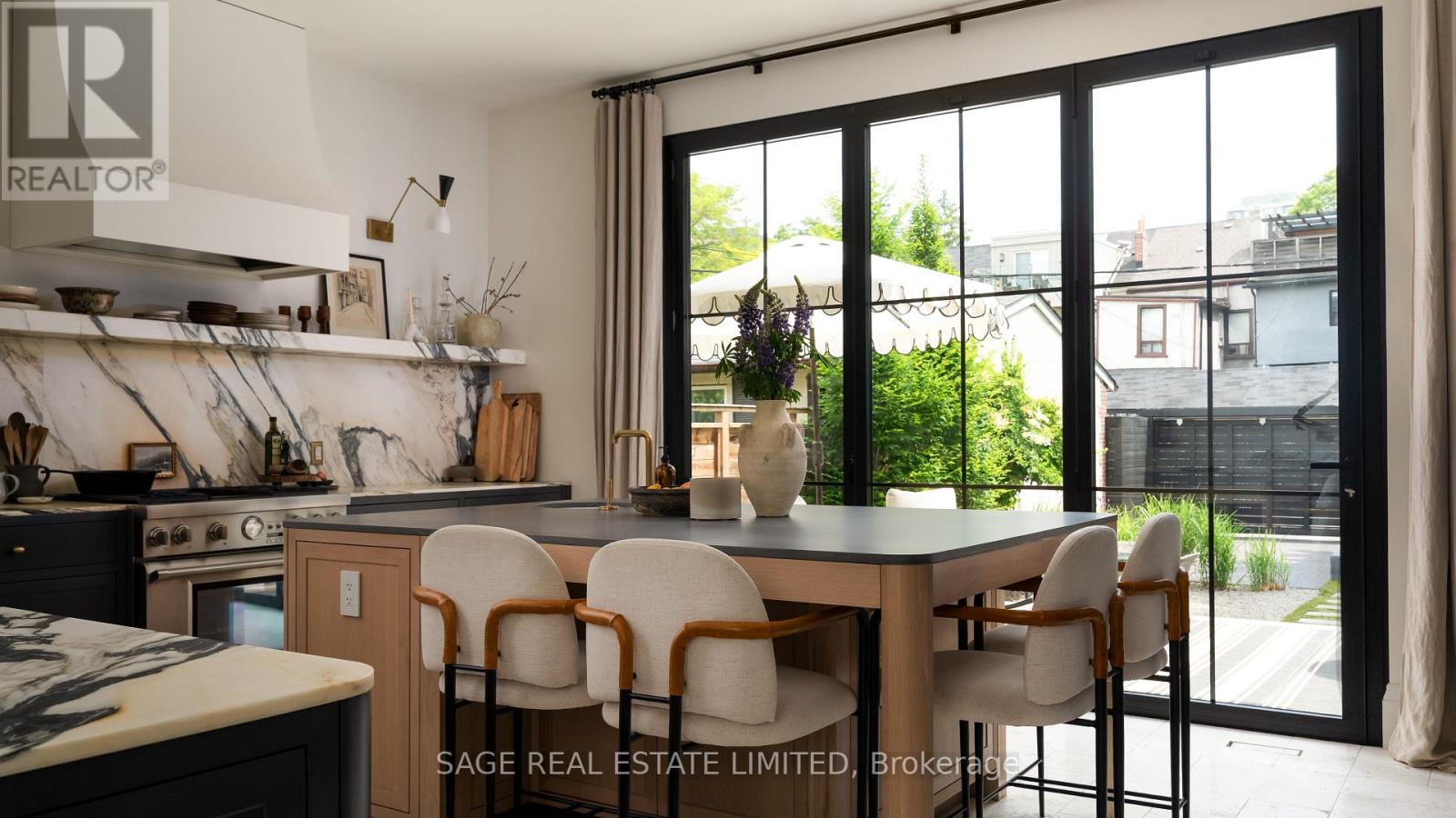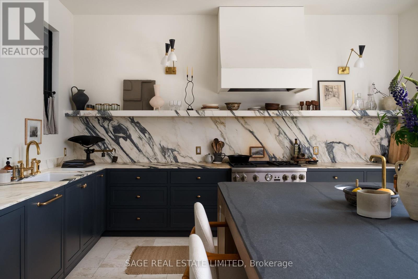 THE BOLD AND THE BORDEN. Absolute heart-stopper in the Annex with every single thing you thought of and things you hadn't even considered needing until this very second (keep reading). Designed by interior designer and homeowner, Lyndsay Jacobs Interior, this home is a gorgeous collision of design, function, soul and craftsmanship. Standout features include: meticulously restored 1878 stained glass windows, Canadian limestone fireplace mantle with gas insert, exposed brick, custom millwork throughout and soft curved walls that gently guide you through the space. Natural light pours in from 10-foot bi-fold kitchen windows/doors highlighting abundant custom cabinetry and a 17-foot floating Nero Borghini marble shelf. Built-in column fridge/freezer set up keeps things sleek, with under-counter refrigeration and prep sink offering daily luxury and professional level functionality. Skylights draw your eyes up through a four storey staircase by Ultrastairs, leading to serene, peaceful bedroom quarters where the outside world disappears and offers you a deep exhale from the chaotic energy of the day. Bathrooms feature unlacquered brass plumbing fixtures from Watermark, Waterworks and Kallista. And then there's the rooftop: a private, treetop-view sanctuary with a saltwater Arctic Spa hot tub, beverage station, natural gas fire pit hookup and pure Toronto magic in all four seasons.The lower level includes a custom media room designed by Bay Bloor Radio, with in-wall Bowers & Wilkins surround sound. Other lower level features include a 400-bottle, climate controlled wine cellar, a dog wash and a fully contained in-law suite. Perilously perfect location sandwiched between the fab restaurant scenes on Harbord and in Yorkville and a quick skip to Ossington. Boldly go to Borden. A winner in every single way. (id:51158)