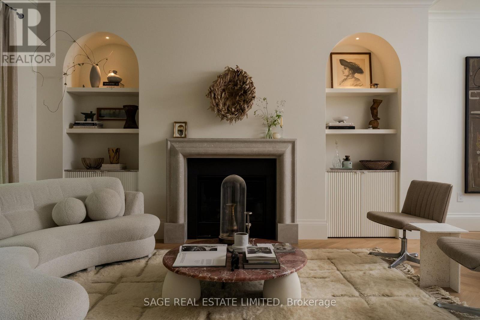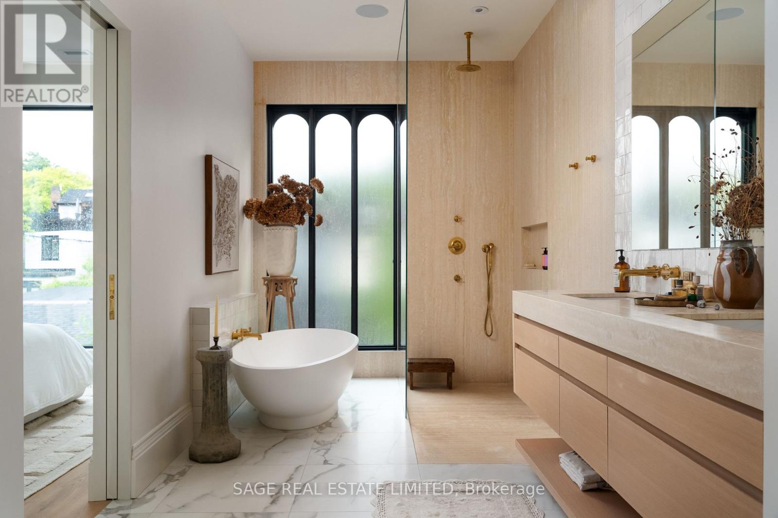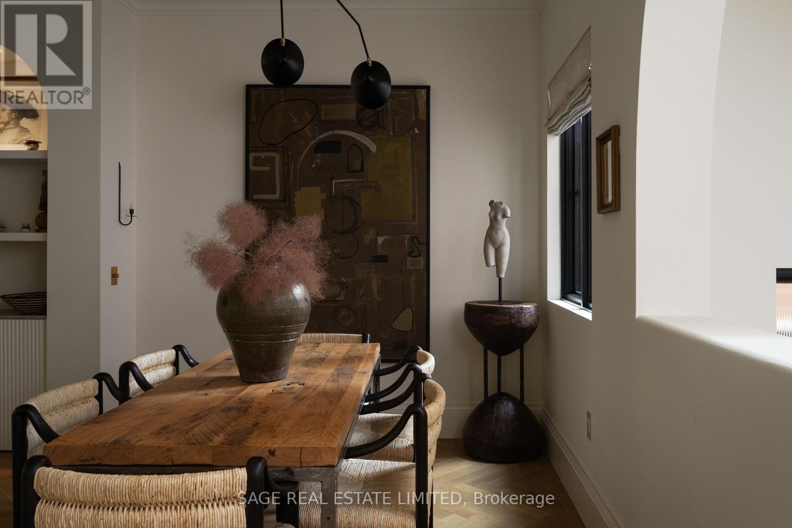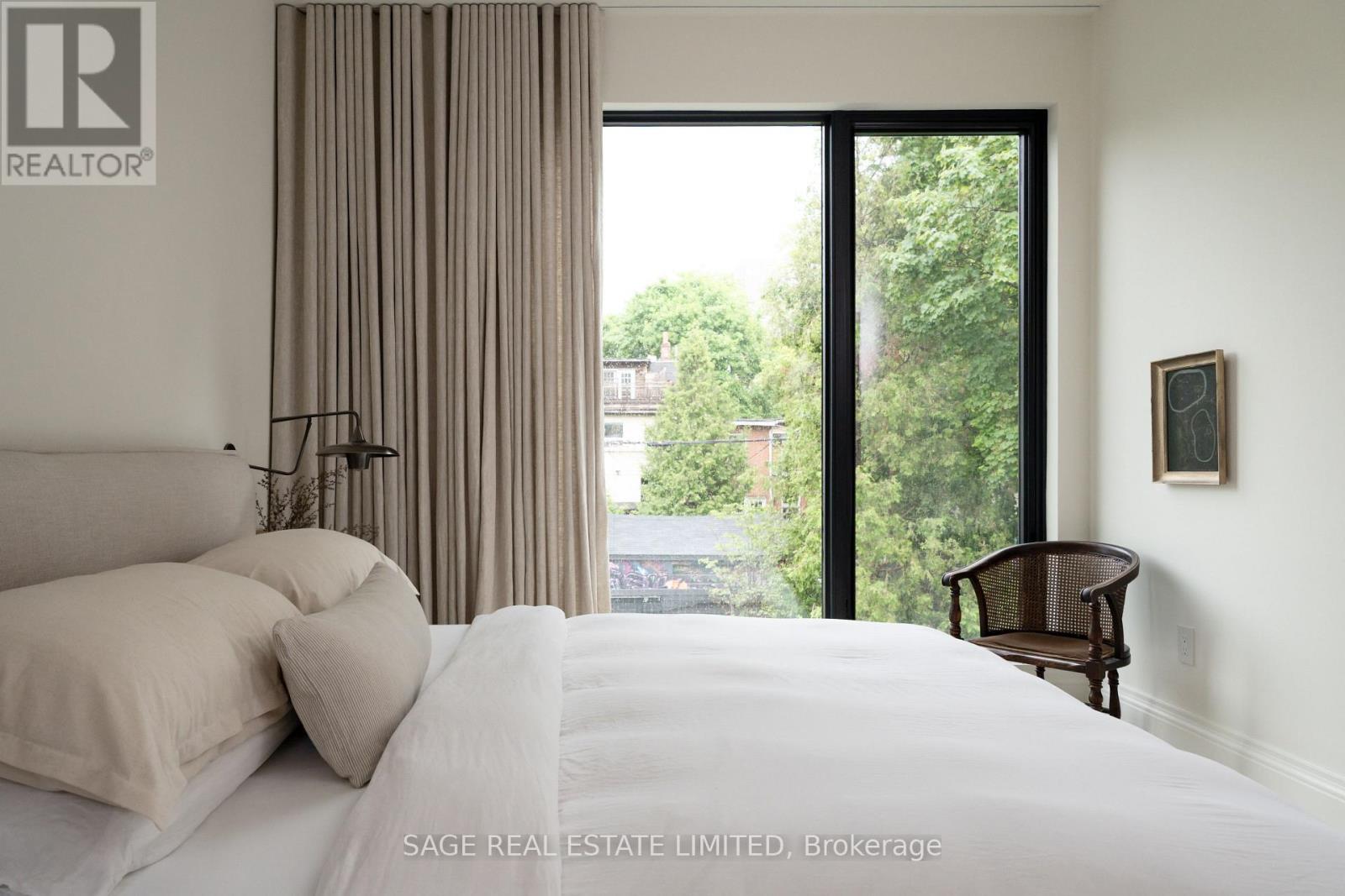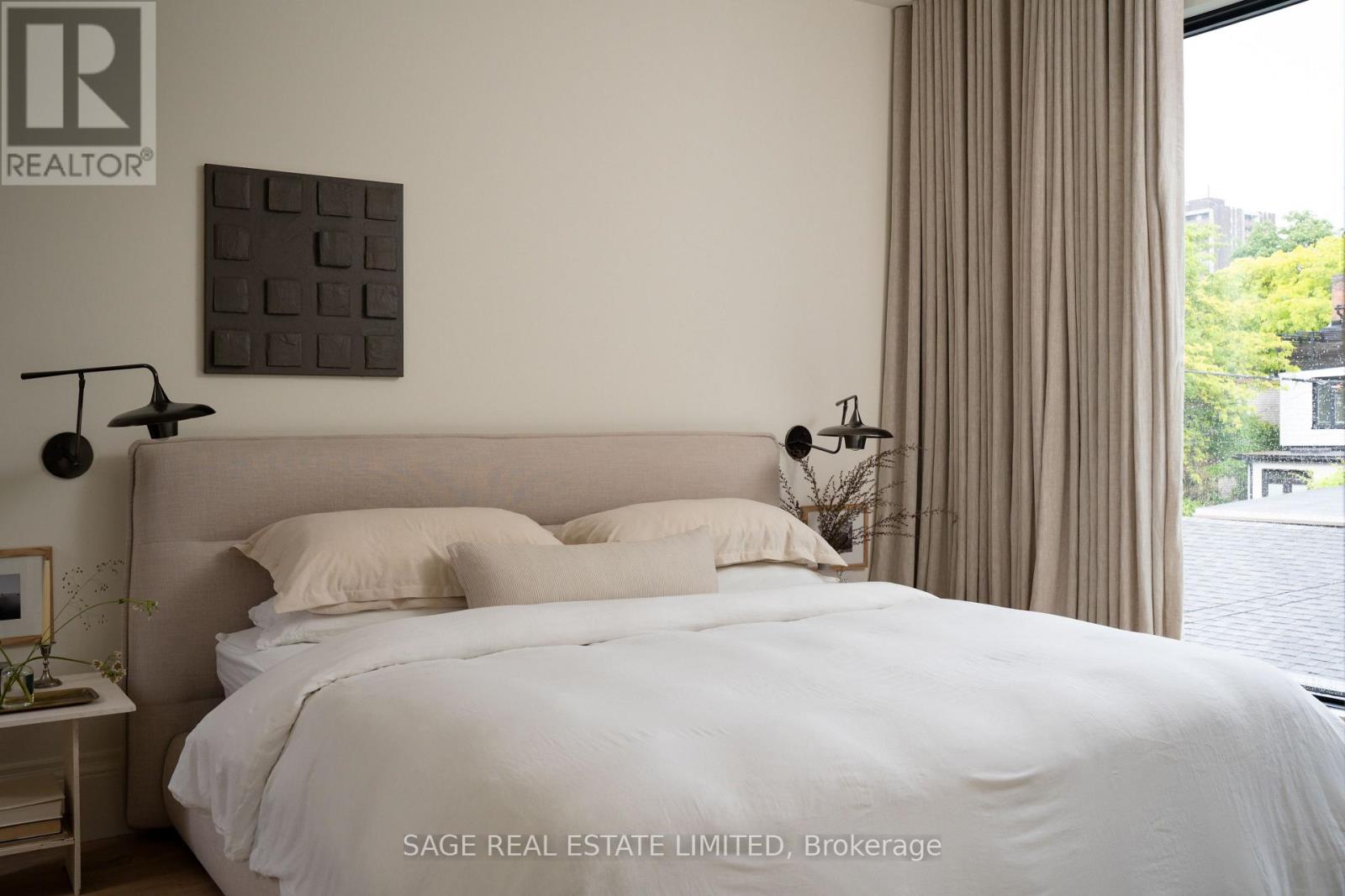 THE BOLD AND THE BORDEN. Absolute heart-stopper in the Annex with every single thing you thought of and things you hadn't even considered needing until this very second (keep reading). Designed by interior designer and homeowner, Lyndsay Jacobs Interior, this home is a gorgeous collision of design, function, soul and craftsmanship. Standout features include: meticulously restored 1878 stained glass windows, Canadian limestone fireplace mantle with gas insert, exposed brick, custom millwork throughout and soft curved walls that gently guide you through the space. Natural light pours in from 10-foot bi-fold kitchen windows/doors highlighting abundant custom cabinetry and a 17-foot floating Nero Borghini marble shelf. Built-in column fridge/freezer set up keeps things sleek, with under-counter refrigeration and prep sink offering daily luxury and professional level functionality. Skylights draw your eyes up through a four storey staircase by Ultrastairs, leading to serene, peaceful bedroom quarters where the outside world disappears and offers you a deep exhale from the chaotic energy of the day. Bathrooms feature unlacquered brass plumbing fixtures from Watermark, Waterworks and Kallista. And then there's the rooftop: a private, treetop-view sanctuary with a saltwater Arctic Spa hot tub, beverage station, natural gas fire pit hookup and pure Toronto magic in all four seasons.The lower level includes a custom media room designed by Bay Bloor Radio, with in-wall Bowers & Wilkins surround sound. Other lower level features include a 400-bottle, climate controlled wine cellar, a dog wash and a fully contained in-law suite. Perilously perfect location sandwiched between the fab restaurant scenes on Harbord and in Yorkville and a quick skip to Ossington. Boldly go to Borden. A winner in every single way. (id:51158)