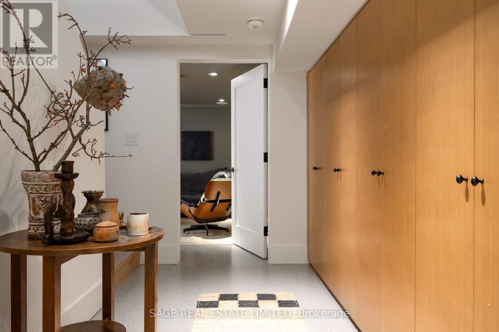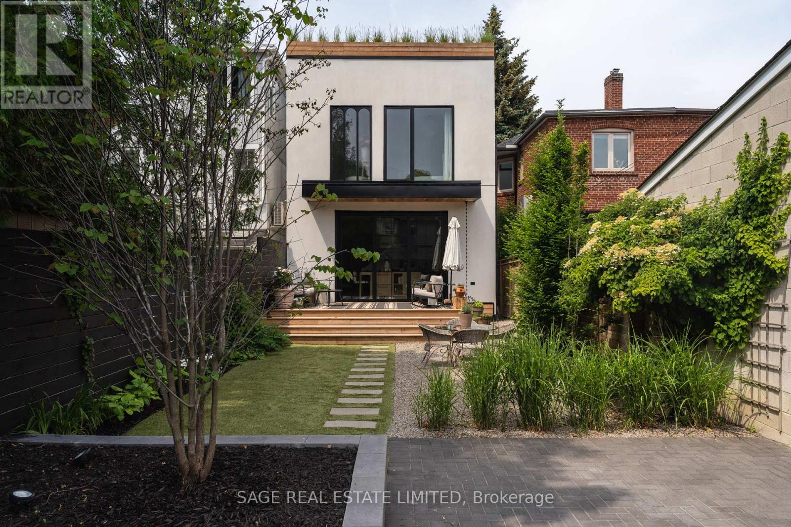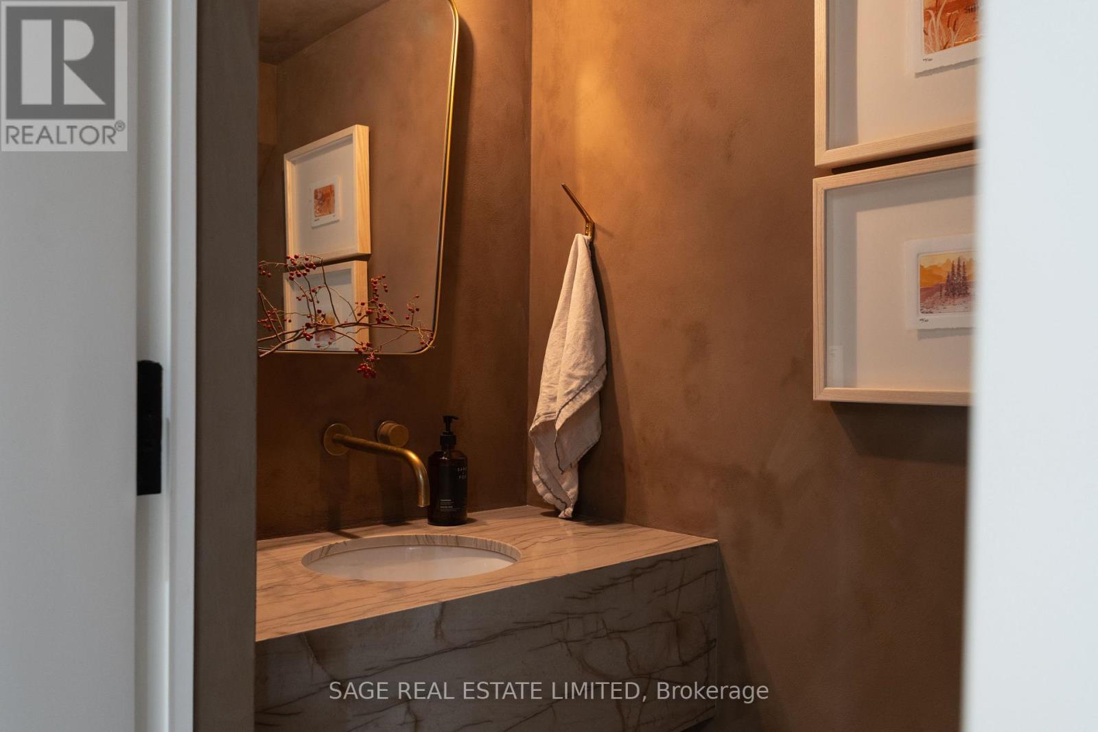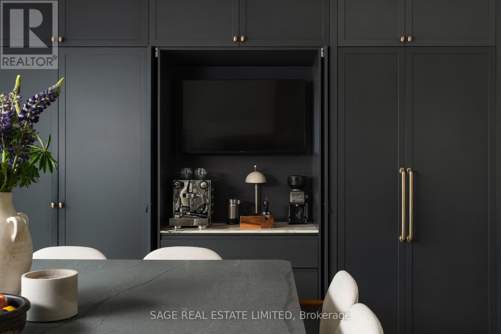 THE BOLD AND THE BORDEN. Absolute heart-stopper in the Annex with every single thing you thought of and things you hadn't even considered needing until this very second (keep reading). Designed by interior designer and homeowner, Lyndsay Jacobs Interior, this home is a gorgeous collision of design, function, soul and craftsmanship. Standout features include: meticulously restored 1878 stained glass windows, Canadian limestone fireplace mantle with gas insert, exposed brick, custom millwork throughout and soft curved walls that gently guide you through the space. Natural light pours in from 10-foot bi-fold kitchen windows/doors highlighting abundant custom cabinetry and a 17-foot floating Nero Borghini marble shelf. Built-in column fridge/freezer set up keeps things sleek, with under-counter refrigeration and prep sink offering daily luxury and professional level functionality. Skylights draw your eyes up through a four storey staircase by Ultrastairs, leading to serene, peaceful bedroom quarters where the outside world disappears and offers you a deep exhale from the chaotic energy of the day. Bathrooms feature unlacquered brass plumbing fixtures from Watermark, Waterworks and Kallista. And then there's the rooftop: a private, treetop-view sanctuary with a saltwater Arctic Spa hot tub, beverage station, natural gas fire pit hookup and pure Toronto magic in all four seasons.The lower level includes a custom media room designed by Bay Bloor Radio, with in-wall Bowers & Wilkins surround sound. Other lower level features include a 400-bottle, climate controlled wine cellar, a dog wash and a fully contained in-law suite. Perilously perfect location sandwiched between the fab restaurant scenes on Harbord and in Yorkville and a quick skip to Ossington. Boldly go to Borden. A winner in every single way. (id:51158)