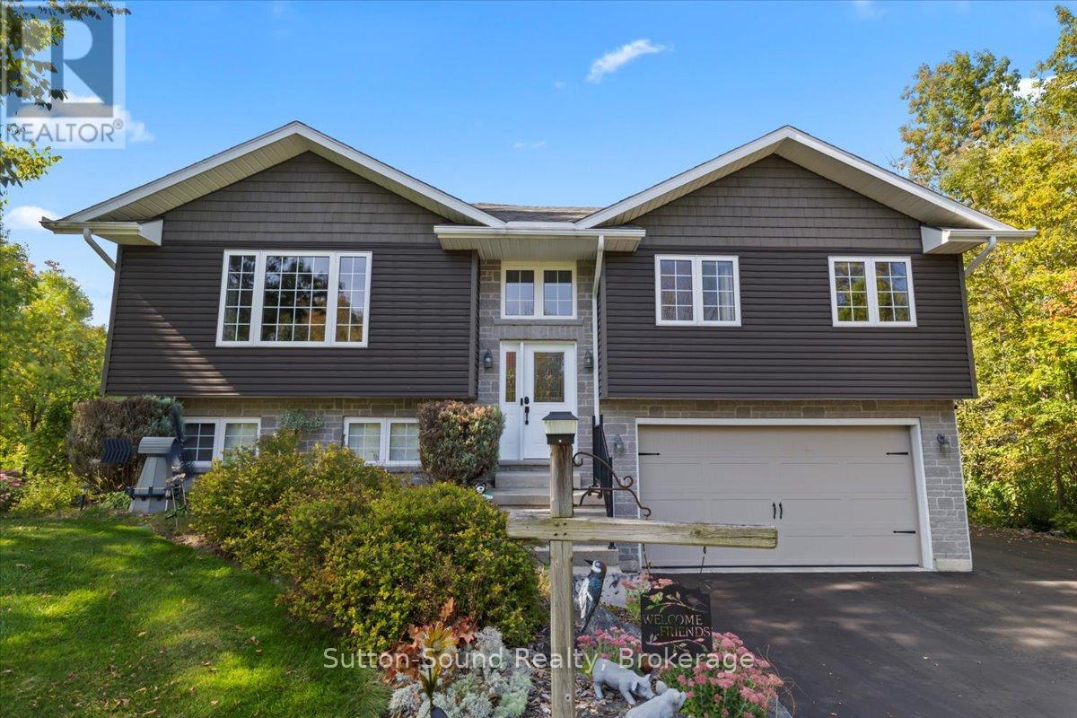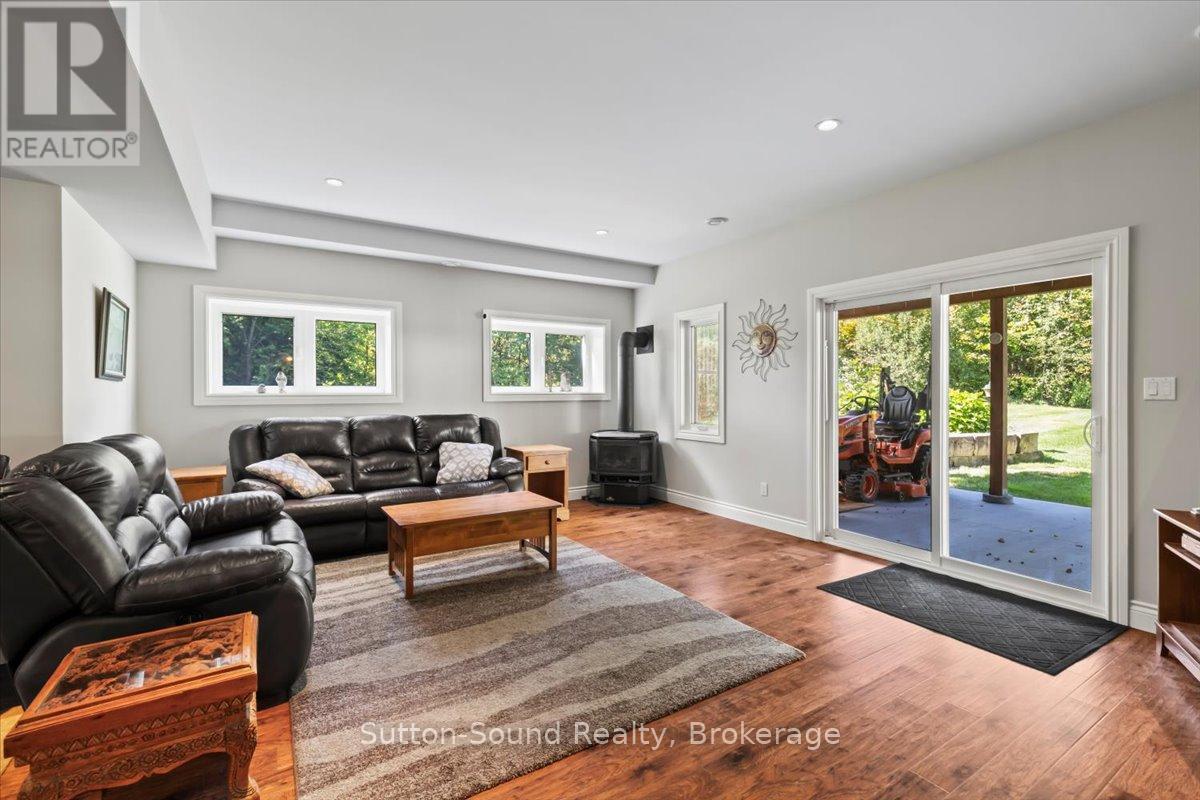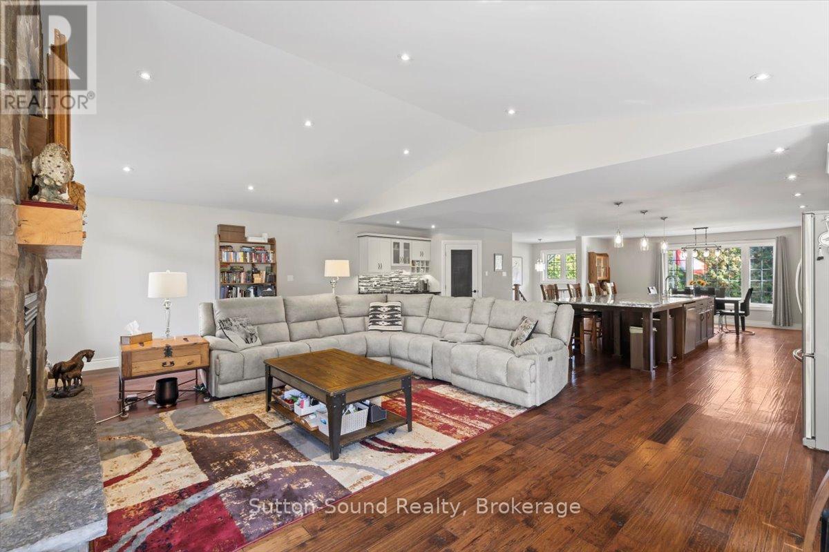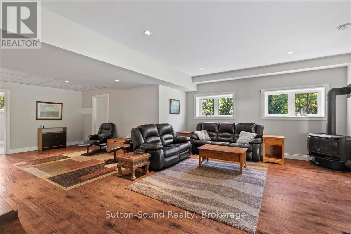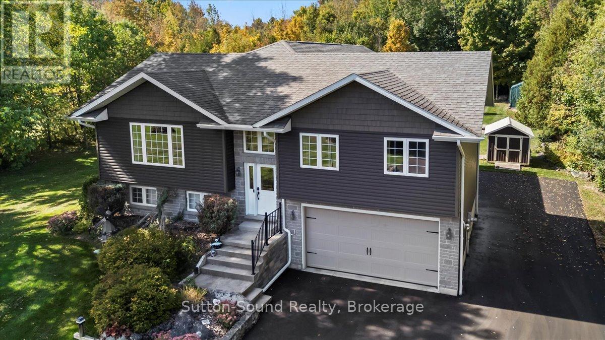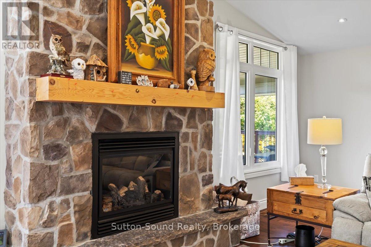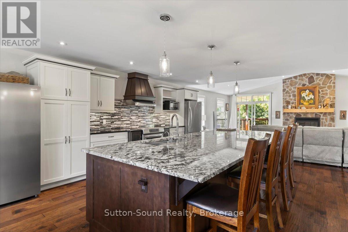 Welcome to this stunning family home siting on ONE acre, offering modern updates and thoughtful design in a desirable Georgian Bluffs location WITH natural gas. The open-concept family room features cathedral ceilings, engineered hardwood floors, an eye catching stone (gas) fireplace, and walkout to a covered deck. The showpiece gourmet kitchen boasts a 12' x 5' island with granite countertops, stainless steel appliances, coffee bar with wine fridge, and walk-in pantry. The spacious primary suite includes a step-in closet and ensuite with in-floor heating, while two additional bedrooms feature updated flooring and custom closet shelving. Main floor laundry adds convenience. The finished basement offers a sun-filled rec room, gas fireplace, large bedroom, mudroom, storage, 2-pc powder room, and walkout to a patio, with potential for an in-law suite. A heated/air-conditioned workshop and garage with bench and heater are ideal for hobbyists. Outside, enjoy the large mature yard with firepit and 12' x 20' Shelter Logic enclosure for extra storage and a Mennonite built 9' x 12' garden shed. Smart home lighting throughout and professionally maintained mechanicals complete this move-in ready property. Everything is ready for you - just move in and call it HOME! (id:51158)