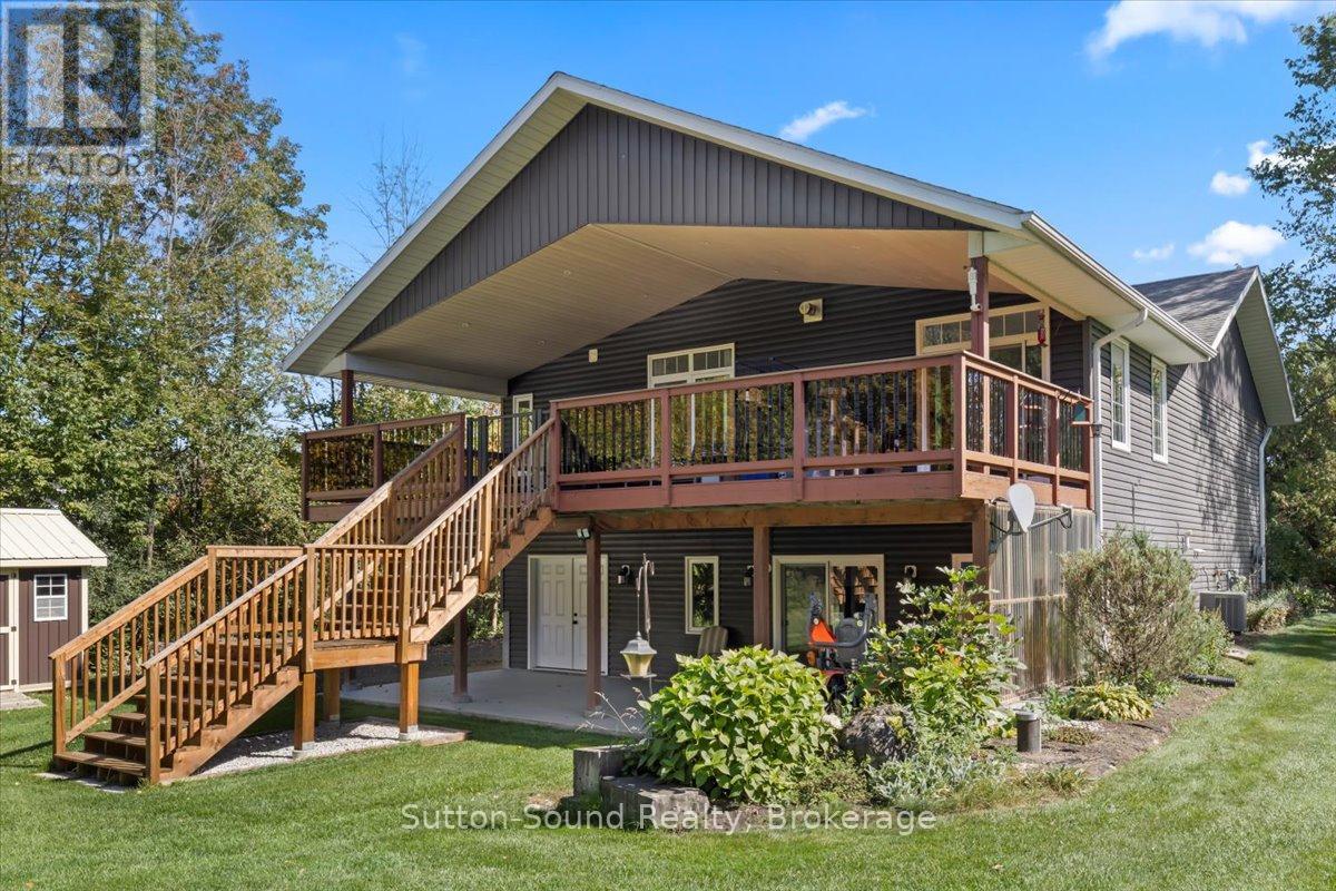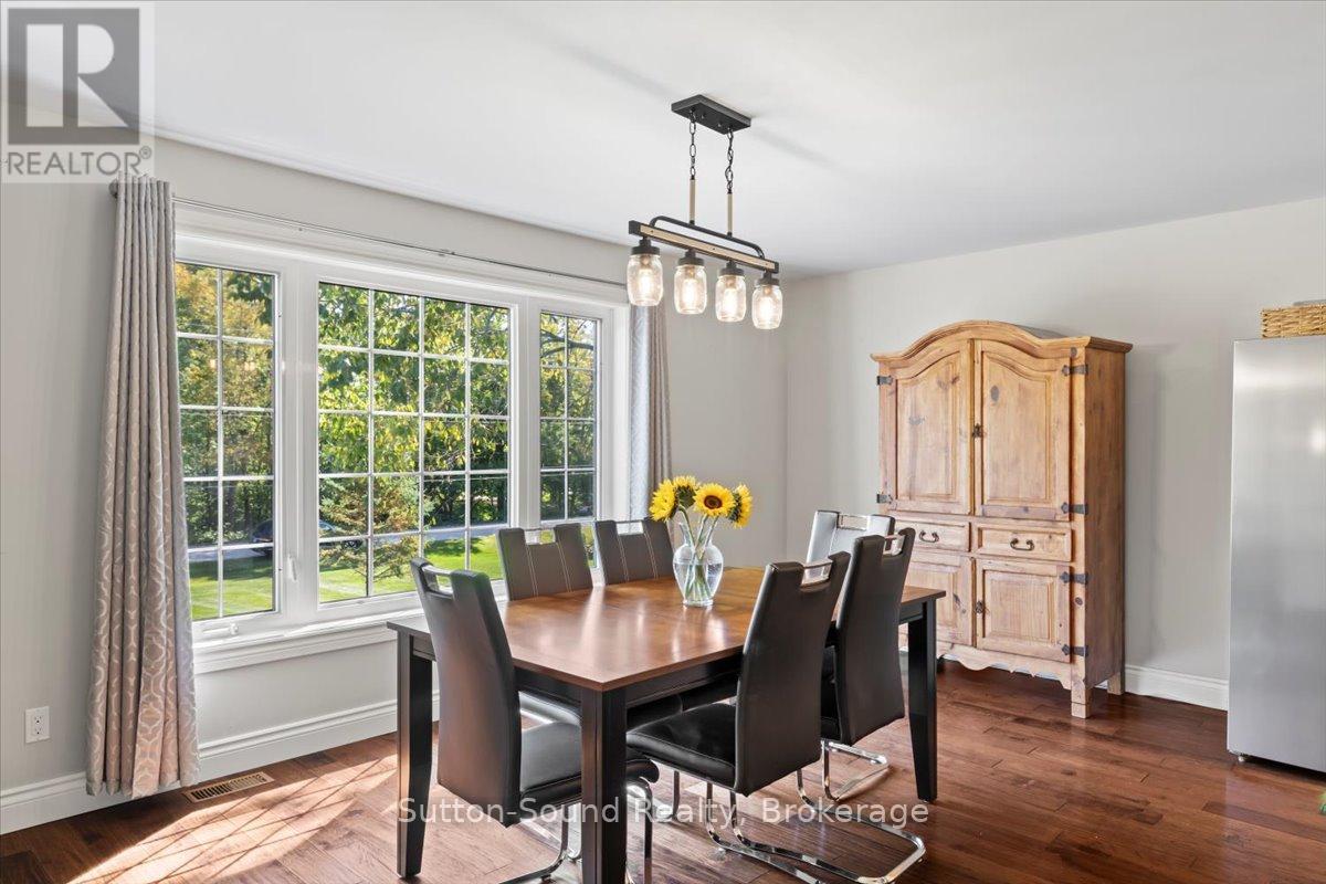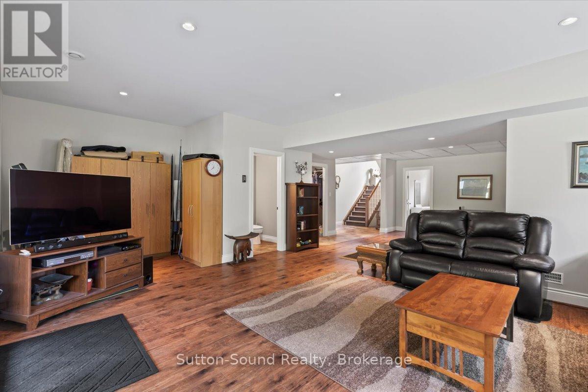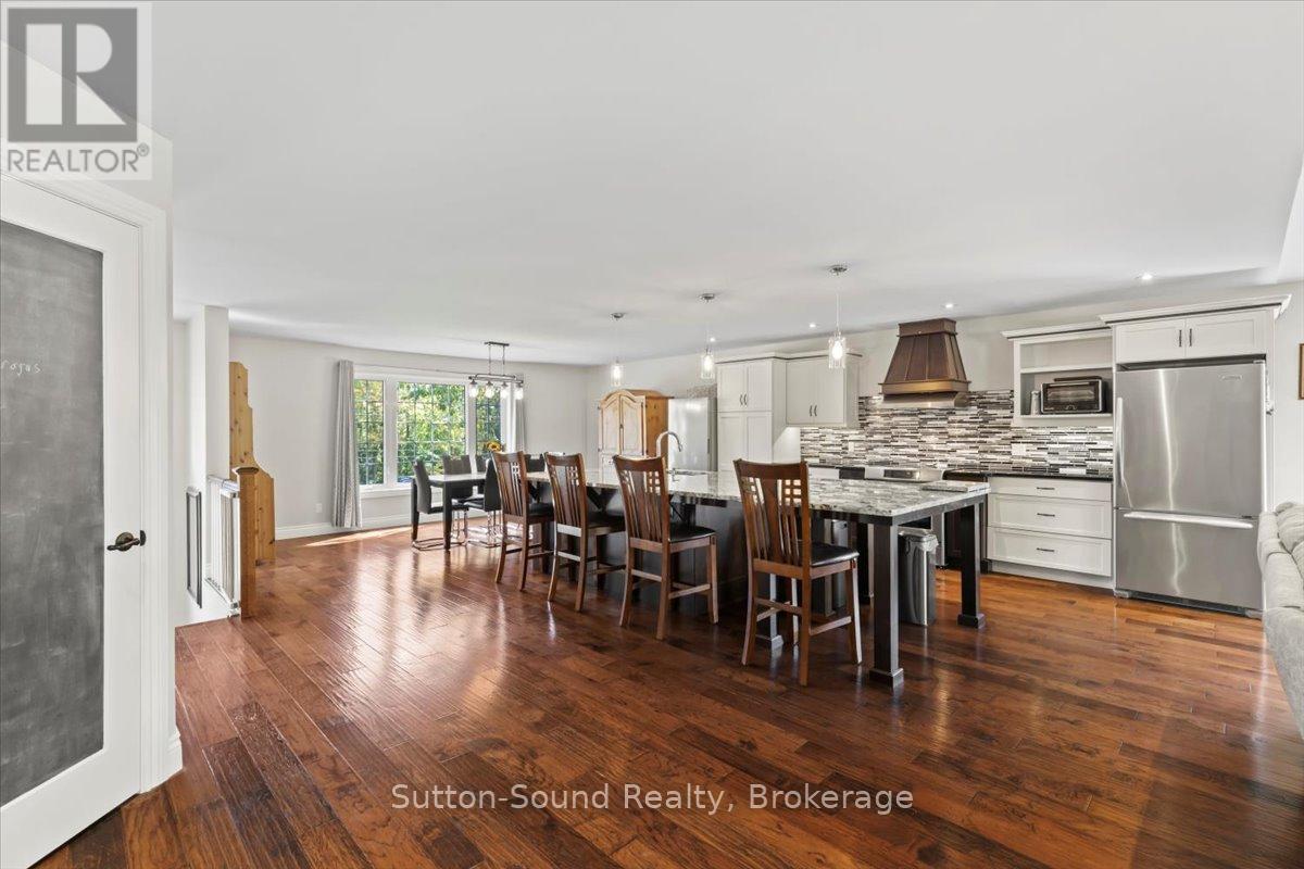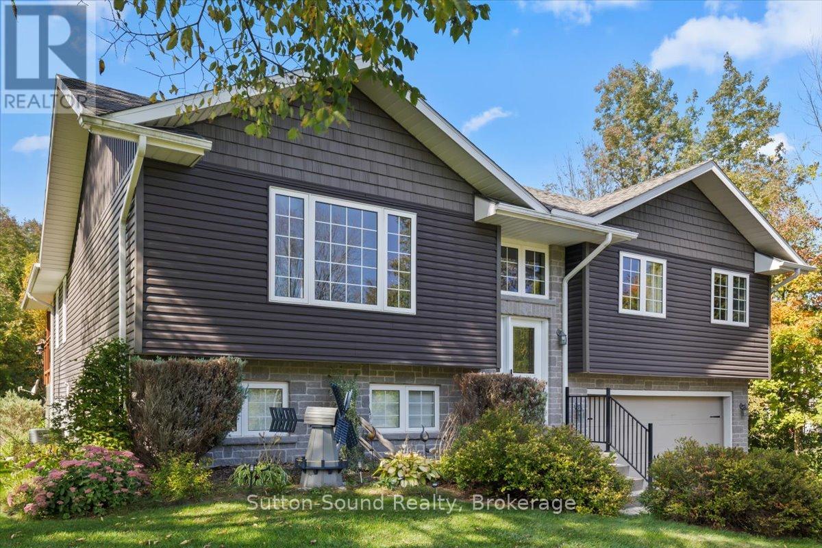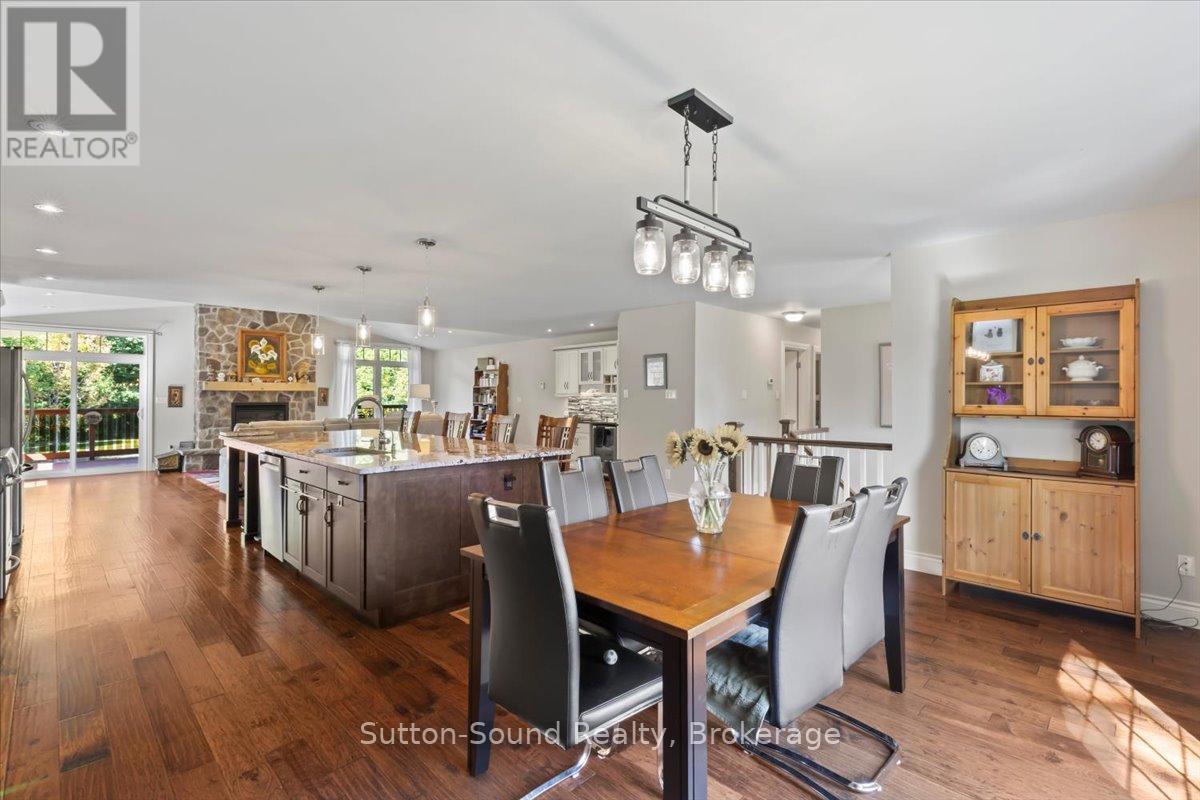 Welcome to this stunning family home siting on ONE acre, offering modern updates and thoughtful design in a desirable Georgian Bluffs location WITH natural gas. The open-concept family room features cathedral ceilings, engineered hardwood floors, an eye catching stone (gas) fireplace, and walkout to a covered deck. The showpiece gourmet kitchen boasts a 12' x 5' island with granite countertops, stainless steel appliances, coffee bar with wine fridge, and walk-in pantry. The spacious primary suite includes a step-in closet and ensuite with in-floor heating, while two additional bedrooms feature updated flooring and custom closet shelving. Main floor laundry adds convenience. The finished basement offers a sun-filled rec room, gas fireplace, large bedroom, mudroom, storage, 2-pc powder room, and walkout to a patio, with potential for an in-law suite. A heated/air-conditioned workshop and garage with bench and heater are ideal for hobbyists. Outside, enjoy the large mature yard with firepit and 12' x 20' Shelter Logic enclosure for extra storage and a Mennonite built 9' x 12' garden shed. Smart home lighting throughout and professionally maintained mechanicals complete this move-in ready property. Everything is ready for you - just move in and call it HOME! (id:51158)