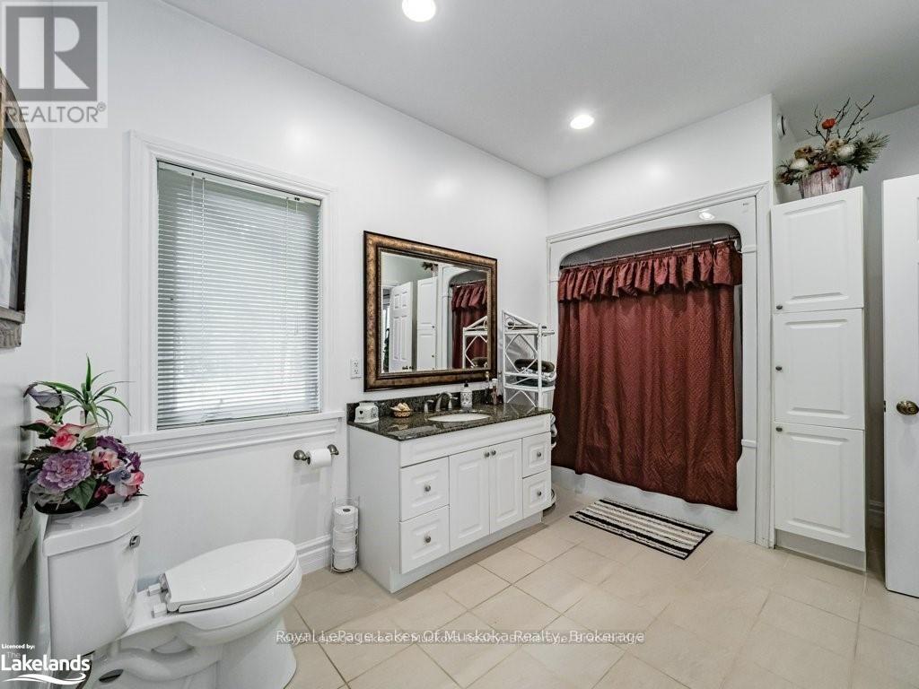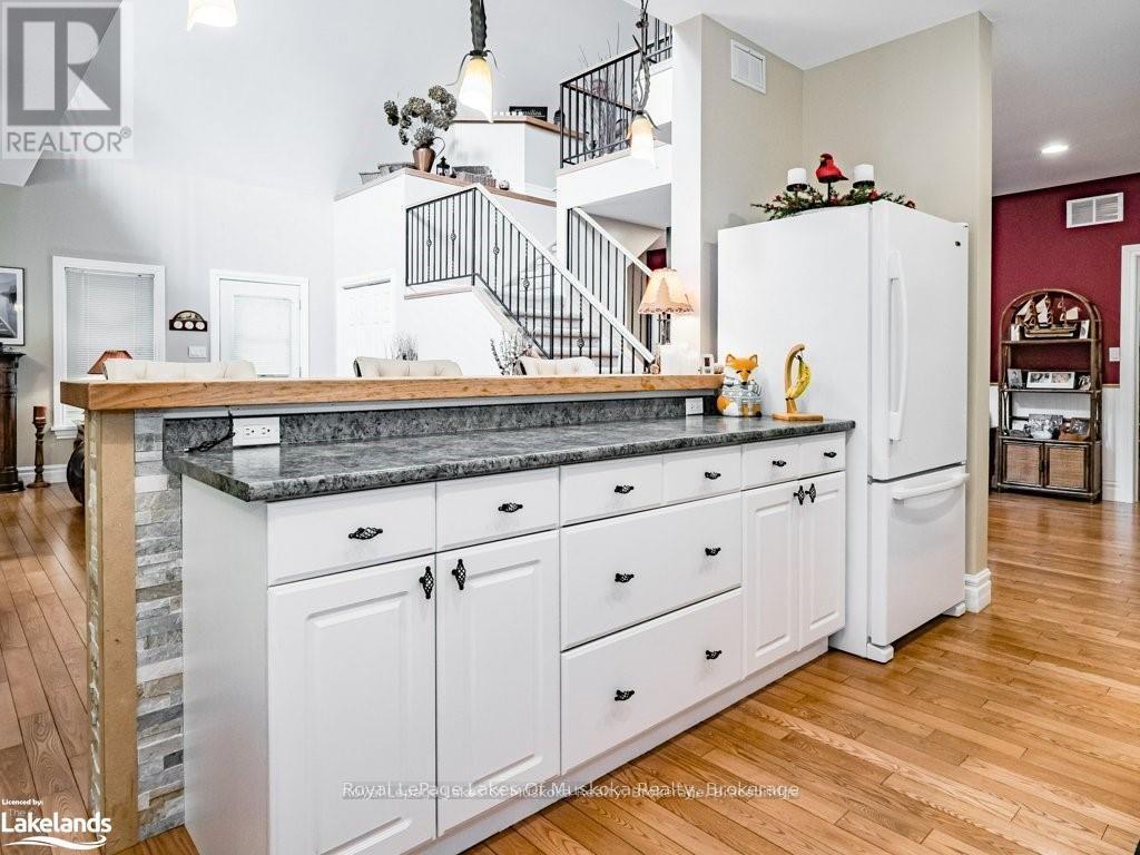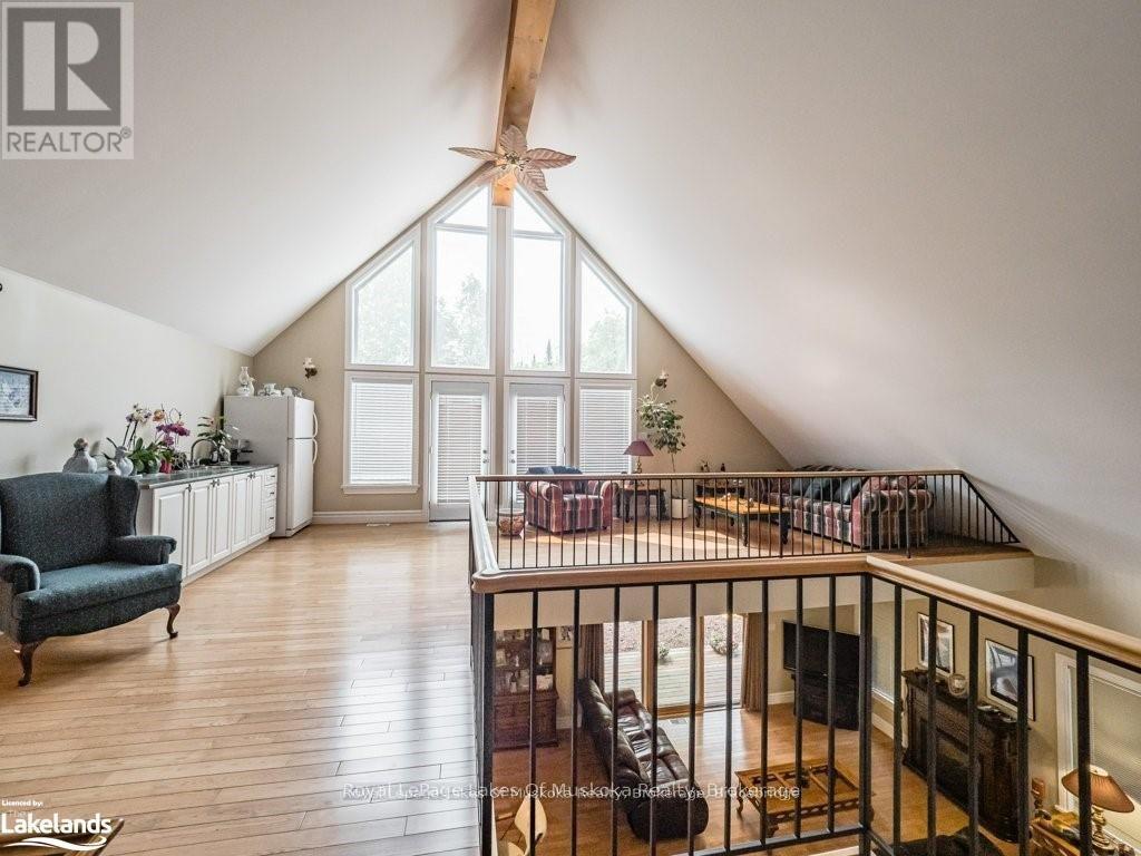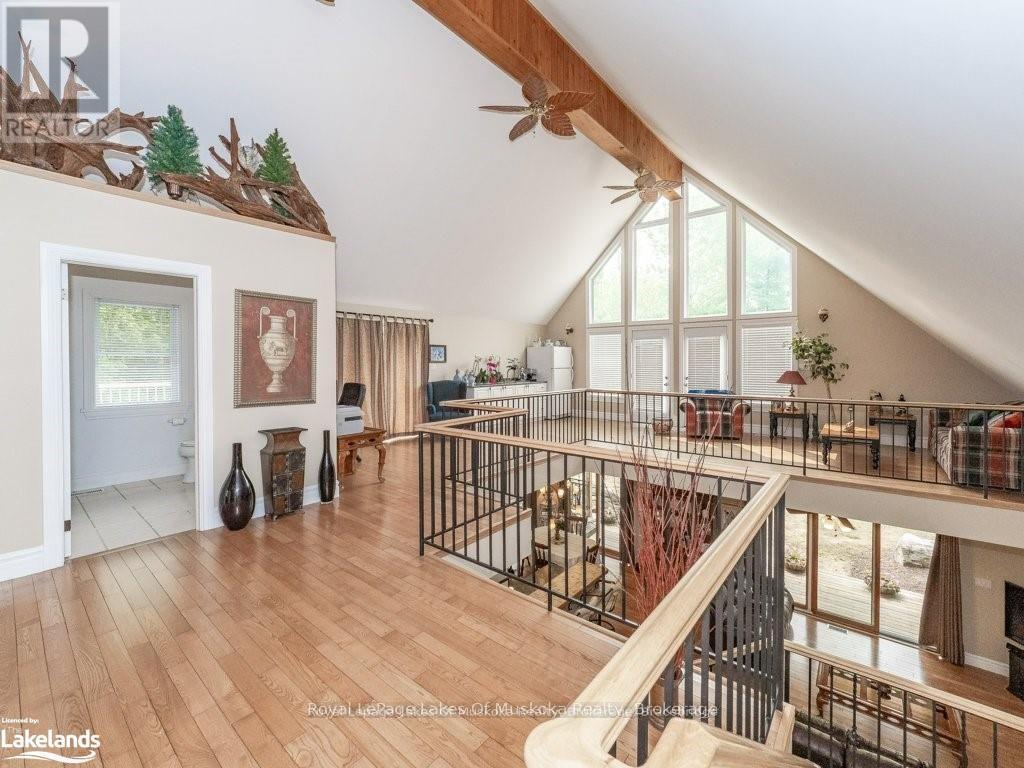 Offering a stunning custom-built home nestled on a private 2-acre country lot with a lovely view over a pond where the birds and wildlife like to visit. This home is large enough to share with an extended family or to host your overnight guests when they come to visit Muskoka. Enjoy the summer breeze as you relax on the huge wrap around veranda leading to a large, covered deck for dining and BBQ's. Upon entry, the home features an open concept floor plan with soaring cathedral ceilings. The primary bedroom is on the main floor with patio doors overlooking the backyard and pond leading to the back deck. There is a large main floor 4 pc. bathroom and a convenient laundry room. Upstairs is the loft with a wet bar and patio doors leading to two large balconies with beautiful views of the forest. Two additional bedrooms are also on the second level along with a 4 pc. bathroom. Gleaming red ash floors grace the principal rooms and upper level. Great potential for a 1400 sq. ft. family accomodations in the lower level, all with above grade windows to two walkouts to the backyard. A finished fourth bedroom and third 4 pc. bathroom along with an ample rec room and family room which could be finished off as a eat-in kitchen. The kitchen cabinets are not mounted but are included in the sale. There is a cute bunkie next to the house which could be used as a workshop studio or extra accommodations. All of this is only a short drive to town or a five-minute drive from the public beach on Prosect Lake where you can go for a quick dip or to launch the watercraft to go fishing. Enjoy the country lifestyle while working, living and playing in beautiful Muskoka! ** This is a linked property.** (id:51158)
