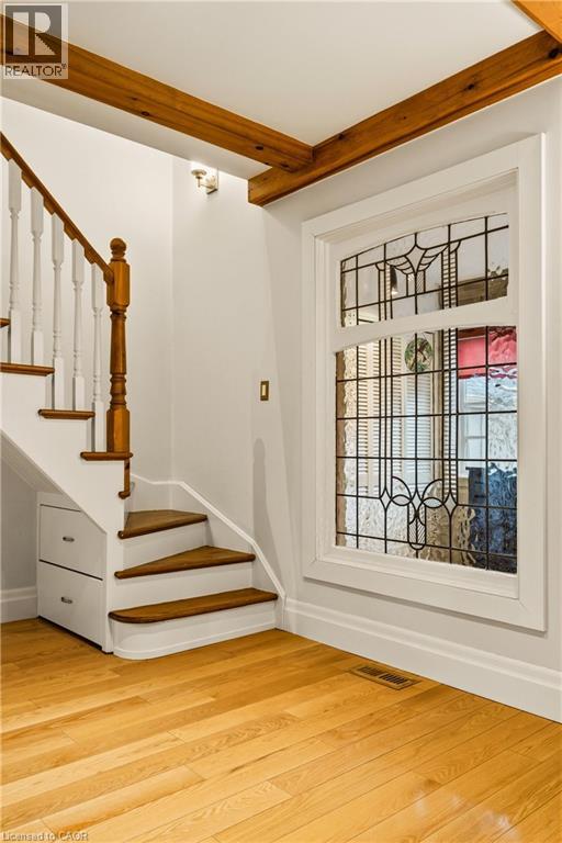 Don’t be fooled by its charming curb appeal—this circa 1885 double brick home offers far more space than meets the eye. Ideally located just moments from downtown Dundas, you’ll enjoy easy access to local shops, cafés, restaurants, and galleries, along with nearby theatres, recreation facilities, parks, trails, and top-rated schools. With 4 bedrooms, a versatile den, and 2.5 bathrooms, it’s designed to comfortably accommodate family living and entertaining alike. A thoughtfully designed two-storey board-and-batten addition integrates beautifully with the original home, showcasing unique touches like a reclaimed leaded glass window in the mudroom. At the heart of the home, the kitchen is both stylish and functional, featuring granite countertops, a generous island, slate floors, and abundant cabinetry—ideal for everyday living or hosting. The main floor blends historic charm with modern updates. The formal living room highlights original pine plank floors, while the dining room—graced with a stained glass transom—offers ample space for gatherings. The inviting family room stands out with its beamed ceiling, exposed brick, wood stove, hardwood flooring, and dual walkouts to the backyard. Upstairs, two separate staircases lead to a spacious primary suite complete with built-in storage and a private 3-piece ensuite. Three additional bedrooms, a bright office, and five skylights fill the upper level with natural light. A convenient Jack-and-Jill bathroom features a walk-in shower with a built-in bench. Set on an impressive 69-foot frontage, the fully fenced backyard is a private retreat with a heated in-ground saltwater pool, deck, multiple patios, and beautifully landscaped gardens. A single-car garage and private driveway complete the package. With quick connections to McMaster and major routes, this home offers the perfect balance of charm, space, and convenience. A rare opportunity to own a truly special property in the heart of historic Dundas. (id:51158)