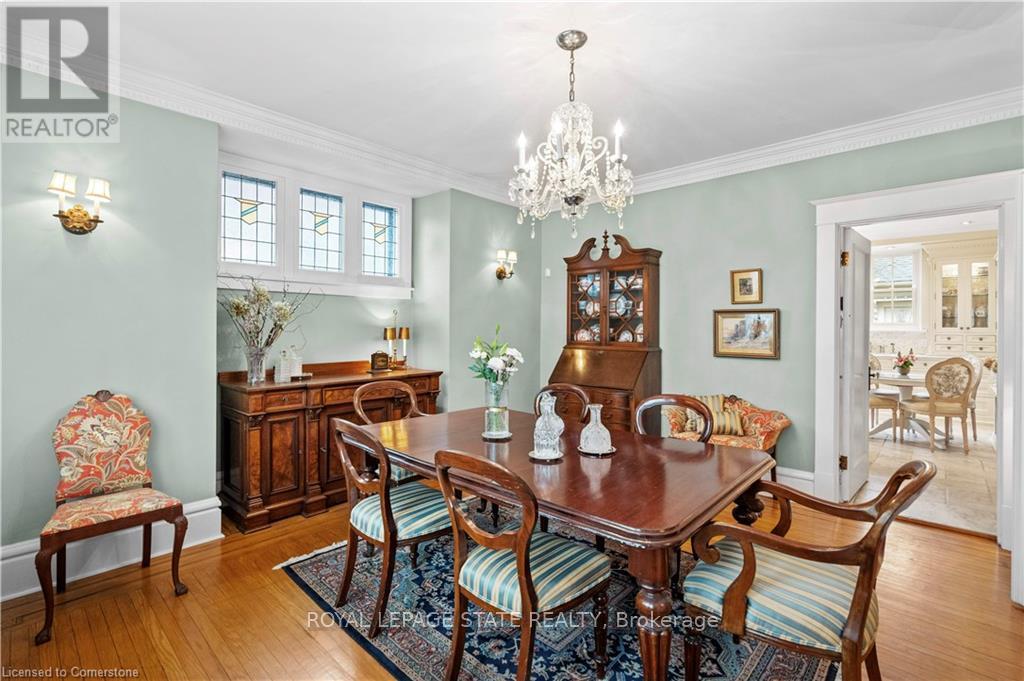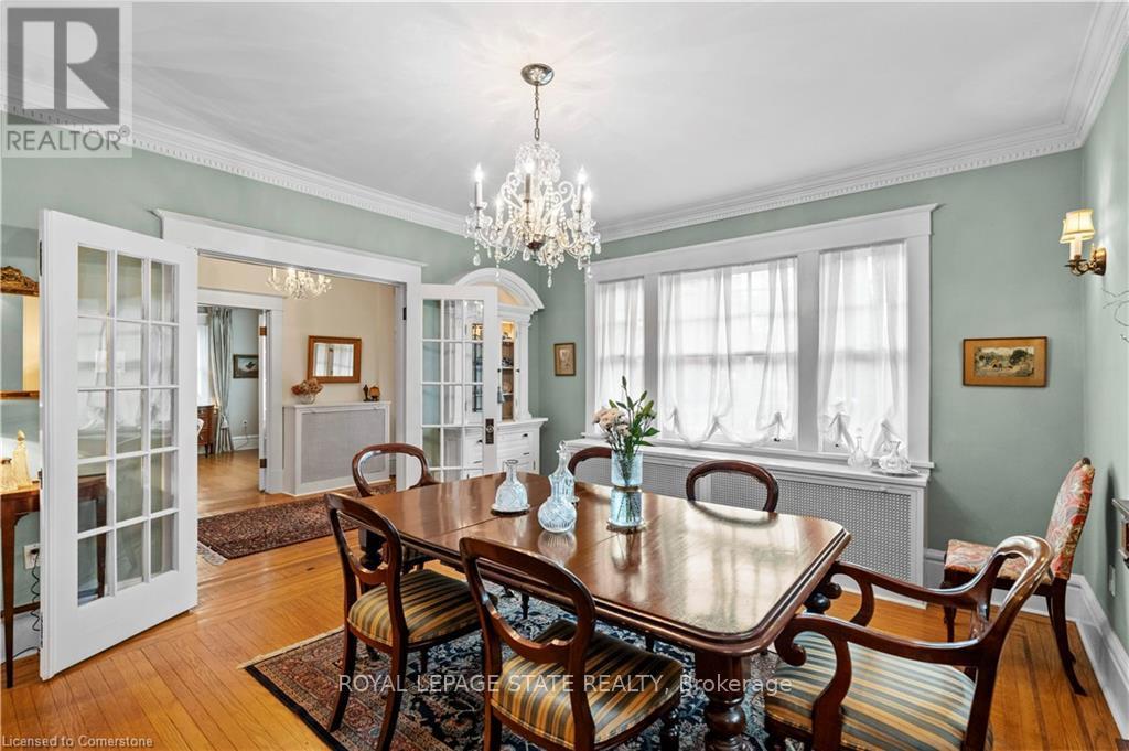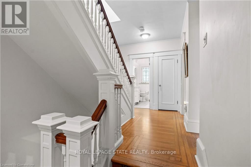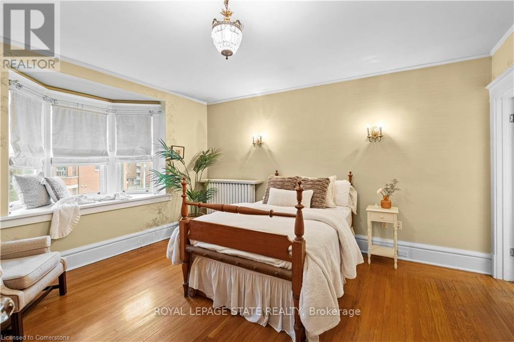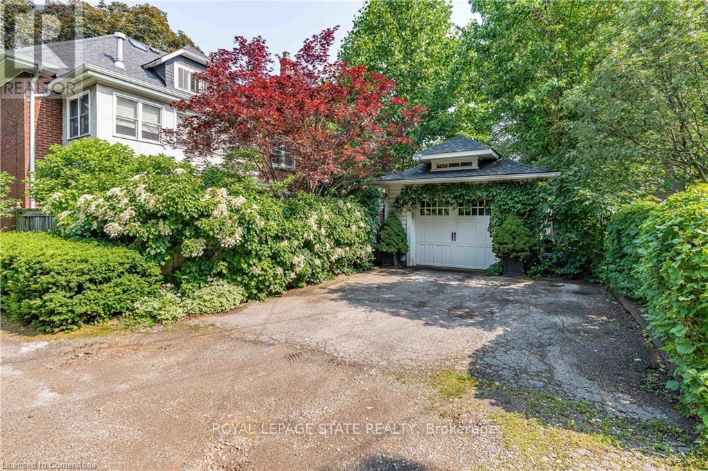 Circa 1922, this stately 2.5-storey is situated on a mature 46 x 85.33 property in the heart of the historic Durand neighbourhood, showcasing classic curb appeal with a front walkway leading to a covered porch framed by Doric columns. Gorg entry door adorned w/ original wrought-iron grillwork. Step inside to the elegant foyer w/ crown moulding & a sweeping staircase w/ ornate woodwork. French doors lead to the formal living room feat a gas FP, an intricate mantle, & windows overlooking the front/rear gardens. Formal din rm w/ built-in cab, leaded stained glass windows, & detailed millwork. The kitch feat limestone flrs, custom cabinetry w/ bevelled glass, pantry, marble counters, luxe S/S app incl a Miele dishwasher, Viking gas range & Sub-Zero fridge. Convenient mudroom w/ a dbl mirrored closet completes the main lvl. A landing of leaded stained glass windows leads to the 2nd lvl, feat a 25.9' x 13' primary w/ a sitting area, dual closets, & access to the den, 2 add bdrms, one w/ a bay window & ensuite, the other w/ garden views & den access, & a 4-pc bath w/ Jacuzzi tub, leaded stained glass windows, & hand-painted murals. The den is a serene retreat w/ custom shelving & garden views. 3rd lvl w/ 4th bdrm, 3-pc ensuite, skylights, gas FP, storage & 2 sitting nooks. The lower lvl feat laund facilities w/ custom cab, a 2-pc bath, ample storage, & workshop areas. Outside, enjoy the private, landscaped yard w/ an arched brick wall w/ iron gate, water fountain, covered composite porch, awning, gas BBQ, det 1-car grg w/ surf parking for 2 accessible via a laneway & more. This exceptional home feat hrdwd flrs, custom window coverings, c-air, alarm system, HEPA air purifier, rad heating w/ gas boiler, & stunning original features from trim to stained glass. Walkable access to Locke Streets mix of boutiques, cafes, & dining, art galleries, theatres, hospitals, & GO Transit. Minutes from MAC, parks, hiking trails, & several of the citys scenic escarpment accesses. (id:51158)