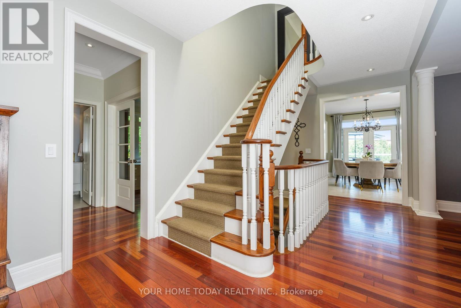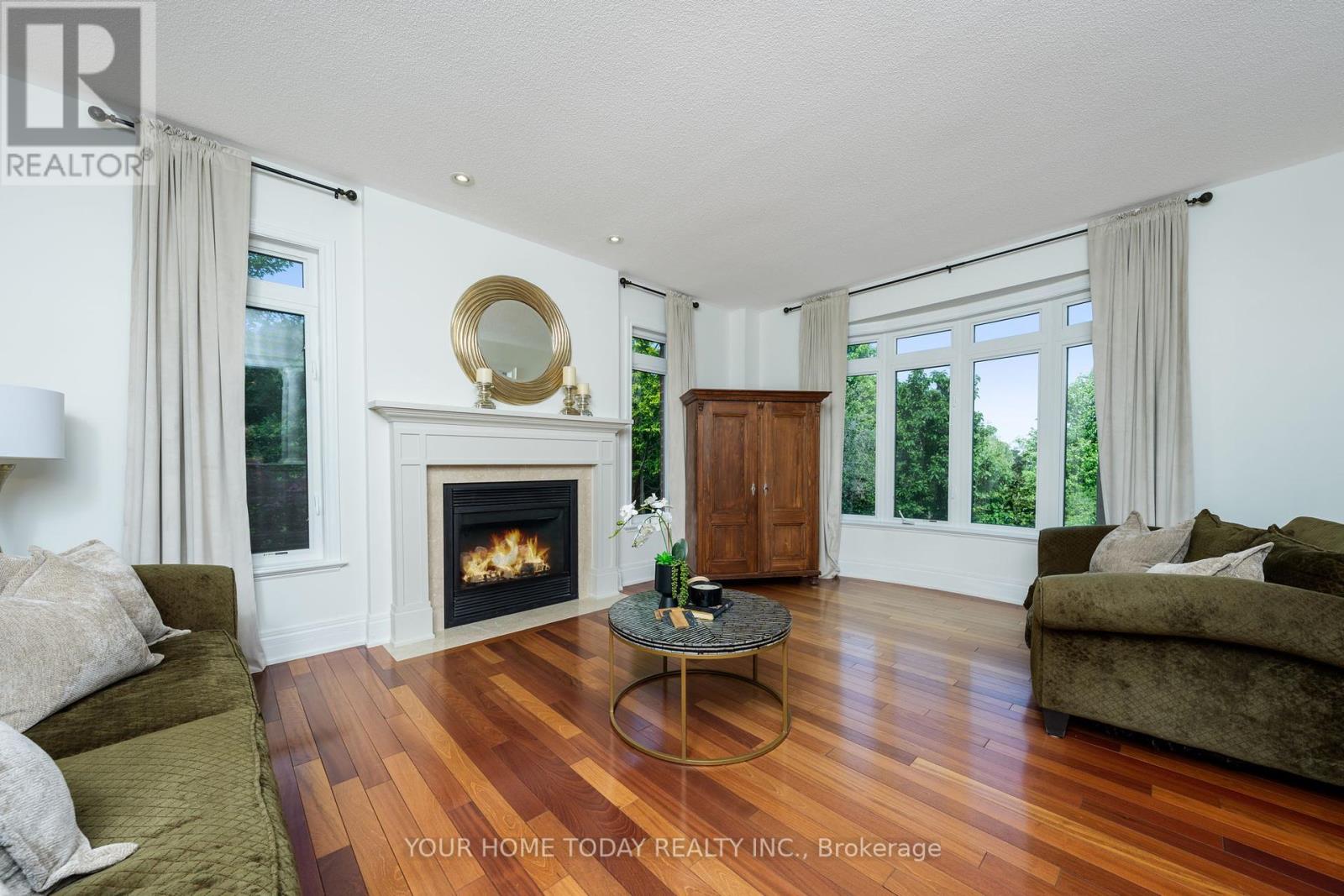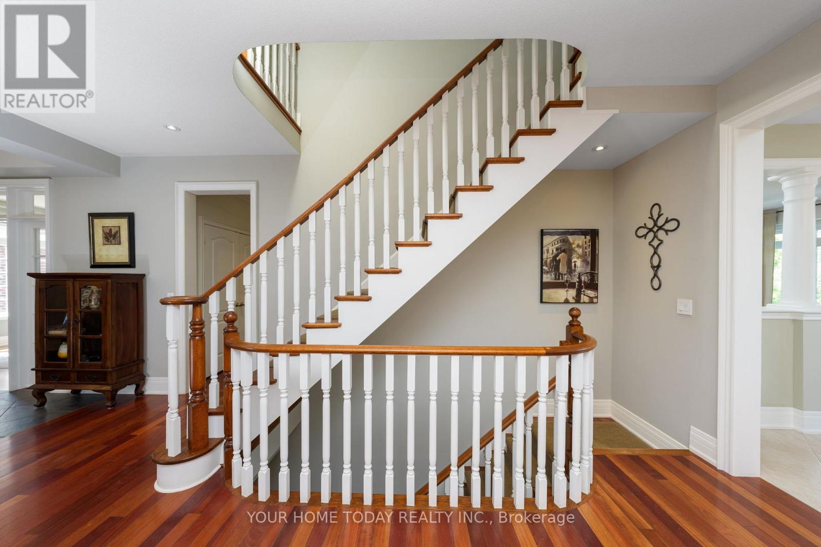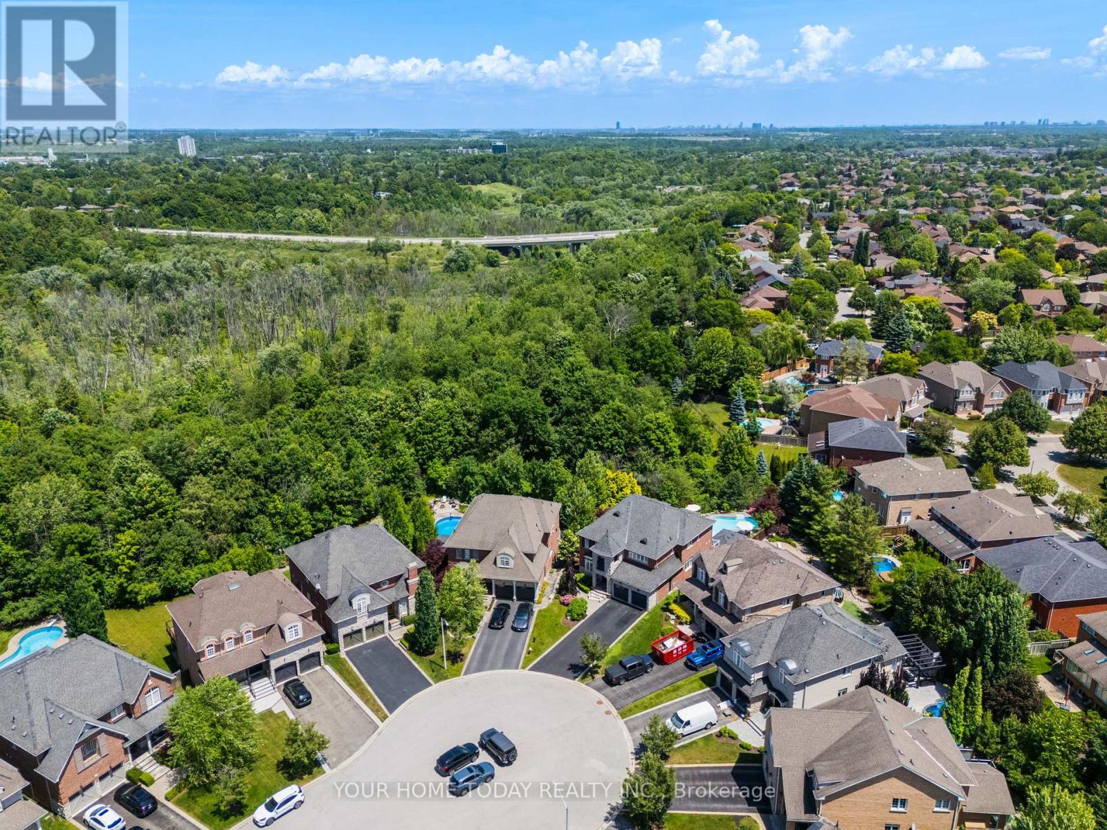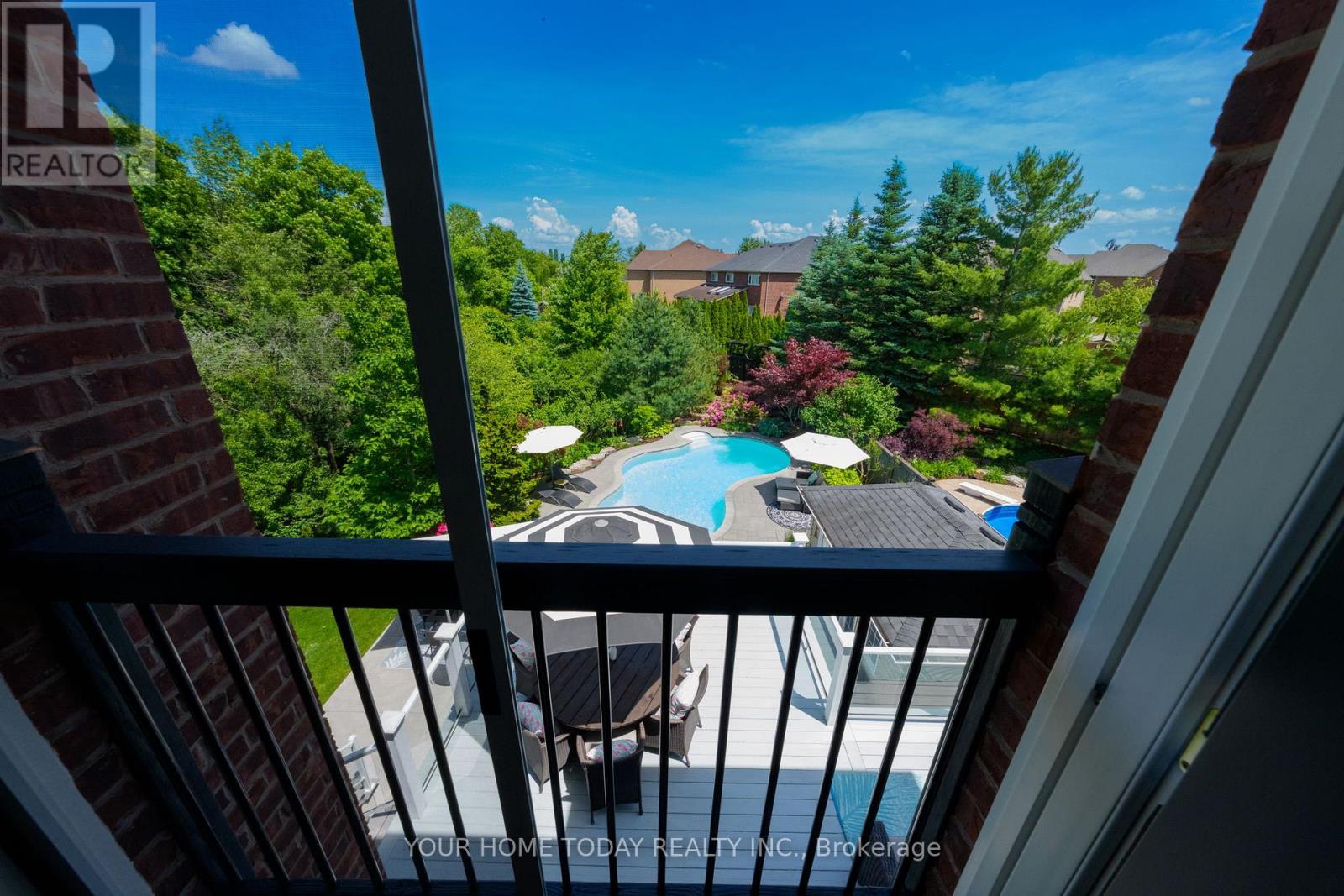 Double Oak excellence teamed with impeccable taste plus a gorgeous ravine lot with heated saltwater pool a win, win, win!! Nestled on one of the nicest & rarely available cul-de-sacs in town, this impressive 5-bdrm, 3.5-bthrm home offers over 5,000 sq. ft. of beautifully finished living space with attention to detail & superior quality throughout. A stylish stone portico, lovely landscaping & striking entry system set the stage for this exceptional home & property. The main level features a spacious layout with 9 ft. ceilings, tasteful flooring, crown, pot lights, U/G trim/window frames & more. Formal dining & living rooms are perfect for entertaining guests or sneaking off for some quiet time, while the kitchen & family room, the heart of the home, are nestled at the back O/L a magical setting! The kitchen & servery feature extended height shaker style cabinetry with crown detail, quartz counter & glass subway tile bcksplsh. An island with seating, SS appliances, breakfast area & W/O to the large glass paneled deck O/L a backyard oasis are sure to delight the chef in the house. The adjoining family room enjoys a toasty gas F/P & large view over the breathtaking yard. An office, powder room, laundry room & mud room complete the level. The upper level offers 5 spacious bdrms, one with W/O to balcony & all with ensuite access. The primary suite features an eye-catching feature wall, W/I closet & decadent 5-pc. An O/C basement adds to the enjoyment with a party-sized rec room, exercise area, office area & large workshop/utility room. A toasty gas f/p set on a shiplap feature wall, large A/G windows & W/O to the covered patio, pool & cabana add to the enjoyment. Wrapping up this extraordinary offering is the breathtaking ravine lot with stunning tiered gardens, pool, extensive patio area, huge deck & cedar-lined cabana. Great location for commuters. Steps to the amazing Hungry Hollow trail & close to rec centre, schools, parks, shops & more. (id:51158)