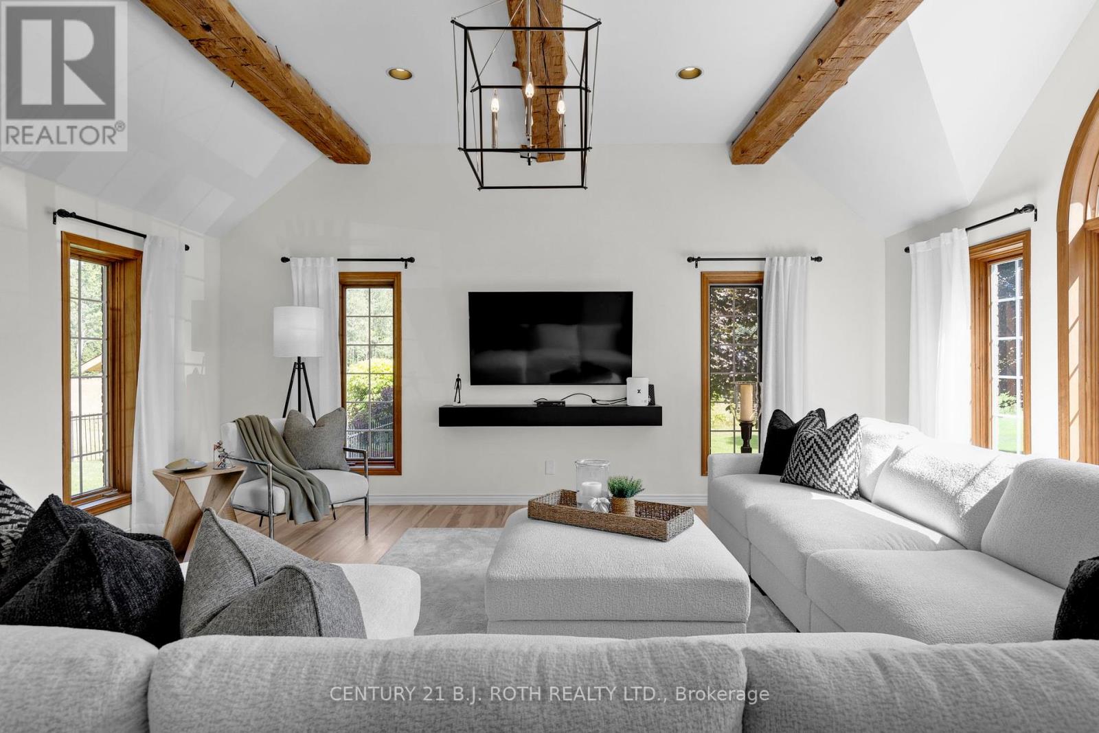 Introducing 256 Denney Drive, a beautifully crafted residence nestled on a nearly 2 acre private, professionally landscaped lot in one of Essa's most desirable neighborhoods. This exquisite property offers the perfect blend of elegance, space, and tranquility, making it a true sanctuary just minutes from Barrie, Angus, and Alliston. Spanning over 3,500 sq. ft. of finished living space, this stunning home features 4+1 bedrooms and 4 bathrooms, thoughtfully designed to accommodate both family living and stylish entertaining. As you arrive, a generous driveway welcomes you, leading to an oversized garage -- ideal for vehicles, storage, and workshop needs. Mature trees and lush landscaping frame the home, offering both privacy and striking curb appeal. Step inside to discover a residence where pride of ownership is immediately evident. The timeless color palette, paired with custom finishes throughout, sets a warm and inviting tone. The gourmet kitchen boasts elegant cabinetry, a charming bay window, and direct access to an expansive patio -- perfect for hosting gatherings or enjoying serene morning coffees. The living room is truly the heart of the home, featuring soaring 12' ceilings, exposed natural wood beams, and a stunning chandelier surrounded by large windows that flood the space with natural light. Downstairs, a fully finished basement expands your living potential, offering a large rec room, additional bedroom, and ample space to customize to your needs -- whether its a home gym, office, or media room. Step outside and unwind in your private backyard oasis, complete with a beautiful inground pool, surrounded by mature landscaping that creates a resort-like atmosphere all summer long. 256 Denney Drive is more than a home -- its a lifestyle. If you're seeking space, privacy, and understated luxury in a prime location, this property is a must-see. Don't miss this exceptional opportunity to own a truly one-of-a-kind home in Essa. (id:51158)