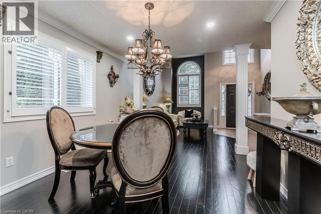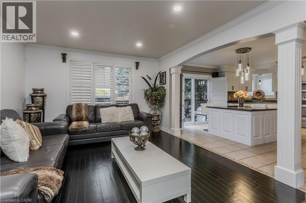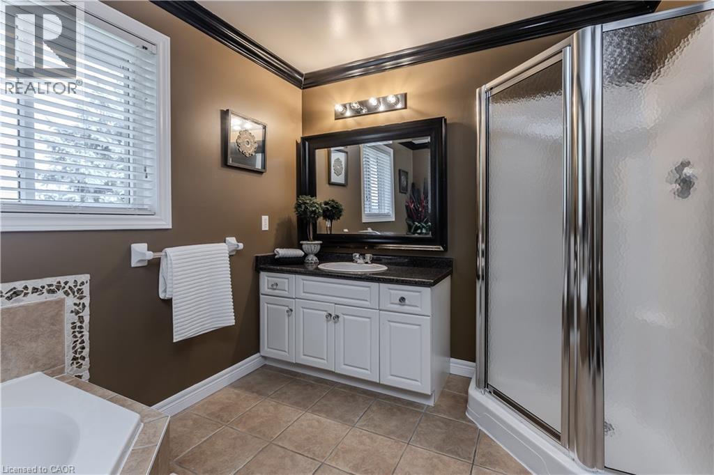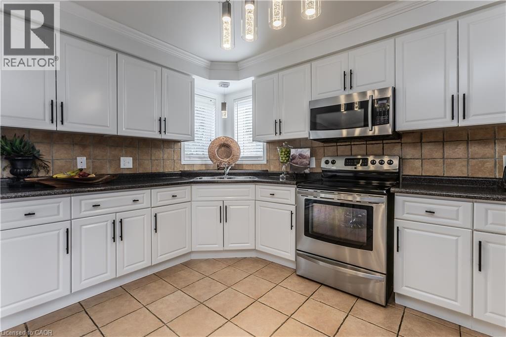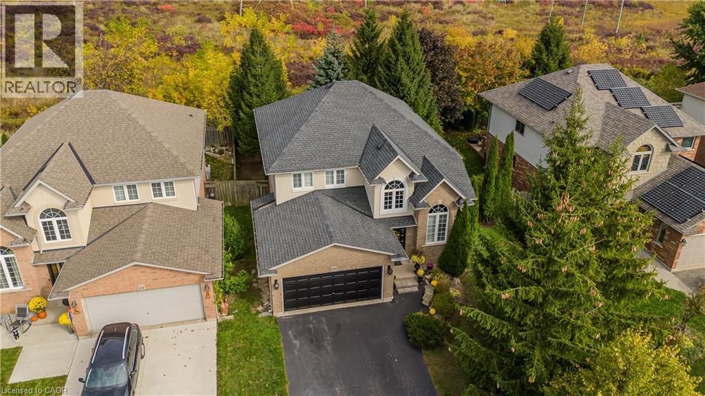 Nestled in a sought-after Glanbrook community, this exceptional family home offers the perfect blend of comfort, space, and modern elegance — backing onto lush green space for added privacy and tranquility. Surrounded by mature trees and beautifully landscaped gardens, its inviting curb appeal sets the tone for what awaits inside. Located in a family-friendly neighbourhood near top-rated schools, parks, and convenient highway access, this home was designed with growing families in mind. Step inside to a bright, open-concept main floor highlighted by hardwood flooring and California shutters throughout. The living room impresses with soaring vaulted ceilings, while the formal dining room features timeless crown moulding — perfect for gatherings and celebrations. The kitchen is both stylish and functional, boasting a large island with granite countertops and a breakfast bar, ample cabinetry, a chic tile backsplash, stainless steel appliances, and designer lighting. A walkout leads to the private rear patio, seamlessly extending your living space outdoors. The adjoining family room is warm and welcoming with a gas fireplace and a large window overlooking the yard. A convenient 2-piece powder room completes the level. Upstairs, the spacious primary suite offers a true retreat with dual walk-in closets and a luxurious 4-piece ensuite featuring a soaker tub and walk-in shower. Two additional well-sized bedrooms and another full bathroom ensure plenty of space for the whole family. The fully finished lower level adds incredible versatility, offering a spacious rec room with laminate flooring and an additional bedroom — perfect for guests, teens, or a home office. Outside, the fully fenced yard is private and serene, featuring an interlock patio ideal for summer entertaining, a large shed for extra storage, and a generous green space for kids and pets to play. A true family gem offering space, style, and a peaceful setting — this home checks every box. (id:51158)