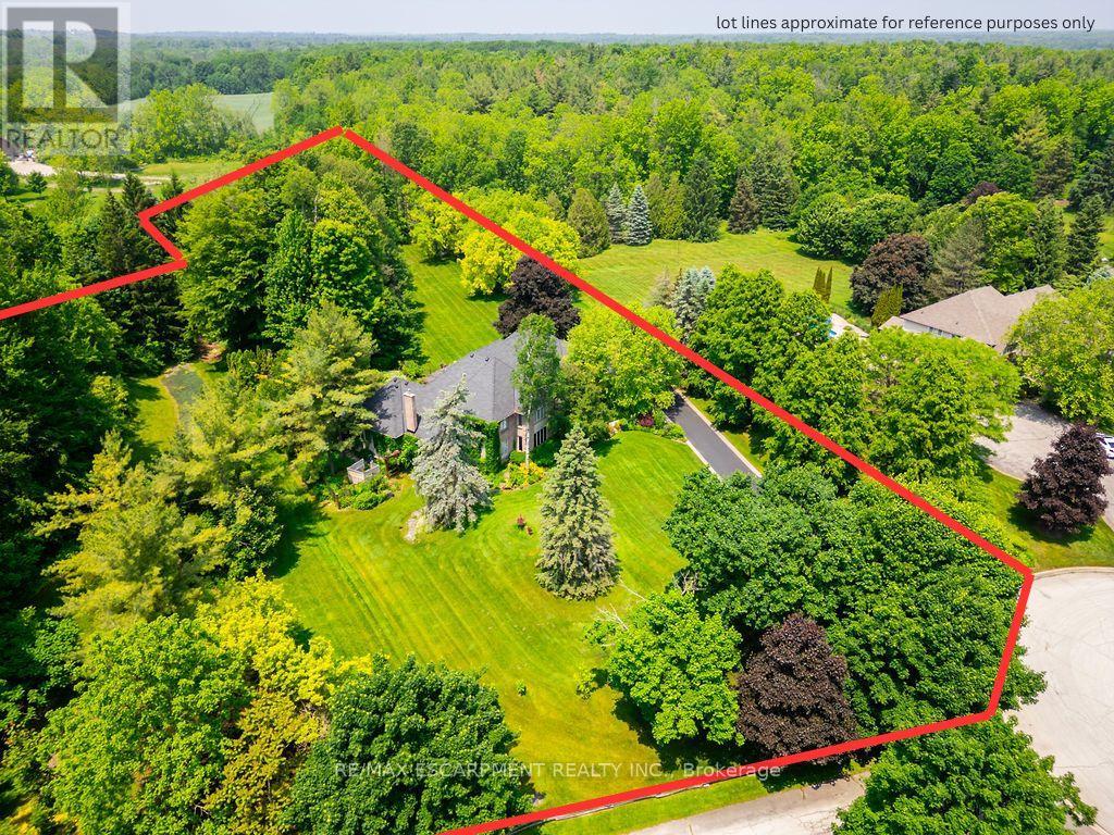 Welcome to 27 Blackberry Place a truly exceptional luxury estate nestled at the end of a prestigious cul-desac in the heart of Carlisle. Set on a sprawling and completely private 2.12-acre lot, this distinguished residence is enveloped by professionally landscaped grounds, featuring curated gardens and a winding driveway. This home offers over 7,791 sq ft, timeless design and modern refinement. The soaring two storey foyer welcomes you, flanked by a formal dining room perfect for hosting, richly appointed wood panelled library with gas fireplace. Light filled updated chefs kitchen with custom cabinetry, soft-close drawers, wood island, marble countertops, high-end appliances, and a generous breakfast room. A soaring great room with vaulted ceilings flows into an oversized sunroom offering panoramic views of the private backyard. Corner office on the main level provides a peaceful work-from-home retreat. The upper level offers a secondary library or office leading into the luxurious primary suite with a spa-inspired ensuite featuring a soaker tub, rain shower, and an expansive dressing room. Three additional spacious bedrooms and 5-piece bathroom complete the second level. The fully finished lower level is an entertainers haven and ideal for multigenerational living or nanny, featuring a private entrance, large recreation and games rooms with built-ins and a gas fireplace, a wet bar with ambient lighting and beverage fridge, a guest bedroom, spa-style bathroom with heated floors, and three oversized storage rooms. Step into the backyard and experience resort-style living. Saltwater gunite pool with cascading rock waterfall, hot tub, expansive deck with pergola, raised vegetable gardens and charming gazebo surrounded by mature trees and lush privacy and acreage. Additional features include an oversized 3 car garage with EV charging capabilities, new furnace (2024), new AC (2024), roof (2019), most appliances (2024). LUXURY CERTIFIED. (id:51158)