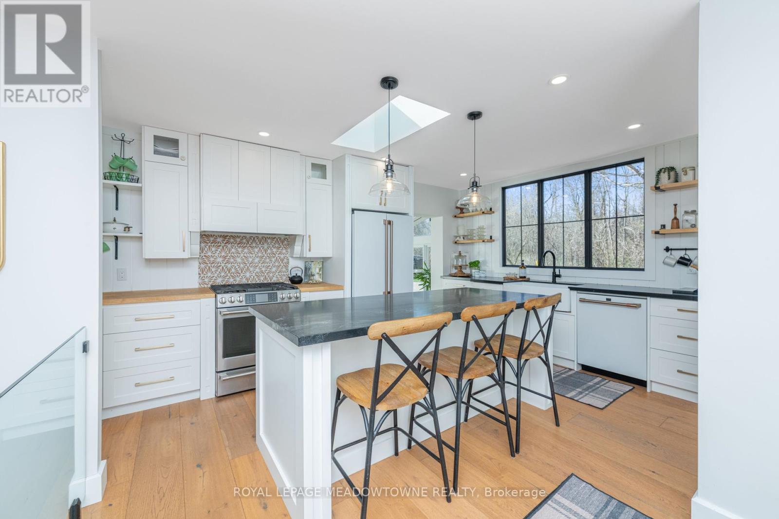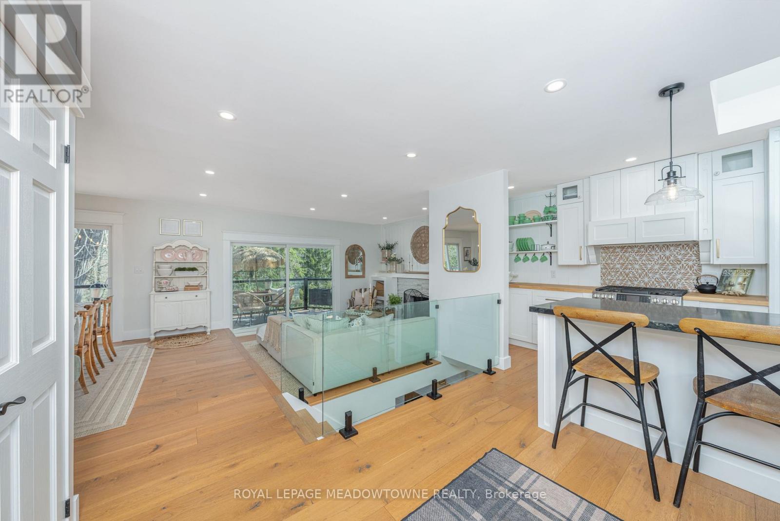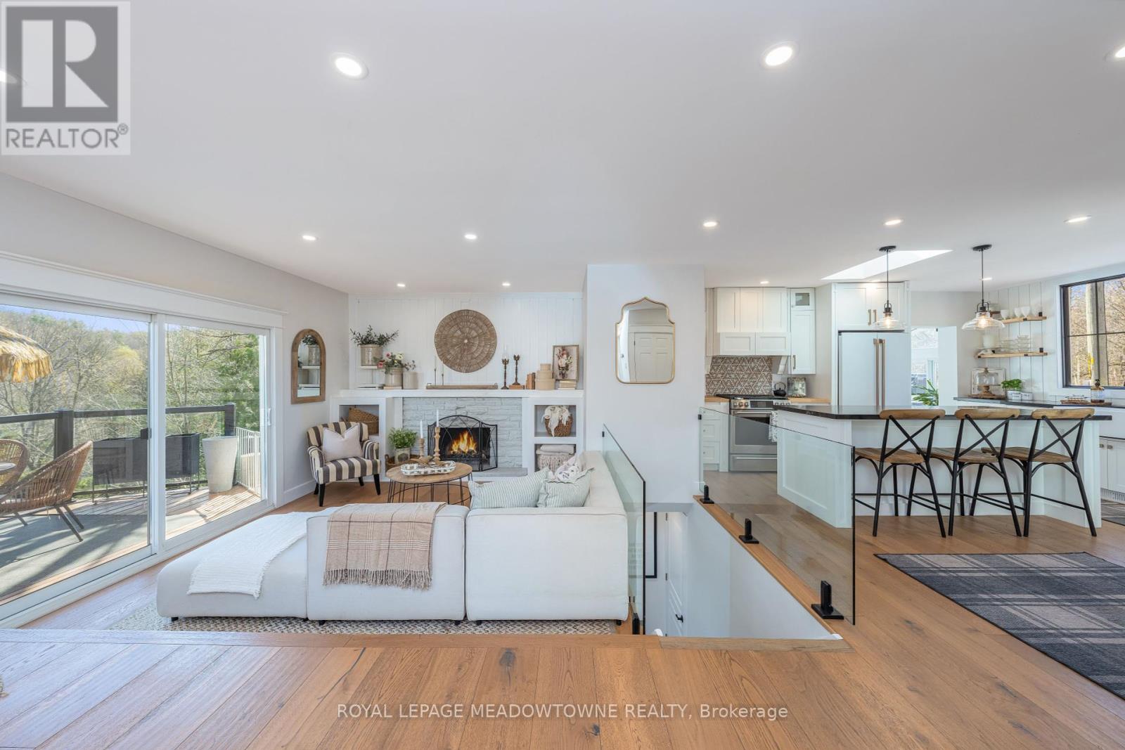 Welcome to this beautifully reimagined 4-bedroom home, privately nestled along a quiet gravel lane in the scenic village of Glen Williams. Set on nearly an acre with uninterrupted, year-round views of the Credit River, this property offers a rare fusion of peaceful nature and modern elegance. Step into the inviting sunroom -- bathed in natural light, its the perfect space to welcome guests, set up a creative home office, or simply relax with a good book. Inside, the main floor features stunning white oak floors and a breezy, open-concept layout that effortlessly connects the kitchen, dining, and living areas -- ideal for both everyday life and memorable entertaining. At the heart of the home, the chef-inspired kitchen combines functionality with elevated design. It boasts top-of-the-line Café appliances, ample cabinetry, and a striking picture window above the sink, framing views of the surrounding landscape. Upstairs, the serene primary suite offers a generous retreat, complete with a contemporary ensuite and space to unwind. Glass railings lead to the fully finished walkout basement, where abundant natural light and luxury vinyl plank flooring create a warm, open ambiance. This level includes a spacious family room, an additional bedroom and full bathroom, plus a versatile workshop area that could easily serve as a guest suite or creative studio. Outside, expansive decks provide a front-row seat to the river's beauty -- perfect for morning coffee, weekend lounging, or evenings under the stars. Offering the best of both worlds, this secluded escape is just seven minutes from the Georgetown GO Station, putting city access within easy reach while enjoying the charm and tranquility of Glen Williams. (id:51158)