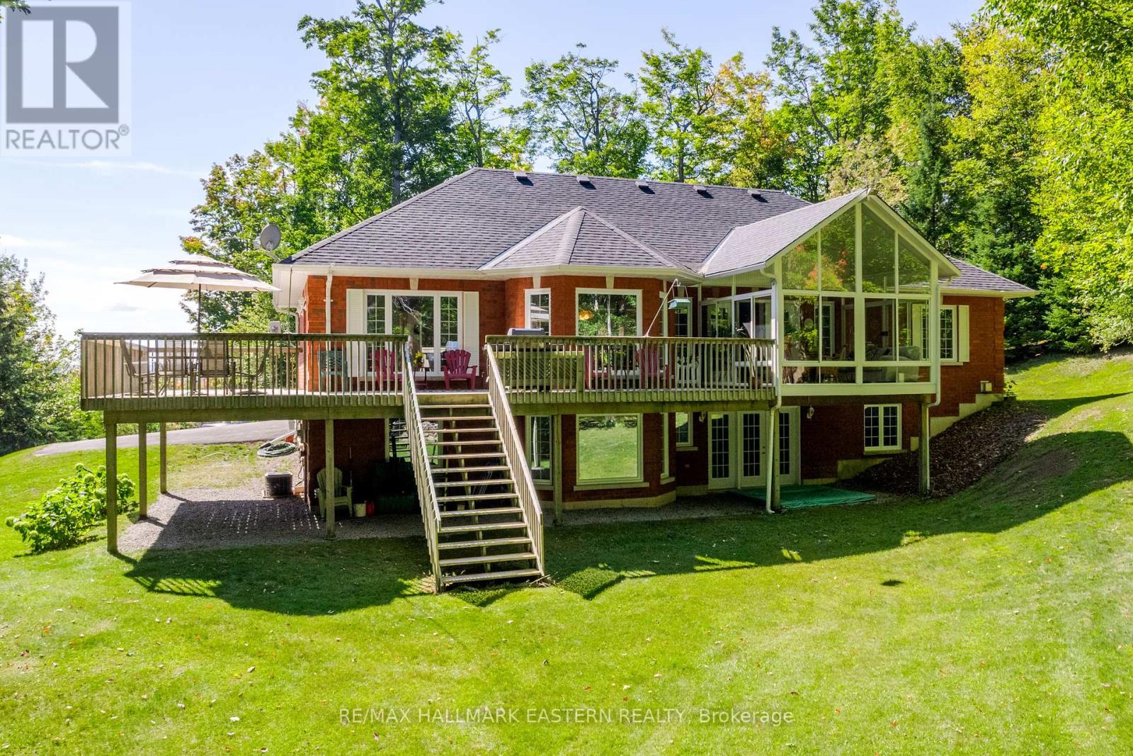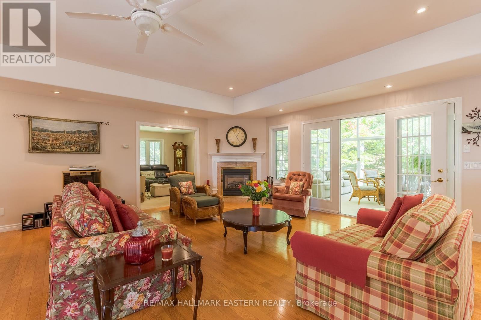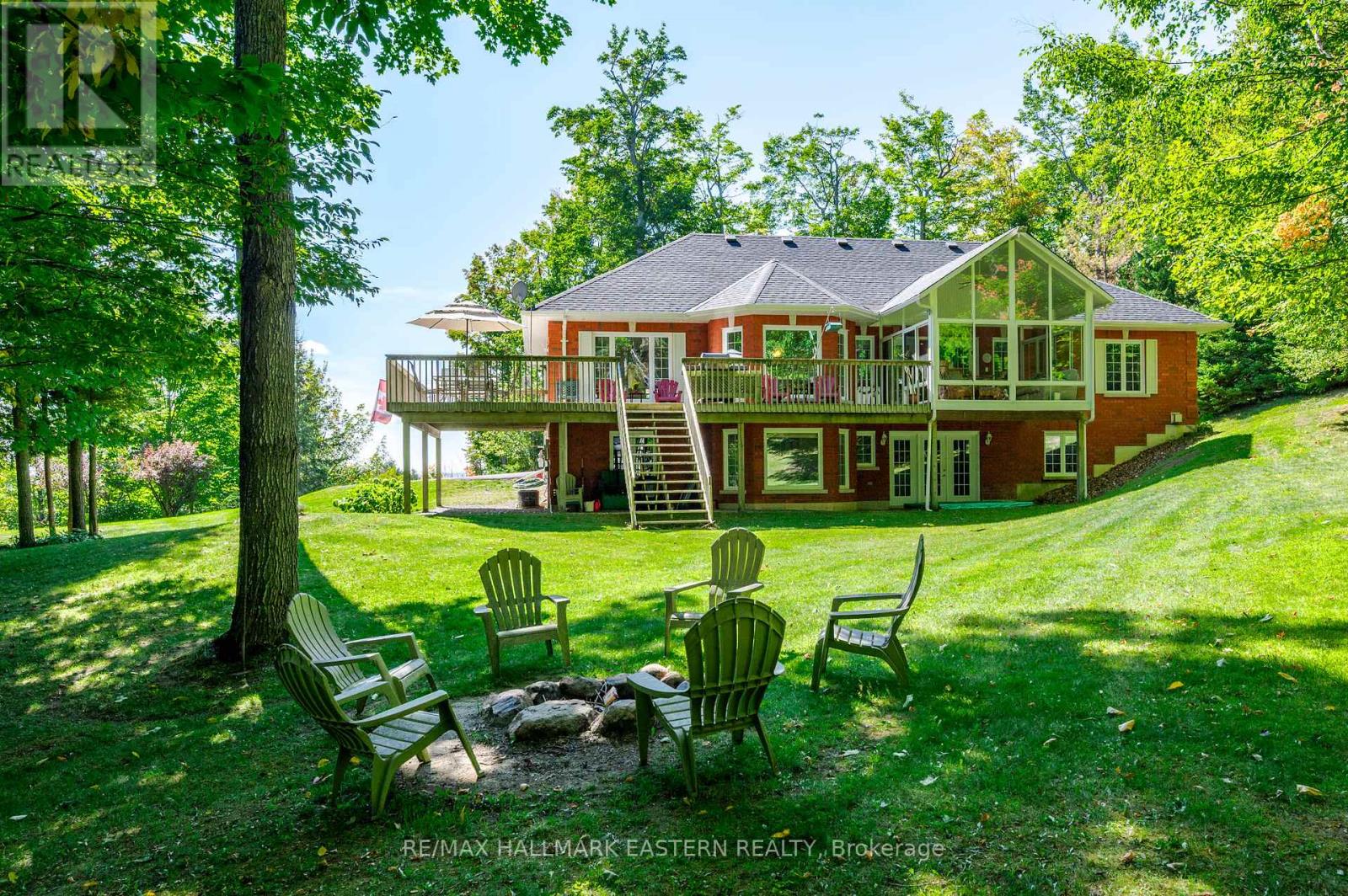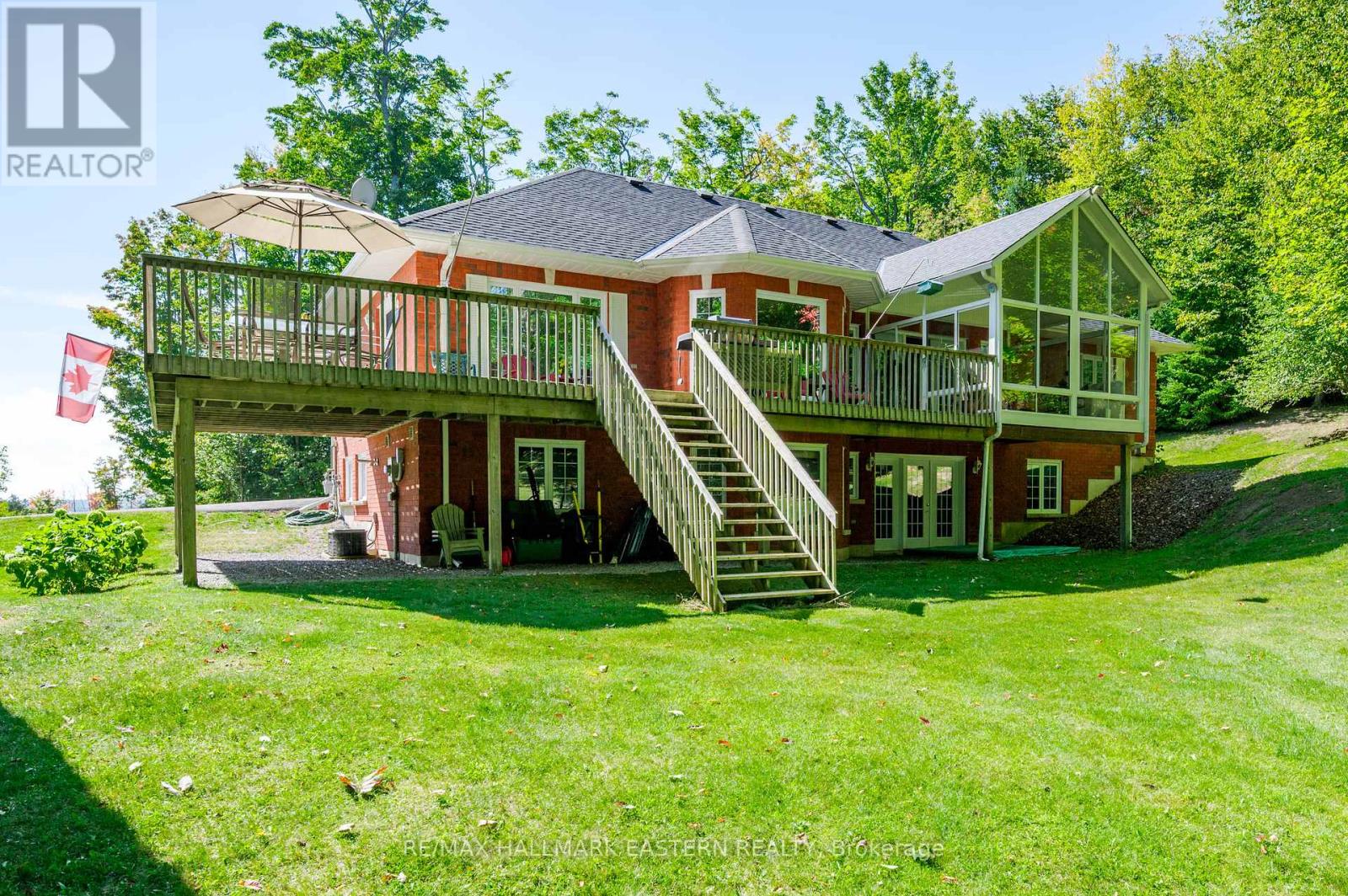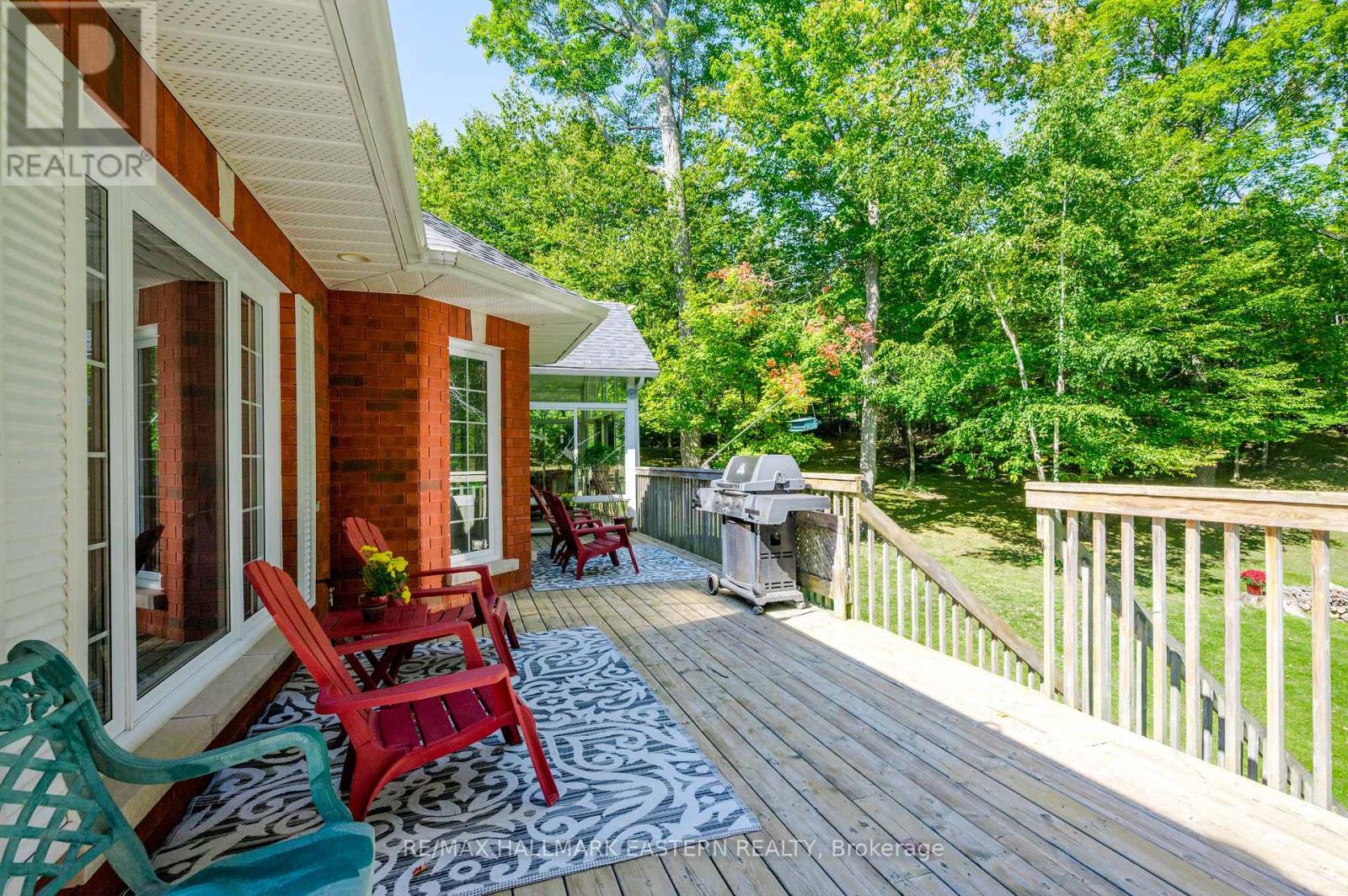 Welcome to this custom-built, all-brick executive bungalow, offering nearly 4,000 sq ft of impeccably designed living space on a breathtaking treed and landscaped property. Privately set surrounded by nature, this residence blends refined elegance with everyday functionality. Step inside to a sun-filled, open-concept great room, where tray ceilings and a cozy gas fireplace set the stage for gatherings. The adjoining formal dining area flows seamlessly into the gourmet eat-in kitchen, complete with a centre island, built-in wine racks, and thoughtful finishes tailored to the culinary enthusiast. A wall of windows draws you into the three-season sunroom, a serene retreat with a walkout to the expansive wrap-around deck perfect for soaking in the beauty of the surrounding landscape. The primary suite is private featuring 5-piece ensuite with heated floors, a walk-in closet, and another walkout to the deck. A second bedroom enjoys private access to the main 4-piece bath, while a versatile den/office, convenient 2-piece powder room, and main-floor laundry add to the homes thoughtful design. The triple-car garage is fully insulated and accessible through the mudroom, offering convenience. The lower level recreation room features a second gas fireplace, and games area with pool table perfect for entertaining. The third bedroom connects to 3-piece bath. Another walkout takes you directly to the landscaped backyard oasis. This remarkable property offers privacy, tranquility, and beauty at every turn. Mature trees, curated gardens, and abundant wildlife create a peaceful backdrop for daily living, making this an ideal home for those who value both style and serenity. Bethany is a picturesque village known for its rolling hills, trails, and warm community feel. With quick access to Highway 7A and 115, commuters will appreciate the easy connections to Peterborough, Durham, and the GTA. (id:51158)