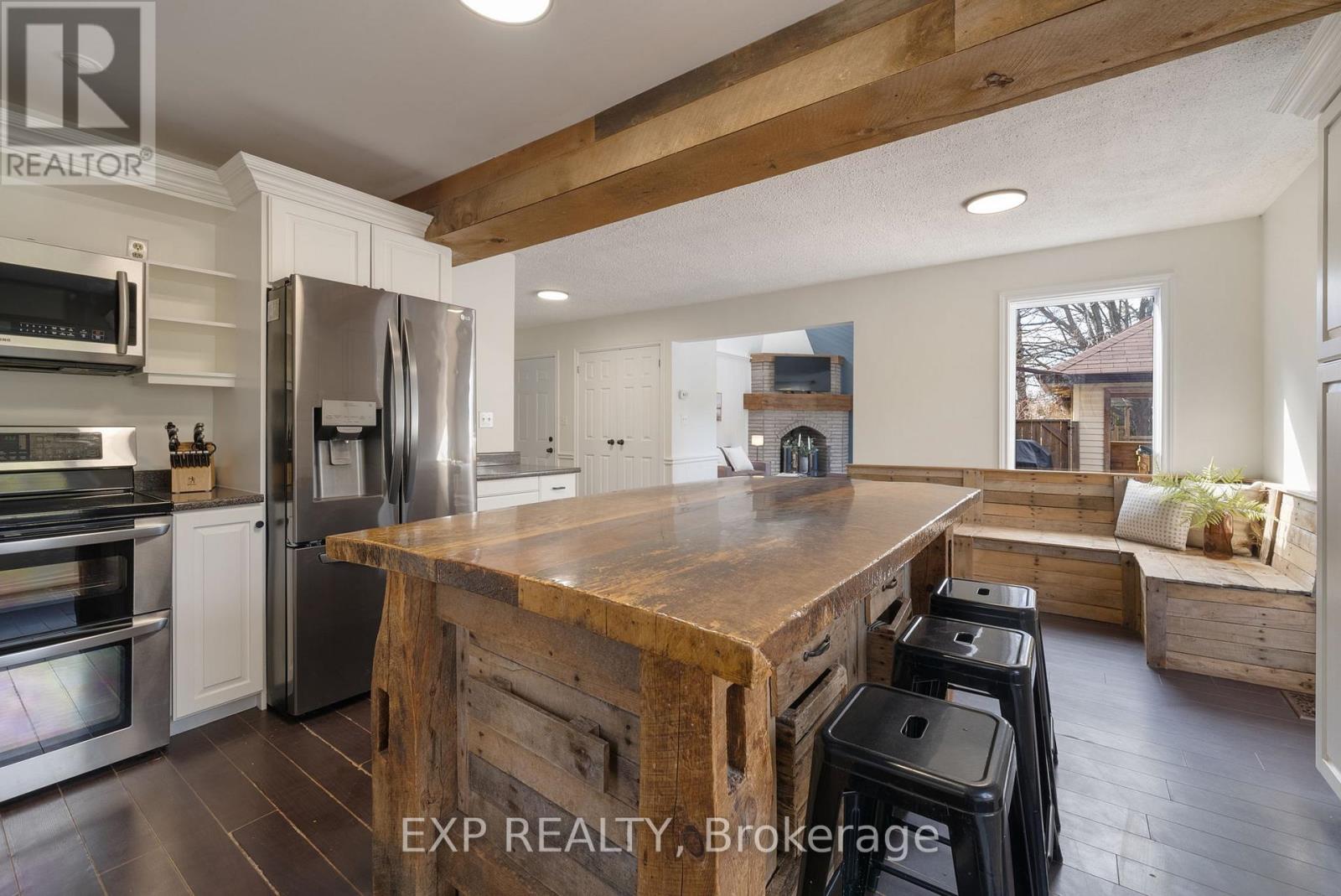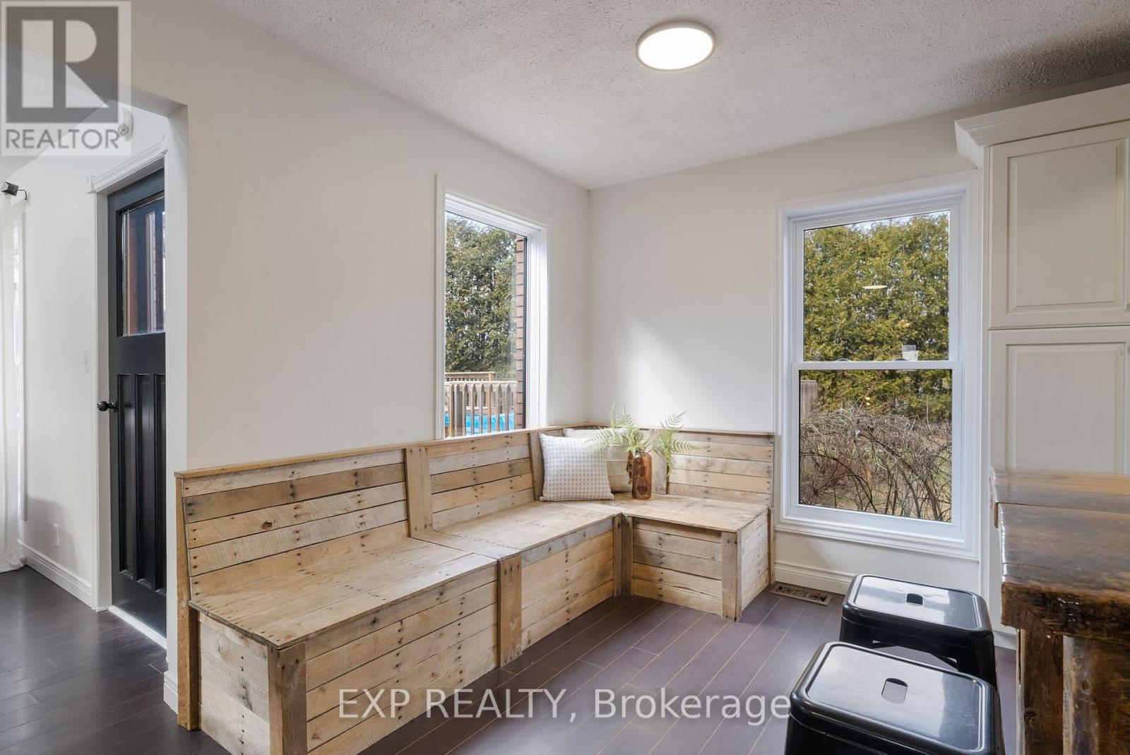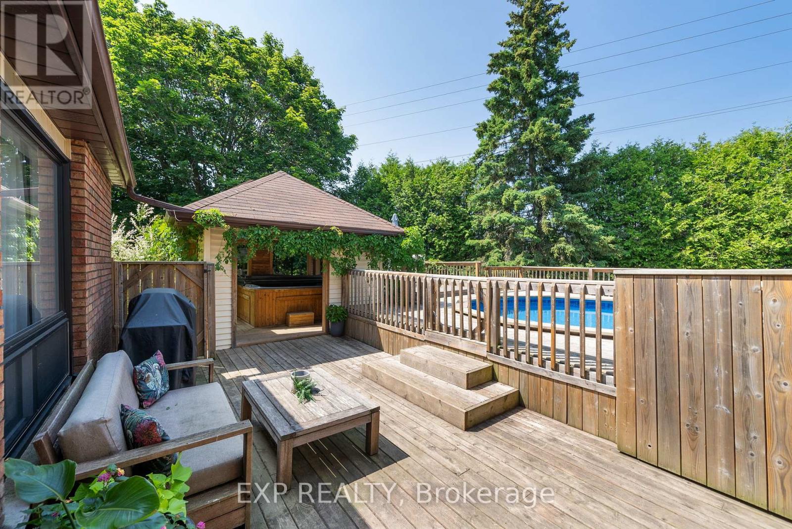 This warm and welcoming 3+1 bedroom, 2 bathroom home is full of character and ideal for family living. Featuring a lofted ceiling in the living room, a kitchen with freshly painted cabinets, reclaimed wood island, and built-in seating, plus a large formal dining room perfect for entertaining. Upstairs, you'll find three bedrooms and a Jack & Jill ensuite, while the finished basement adds a rec room and additional bedroom perfect for guests or a home office. Set on a large corner lot at the end of a quiet cul-de-sac, this property is an outdoor lovers dream, complete with a deck overlooking an above-ground pool, new roof (2025), hot tub gazebo, kids play structure, fire pit, backyard orchard and even a chicken coop! With ample driveway parking and main floor laundry, this home blends function, charm, and fun. (id:51158)