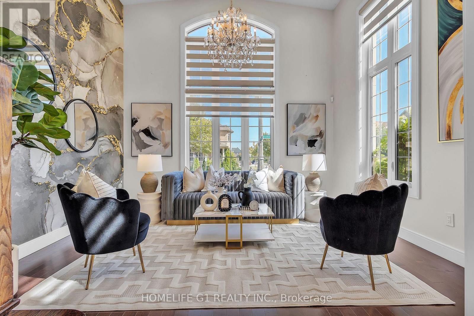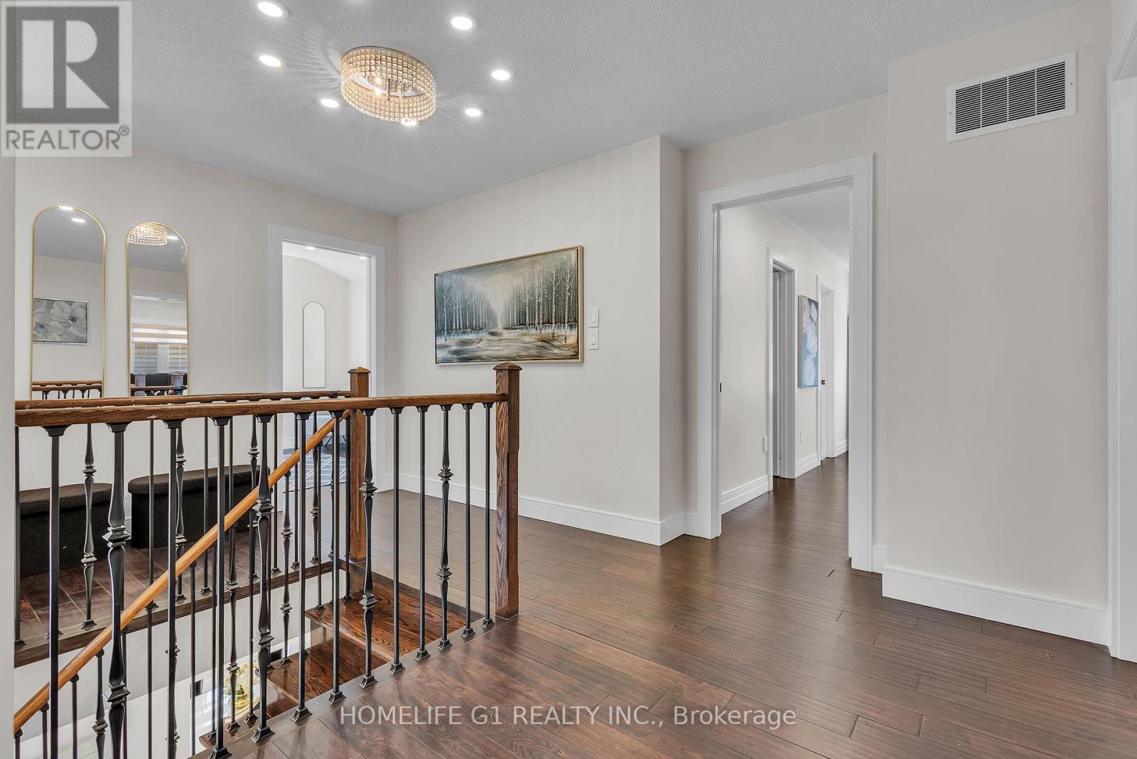 This fully upgraded home has 4500 sq. ft. of total living space on a premium corner lot with a backyard stretching 58 feet wide. This home welcomes you with a grand foyer and soaring 15-ft ceilings in the living room, framed by oversized bay windows that fill the space with natural light. The main floor showcases 24x24 marble flooring, custom metal picket railings, and over 100 pot lights across the main and second levels. A formal accent wall dining room with double door entry provides an elegant setting for entertaining, while the gourmet kitchen features three-inch granite countertops, built-in appliances, upper cabinet lighting, and spacious breakfast area. The kitchen flows into the family room, where another accent wall and fireplace create the perfect space for gatherings. Completing the main level are electric-powered blinds throughout and a full 3-piece bathroom with a stand-up shower. Upstairs, hardwood flooring runs throughout, with four generous bedrooms including a primary retreat with a 5-piece ensuite, a junior suite with its own ensuite, and two bedrooms sharing a jack-and-jill. The fully finished basement adds over 1,200 sq. ft comprised of three bedrooms, a 3-piece ensuite, abundant storage, and 60 additional pot lights. Exterior upgrades include a light brick and stone façade, exterior pot lights, and double side entries, completing this rare offering in one of Oakville's most desirable neighborhoods. (id:51158)