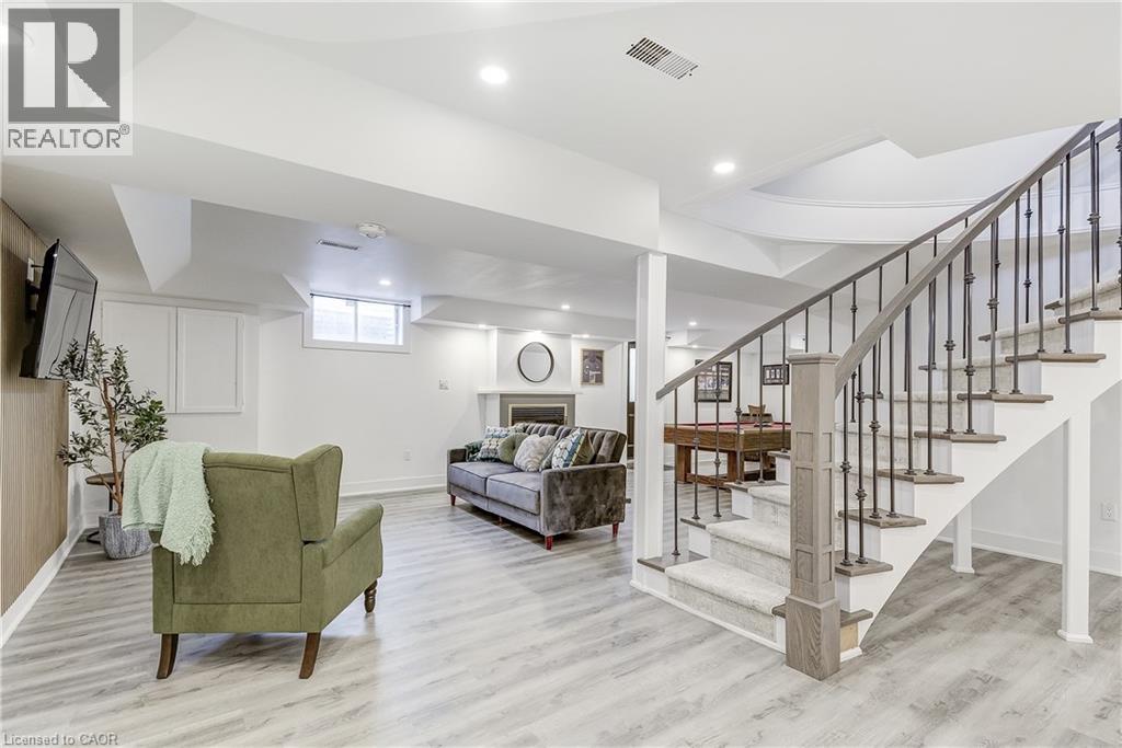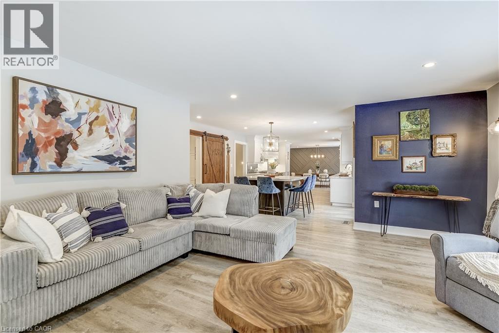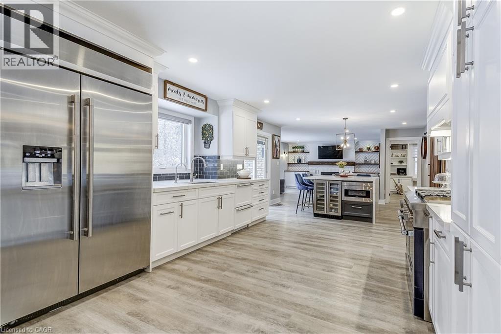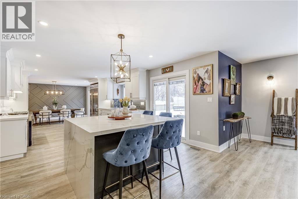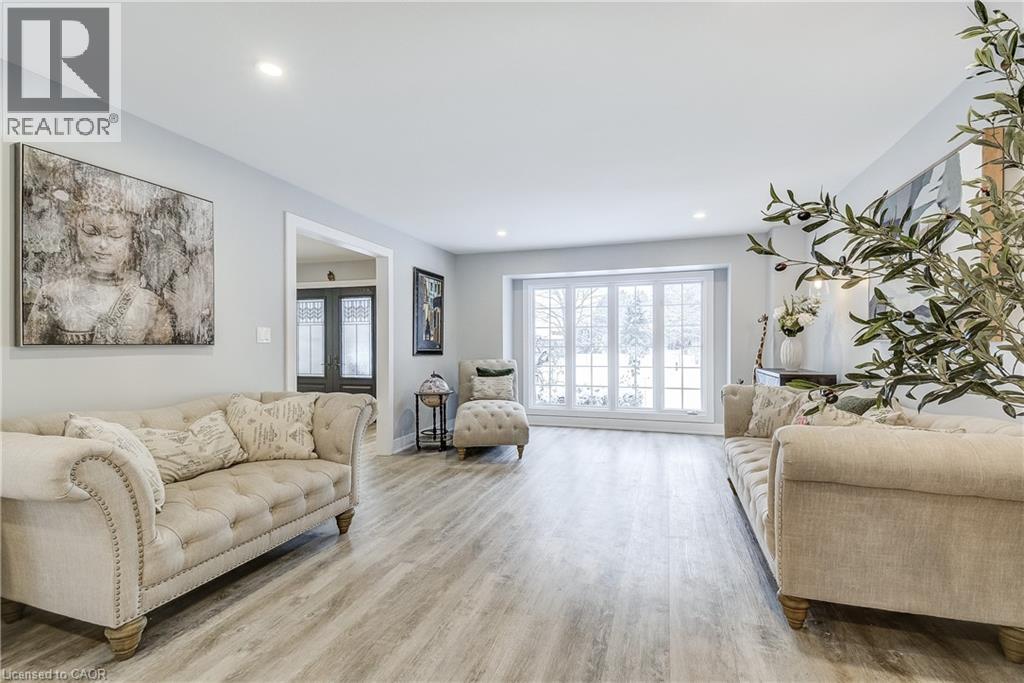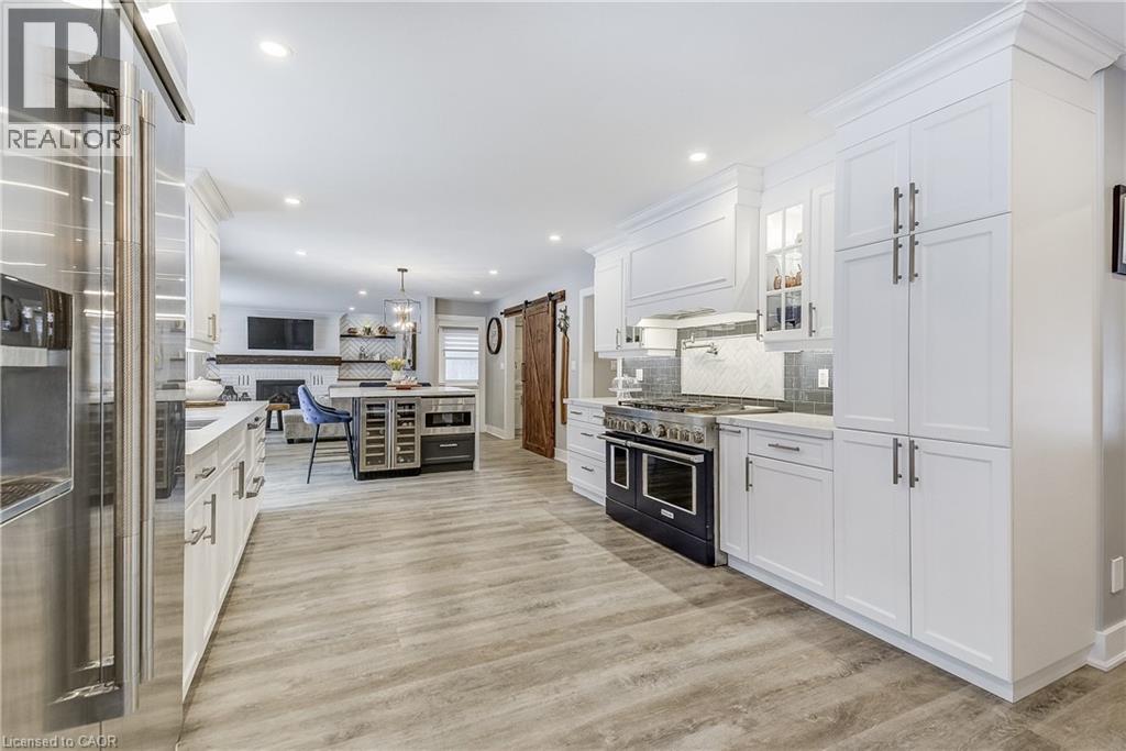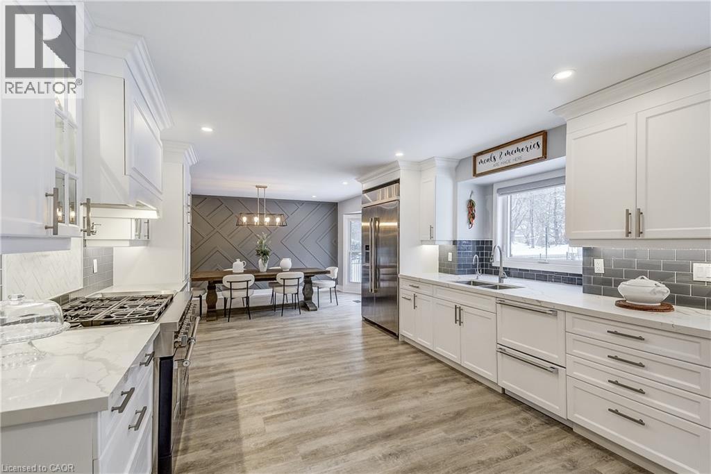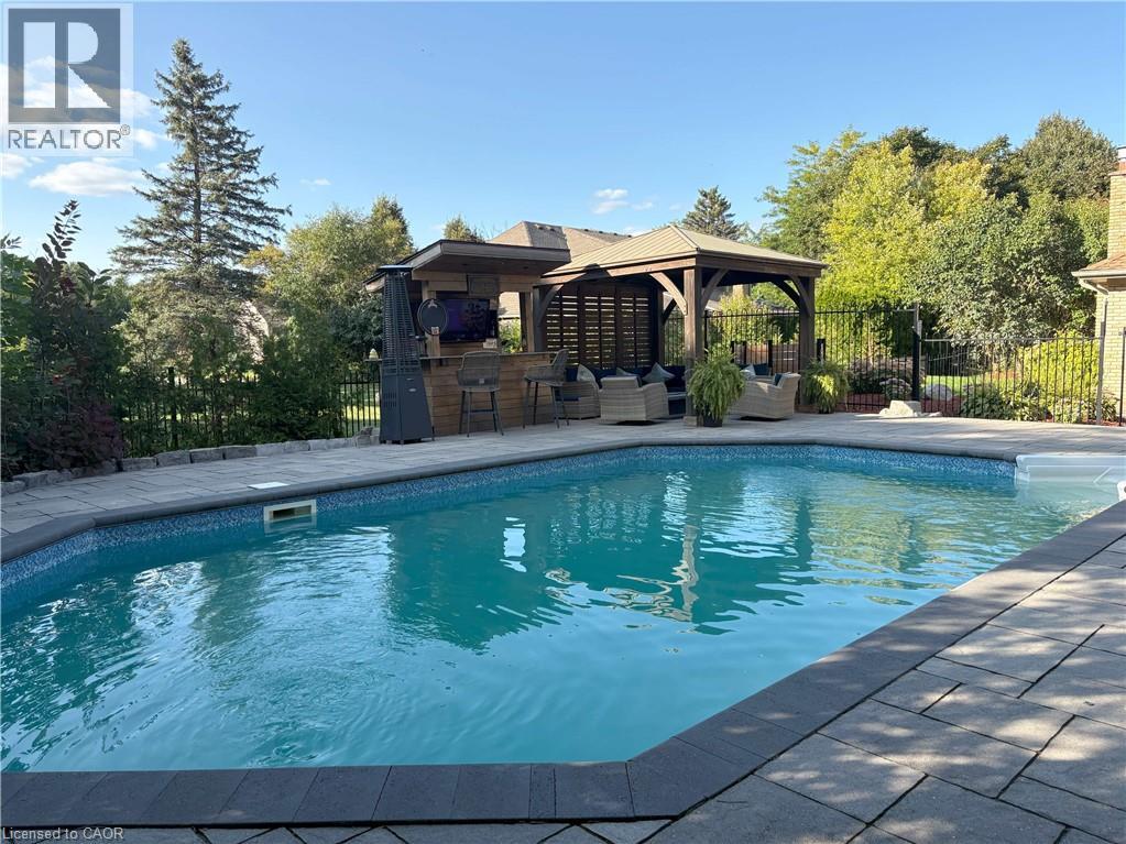 Beautifully renovated 3,145 sq. ft. family home nestled on a quiet court in the highly desirable community of Carlisle, situated on a peaceful half-acre lot. Bright, immaculate, and thoughtfully designed, this home offers an ideal layout for everyday living and entertaining. The main floor showcases a chef-inspired kitchen with quartz countertops, an expansive island, an oversized gas stove with electric oven, a full-size 48 refrigerator, and a built-in microwave, seamlessly open to the family room with a warm gas fireplace. Formal living and dining rooms, along with a private office, complete the main level. The upper level features four spacious bedrooms, highlighted by an impressive primary suite with a large walk-in closet, spa-style ensuite, and electric fireplace. The finished basement includes a separate entrance and excellent in-law potential, offering a generous rec room with gas fireplace, a fifth bedroom, full bathroom, sauna, utility room, and cold room. Step outside to a private backyard retreat featuring an on-ground pool and tiki bar, perfect for hosting and relaxing. Move-in ready, impeccably maintained, and privately set, this exceptional home presents a rare opportunity in one of Carlisle’s most sought-after locations. Welcome Home! (id:51158)