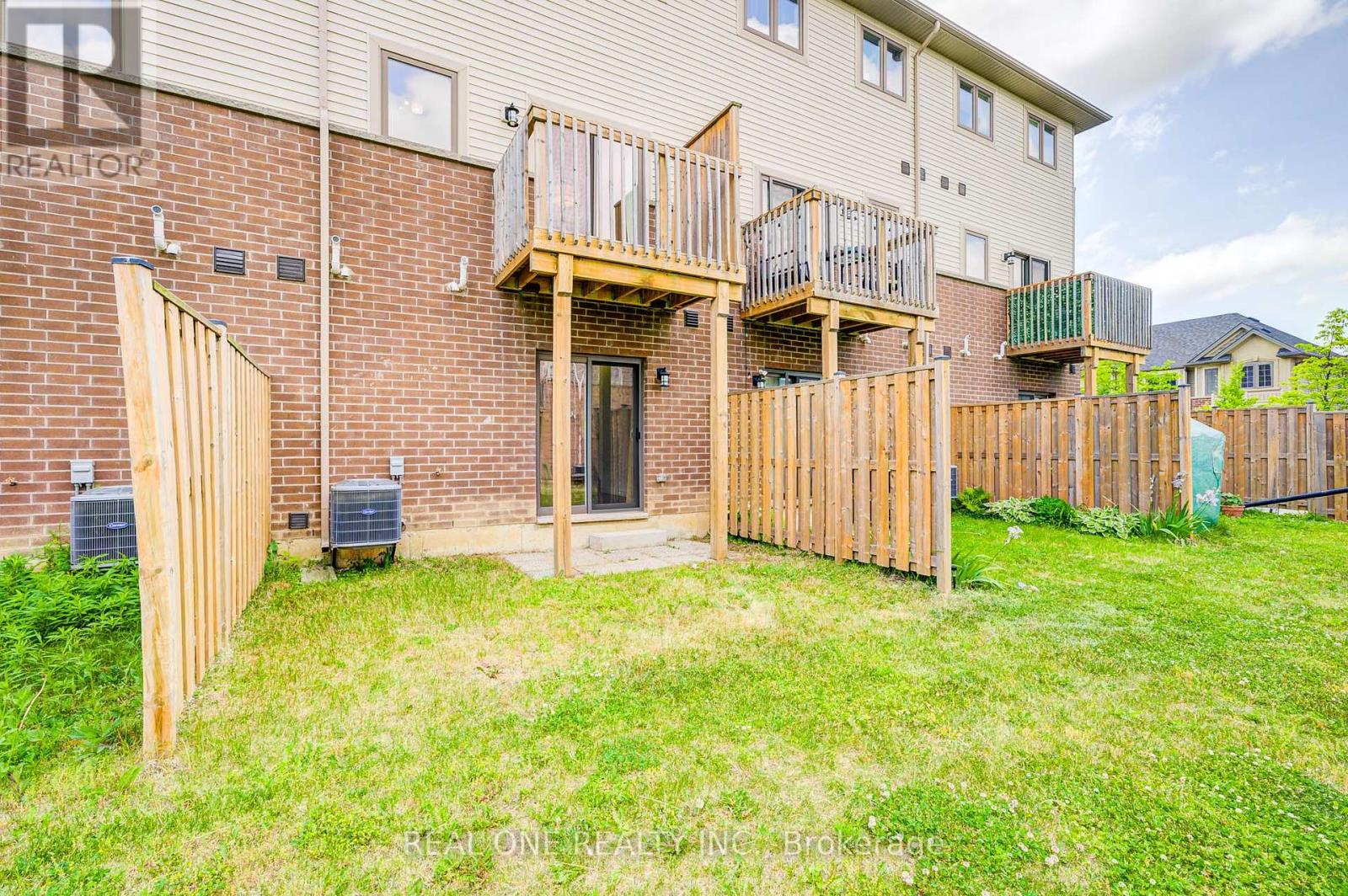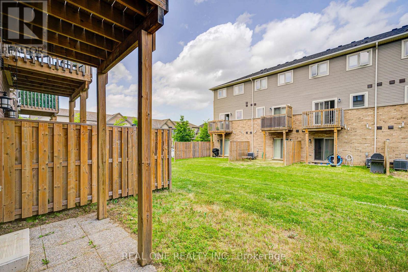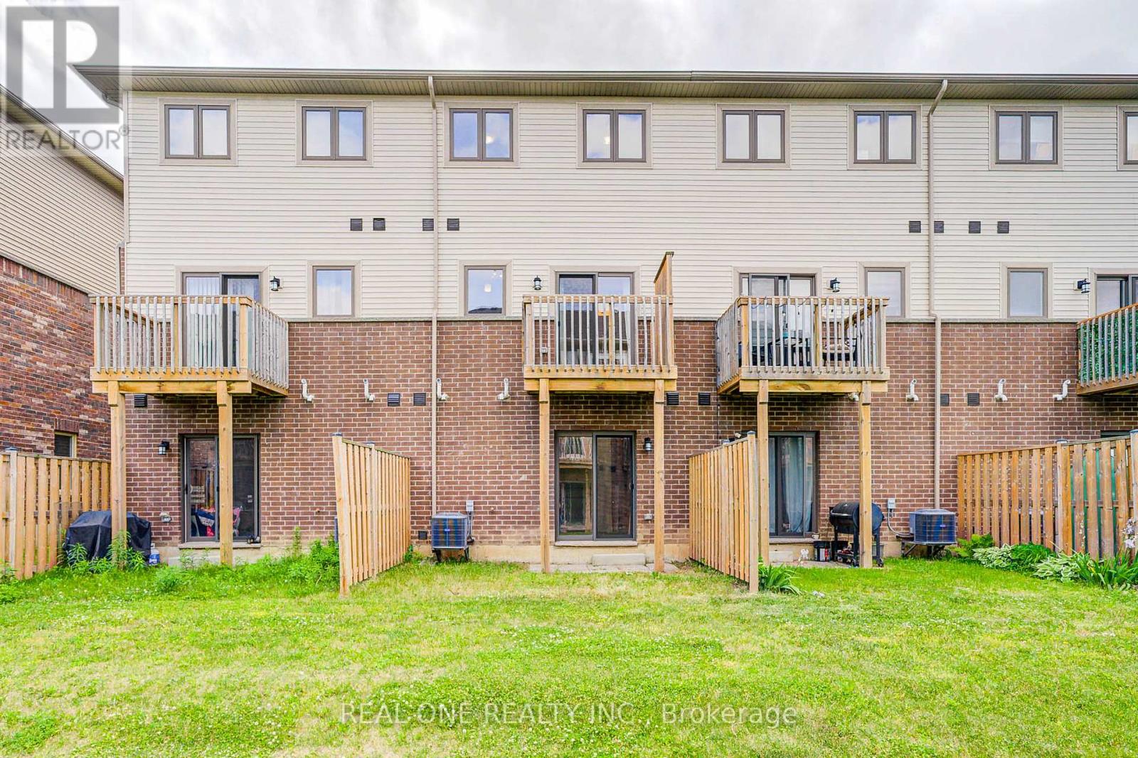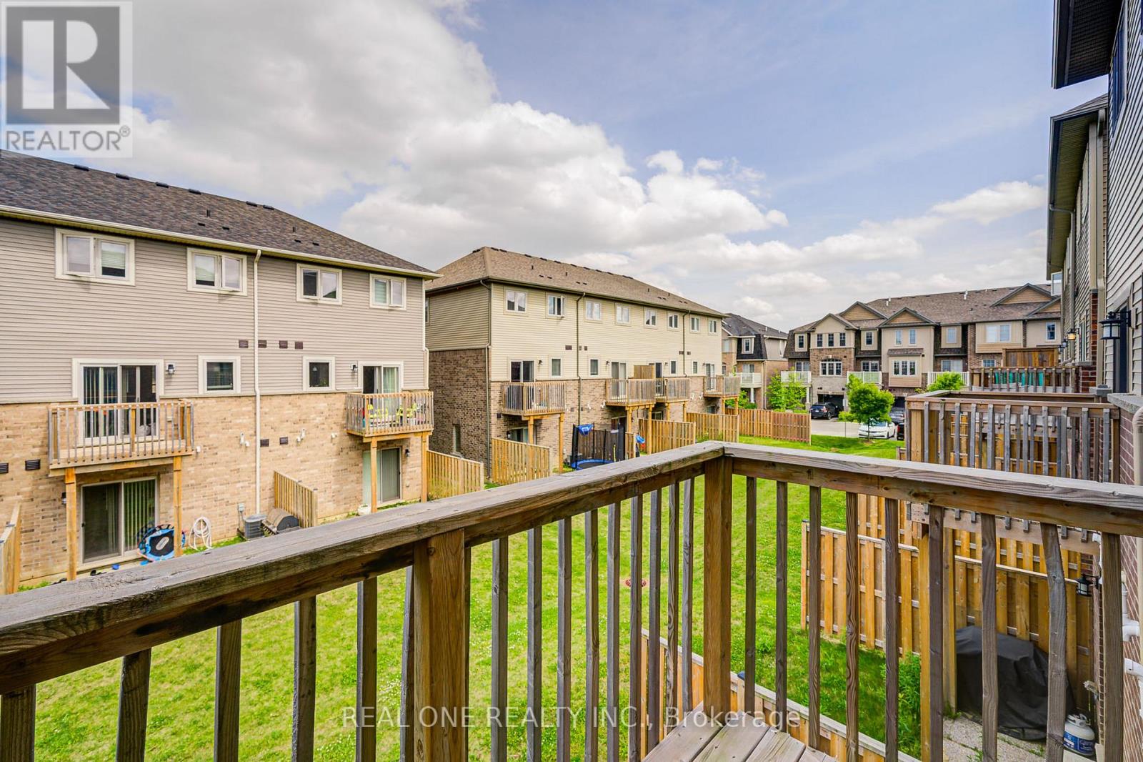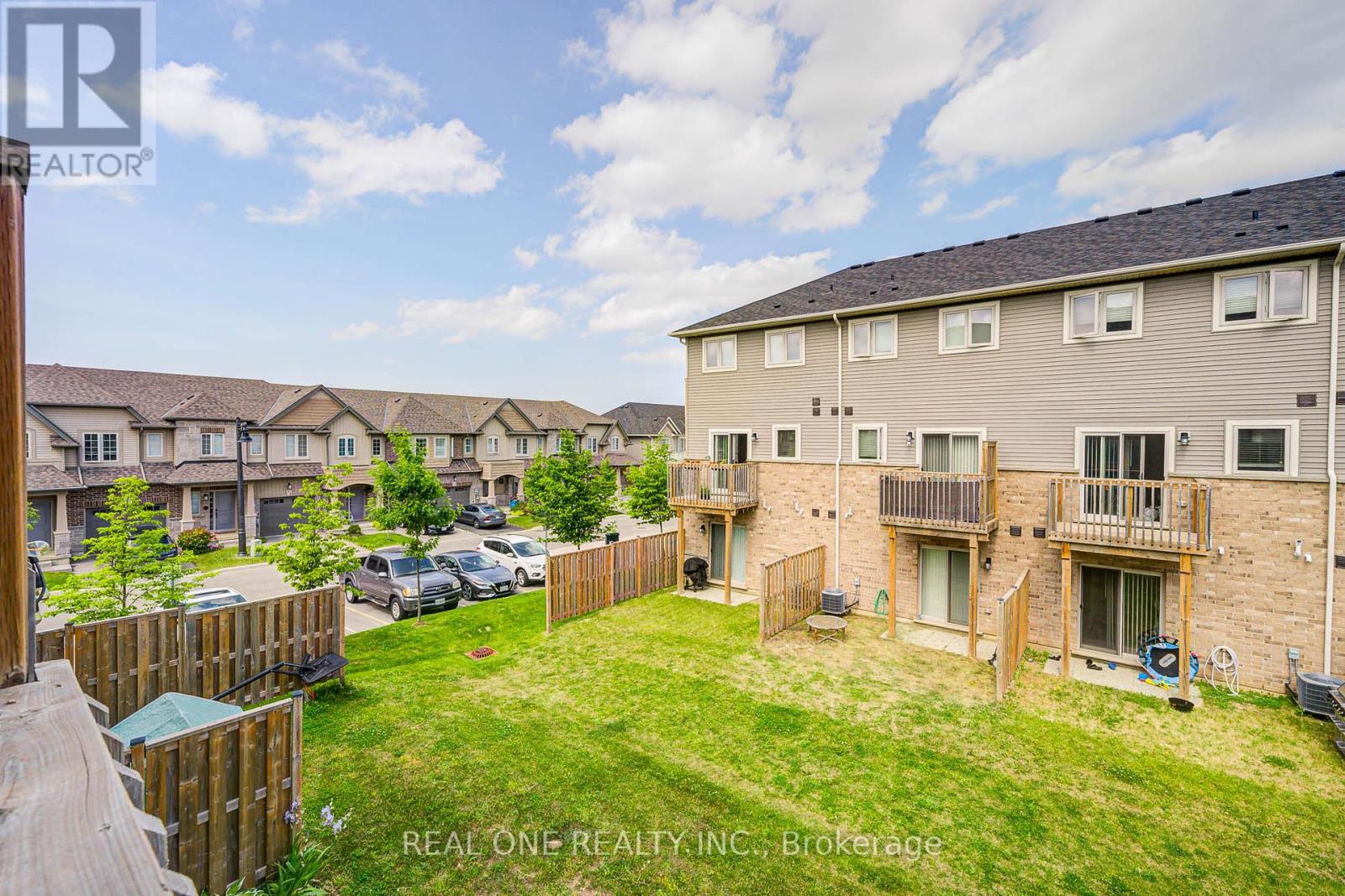 Welcome to this beautiful 3-bedroom, 2.5-bathroom freehold townhome built by Marz Homes, ideally located in the highly desirable Ancaster Meadowlands community. Spanning three levels, this sun-filled west-facing home features 9 ft ceiling, an open-concept living area w/ abundant natural light, contemporary eat-in kitchen with dark stained hardwood cabinets, stainless steel appliances, and a spacious dining room with walkout to a private balcony-perfect for enjoying your morning coffee.The primary suite offers a luxurious 4-piece ensuite and a generous walk-in closet. Two additional bedrooms share a well-appointed 4-piece bathroom. The ground-level walkout basement includes a versatile den ideal for a home office or children's playroom with direct access to the backyard.Enjoy the convenience of walking to Tiffany Hills Elementary School, a nearby neighborhood park, and being just minutes from Costco, shopping plazas, highways, and McMaster University.Low monthly road fee: $89. (id:51158)