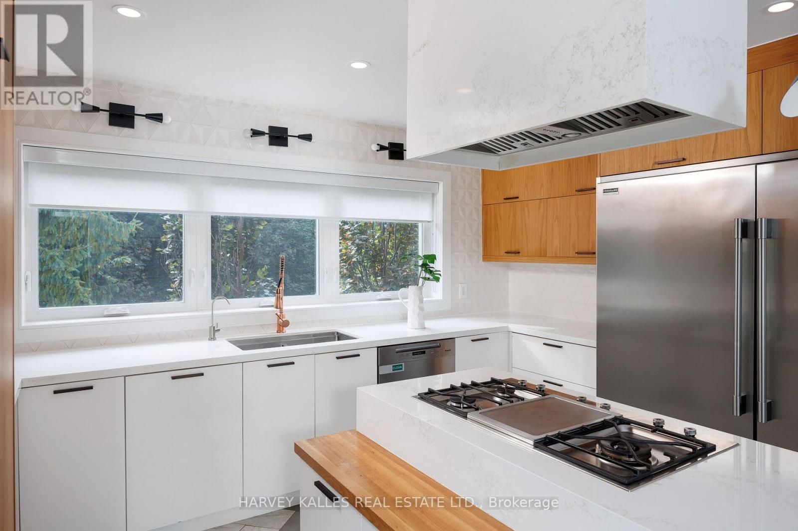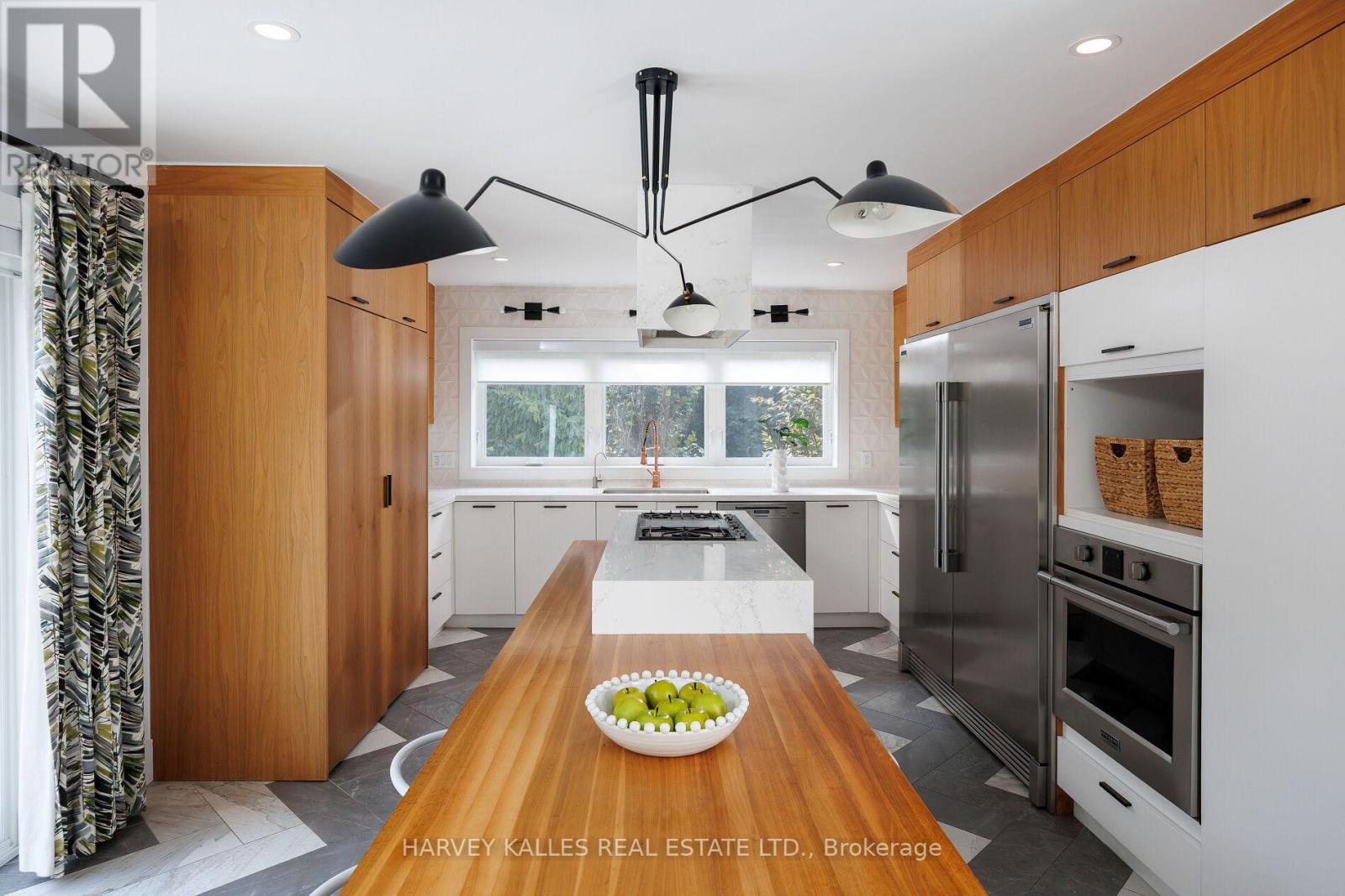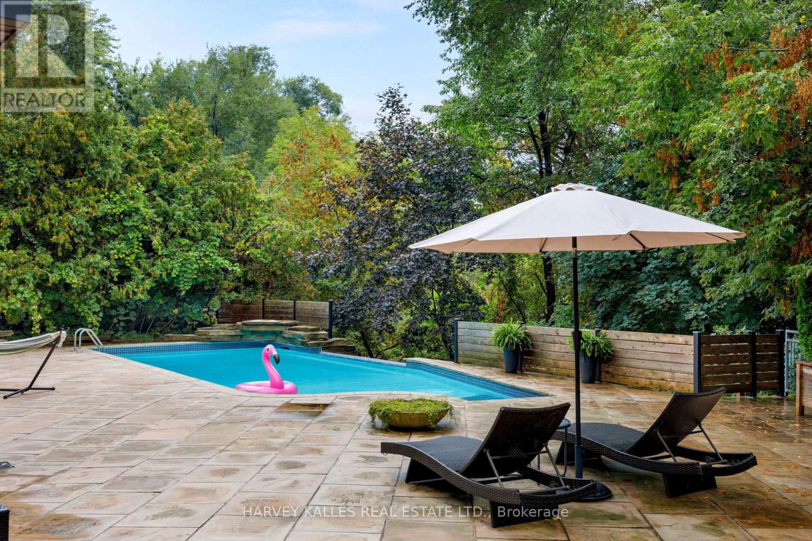 Say yes to the absolute best; this Markland Wood mid-century modern home is the pinnacle of style and comfort with unique details and a timeless aesthetic. Modern living and beautiful mid-century modern architecture? Check! Close to every amenity imaginable? You've got it! A beautiful backyard paradise on a ravine lot and an inground pool that makes you feel like you're on a tropical vacation every day, all day? Naturally. A brand-new mud room with direct access to the garage and side entrance? Oddly specific ask, maybe but yes, that too! Your new dream house offers so many perks that you may never need to board an airplane again. Designed by Award Winning Architect, Anthony Ferracuti (Global Architects), this 4+1 bedrooms, 3.5 bathrooms, plus a half bath home provides room to spare. The eat-in kitchen comes with professional-grade Frigidaire and Miele appliances, while a walkout basement makes entertaining a breeze, with its own kitchen, dining area, lounge spaces and sauna. Community features include Neilson Park Creative Centre, Markland Woods Golf Club, and walking/bike trails along the Etobicoke Creek Ravine (and CF Sherway Gardens, of course!) The home is also in the catchment area of top-rated schools, including St. Clement Catholic School. With an oversized pie-shaped lot, opportunities for outdoor enjoyment open up. This home was made for making memories. With an expansive primary bedroom complete with its own sitting area and a four-piece ensuite, it's hard to pick a favourite feature in this glorious oasis. This is your perfect home for everyday luxury. (id:51158)