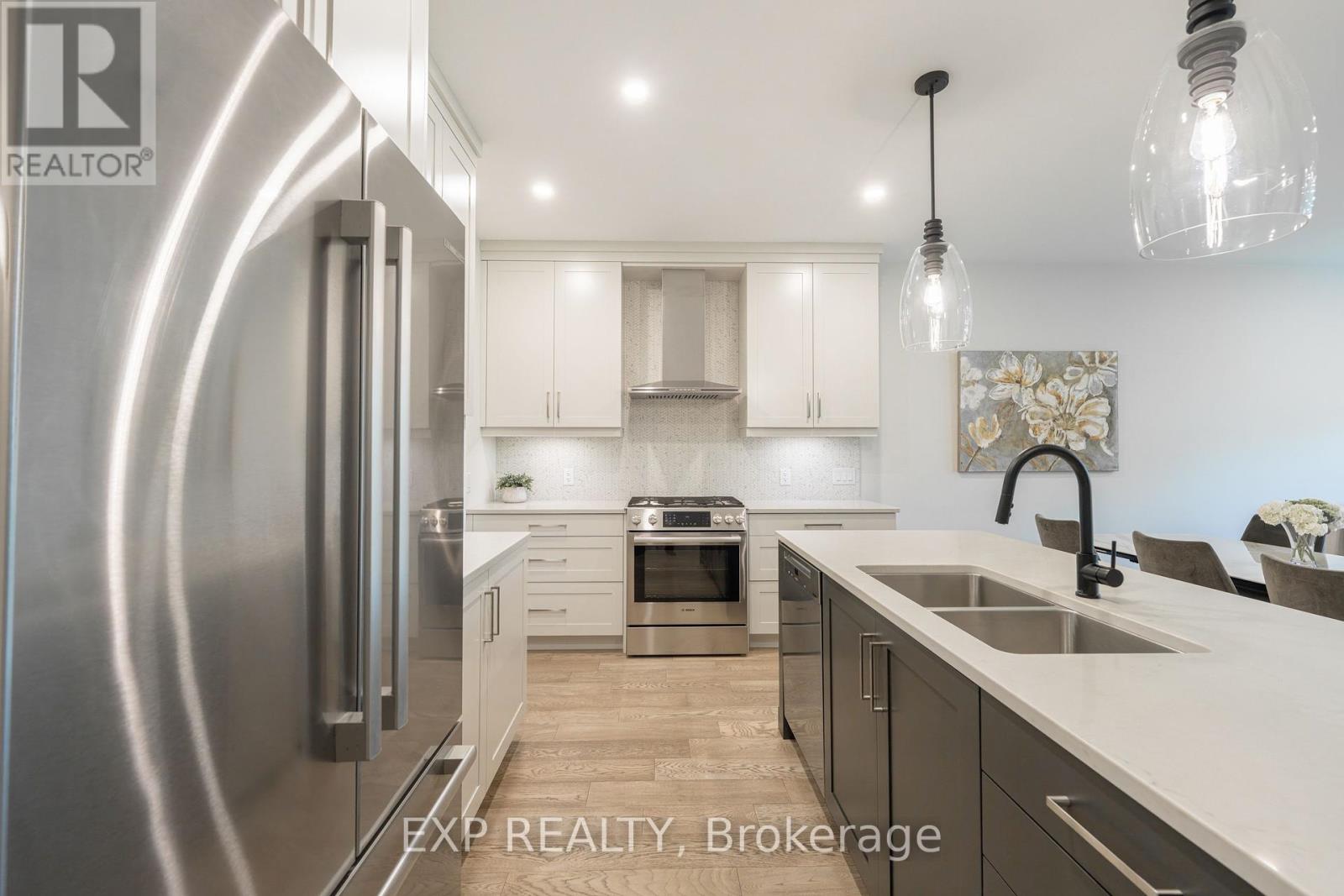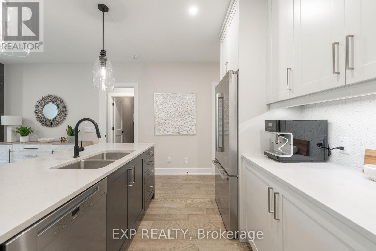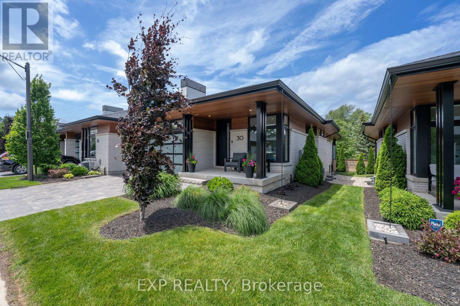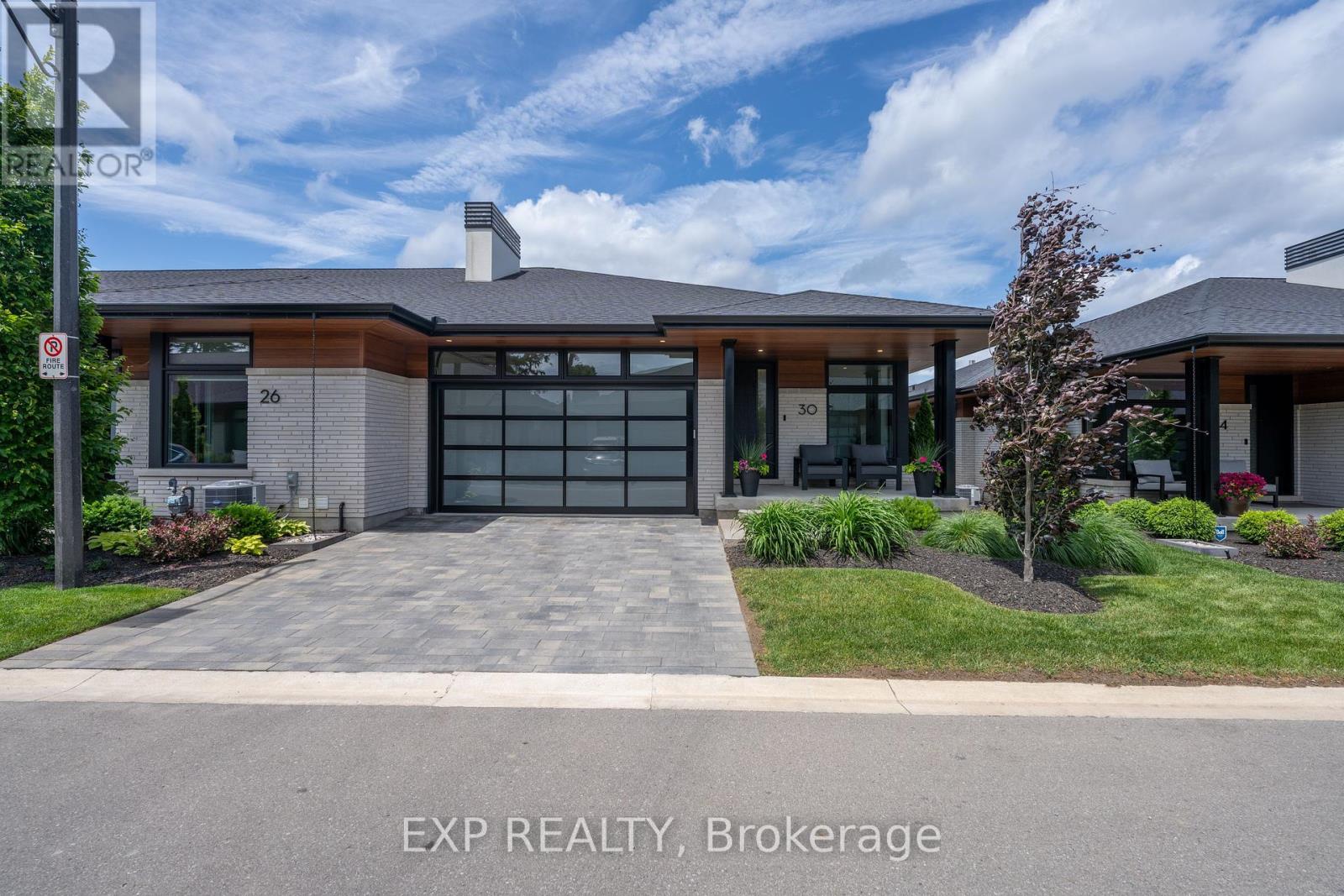 MLS# X12241302 – FOR SALE : 30 Peach Tree Common 437 – Lakeshore St. Catharines – 4 Beds, 3 Baths Row / Townhouse ** Luxury bungalow townhome located in “The Orchard”, an exclusive community built by Rinaldi Homes. This exceptionally built & designed end unit in the desirable North End of St. Catharines is only a few minutes walk to Lake Ontario, beautiful water/walking trails & the quaint Port Dalhousie. The private backyard is serene – with views of mature trees you feel as though you are nestled in your own secluded retreat. Views of the lush greenery can be seen from the main living area, primary bedroom or outdoors on the private covered composite-wood back deck & lower-level interlock terrace. You can also take in the tranquil setting from the spacious covered front porch. Inside, an expansive & elegantly tiled foyer leads to an open concept kitchen, dining & living room space. The kitchen is a dream – with a walk-in chefs pantry, quartz countertops, high-end stainless-steel appliances & large island. The living room features a stunning floor to ceiling tiled gas fireplace. The primary bedroom is appointed with a custom designed walk-in closet & elegant ensuite with quartz countertop, double sinks & tiled glass shower. The main floor also has an efficiently designed laundry room, additional bedroom/office space, 4-piece bathroom & white-oak engineered hardwood & tile flooring throughout. The basement is designed for entertaining & relaxing; enjoy a custom designed wet bar, recreation area, cozy fireplace, two additional bedrooms, 3-piece bathroom & large storage room. Additional features include whole home water & air purification systems, window shades that can be controlled via remote, double car garage, separate gas hookups to BBQ & fire pit. Located just a short stroll or drive to numerous & convenient amenities, QEW Highway & the charming Niagara-on-the-Lake with its renowned wineries, restaurants, shops & Shaw Festival Theatre. This is a rare opportun ** 30 Peach Tree Common 437 – Lakeshore St. Catharines **