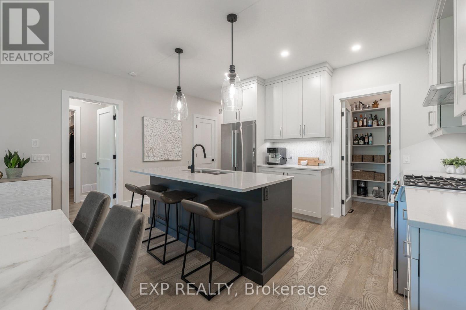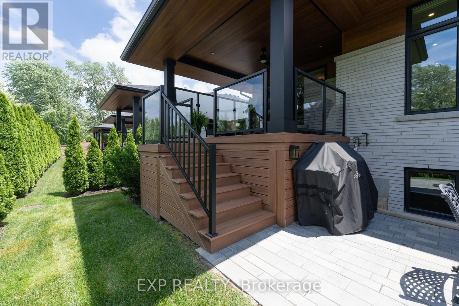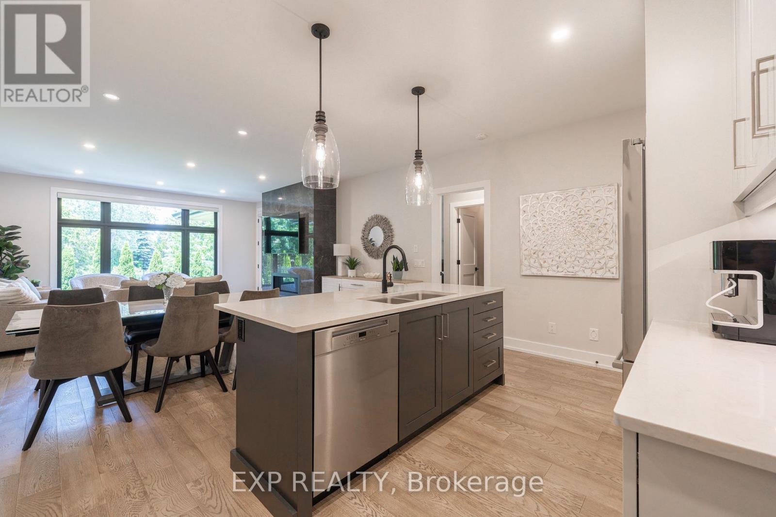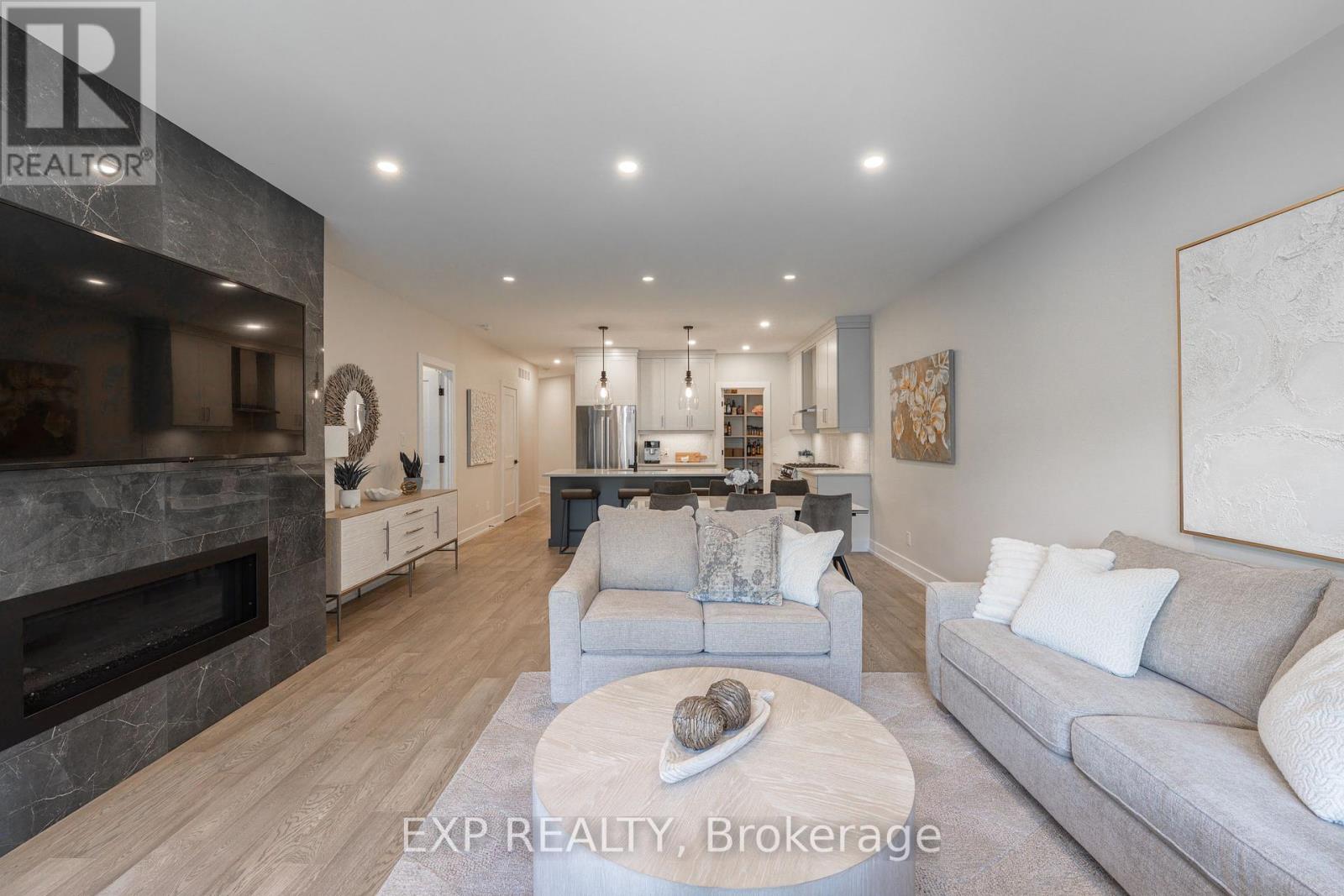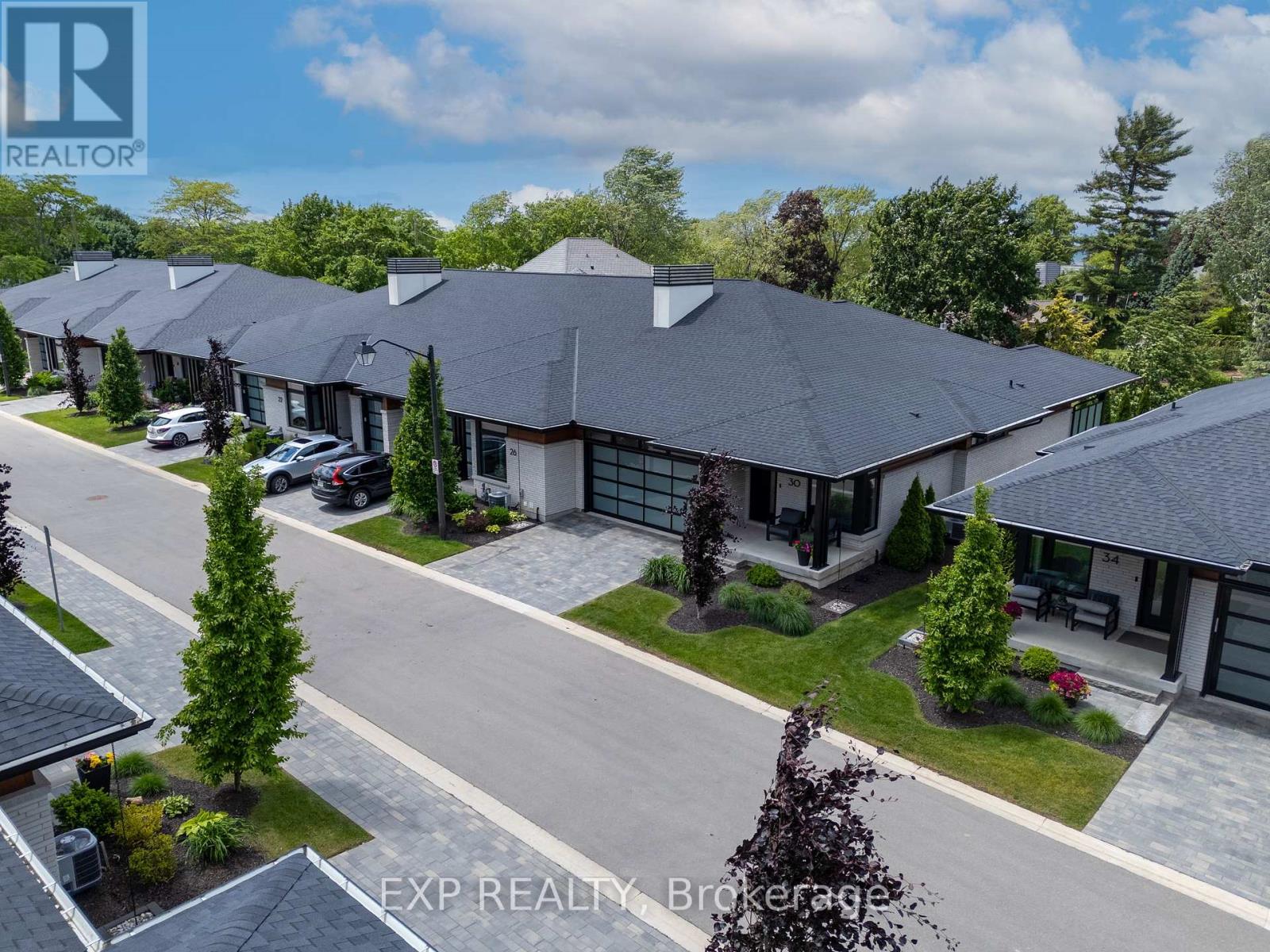 Luxury bungalow townhome located in "The Orchard", an exclusive community built by Rinaldi Homes. This exceptionally built & designed end unit in the desirable North End of St. Catharines is only a few minutes walk to Lake Ontario, beautiful water/walking trails & the quaint Port Dalhousie. The private backyard is serene - with views of mature trees you feel as though you are nestled in your own secluded retreat. Views of the lush greenery can be seen from the main living area, primary bedroom or outdoors on the private covered composite-wood back deck & lower-level interlock terrace. You can also take in the tranquil setting from the spacious covered front porch. Inside, an expansive & elegantly tiled foyer leads to an open concept kitchen, dining & living room space. The kitchen is a dream - with a walk-in chefs pantry, quartz countertops, high-end stainless-steel appliances & large island. The living room features a stunning floor to ceiling tiled gas fireplace. The primary bedroom is appointed with a custom designed walk-in closet & elegant ensuite with quartz countertop, double sinks & tiled glass shower. The main floor also has an efficiently designed laundry room, additional bedroom/office space, 4-piece bathroom & white-oak engineered hardwood & tile flooring throughout. The basement is designed for entertaining & relaxing; enjoy a custom designed wet bar, recreation area, cozy fireplace, two additional bedrooms, 3-piece bathroom & large storage room. Additional features include whole home water & air purification systems, window shades that can be controlled via remote, double car garage, separate gas hookups to BBQ & fire pit. Located just a short stroll or drive to numerous & convenient amenities, QEW Highway & the charming Niagara-on-the-Lake with its renowned wineries, restaurants, shops & Shaw Festival Theatre. This is a rare opportunity to enjoy a luxurious, carefree lifestyle in a desirable, exclusive community set in a picturesque location. (id:51158)