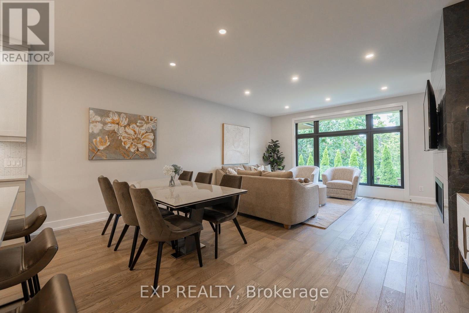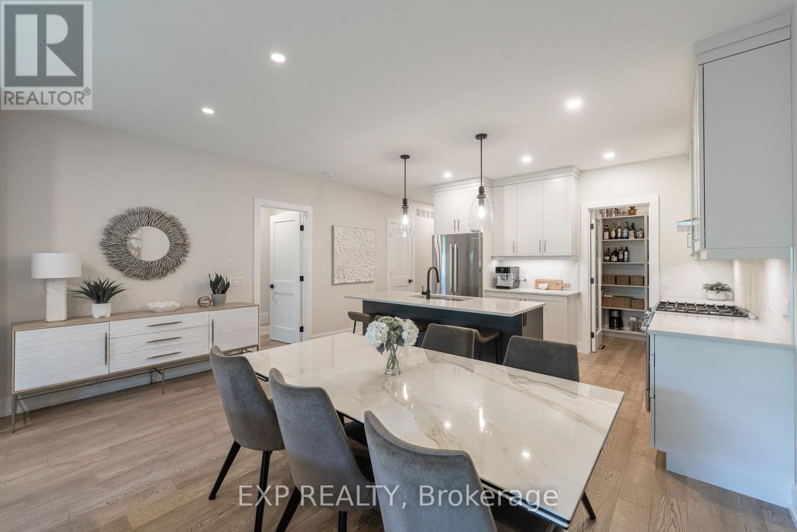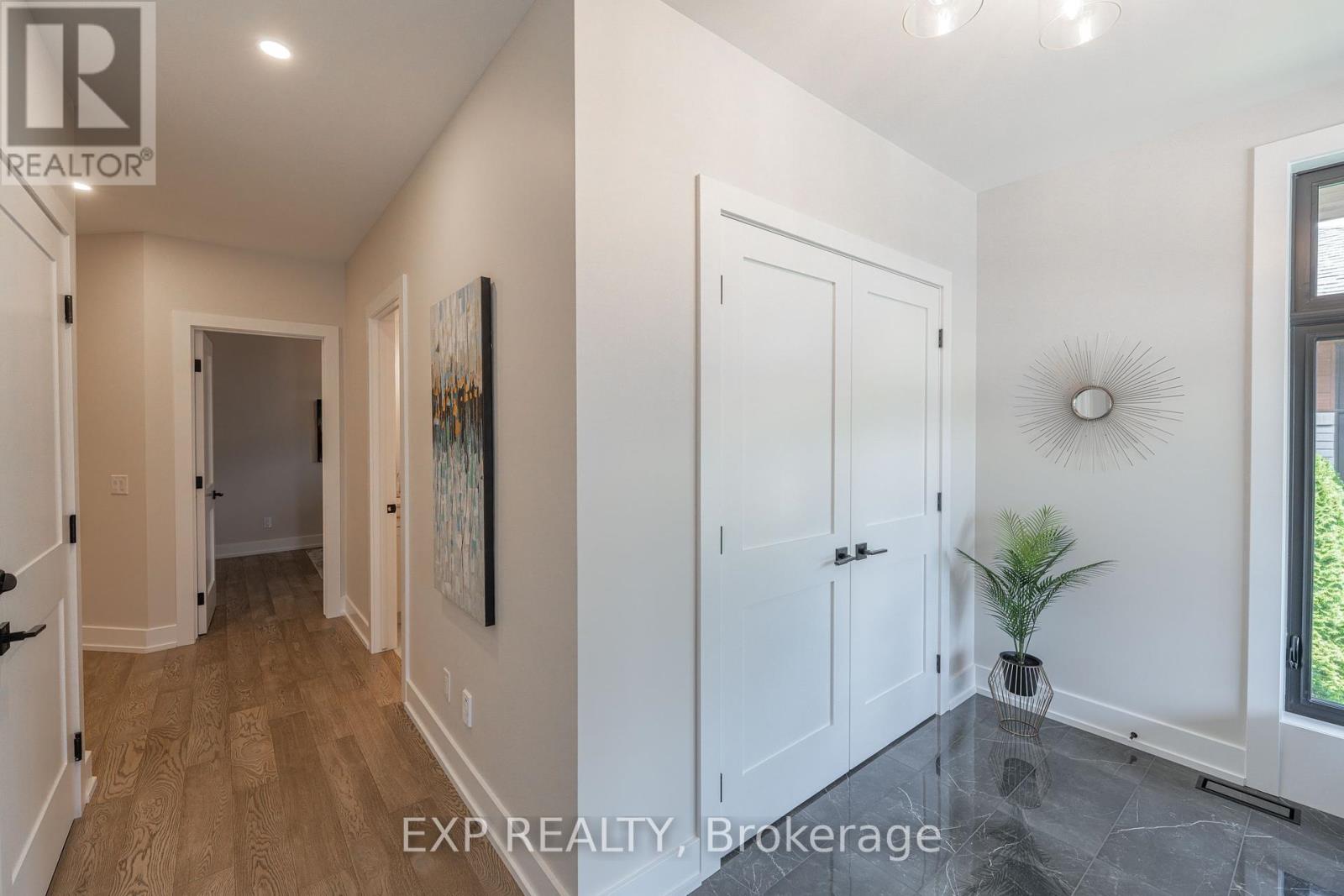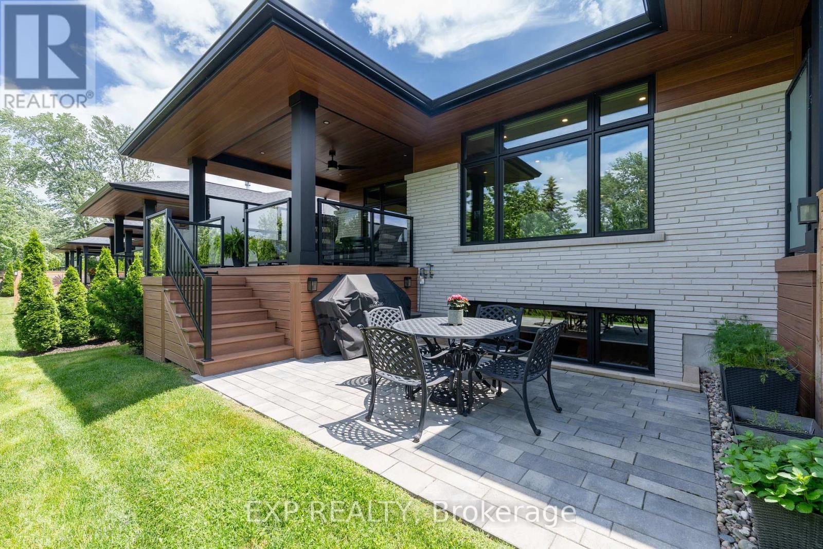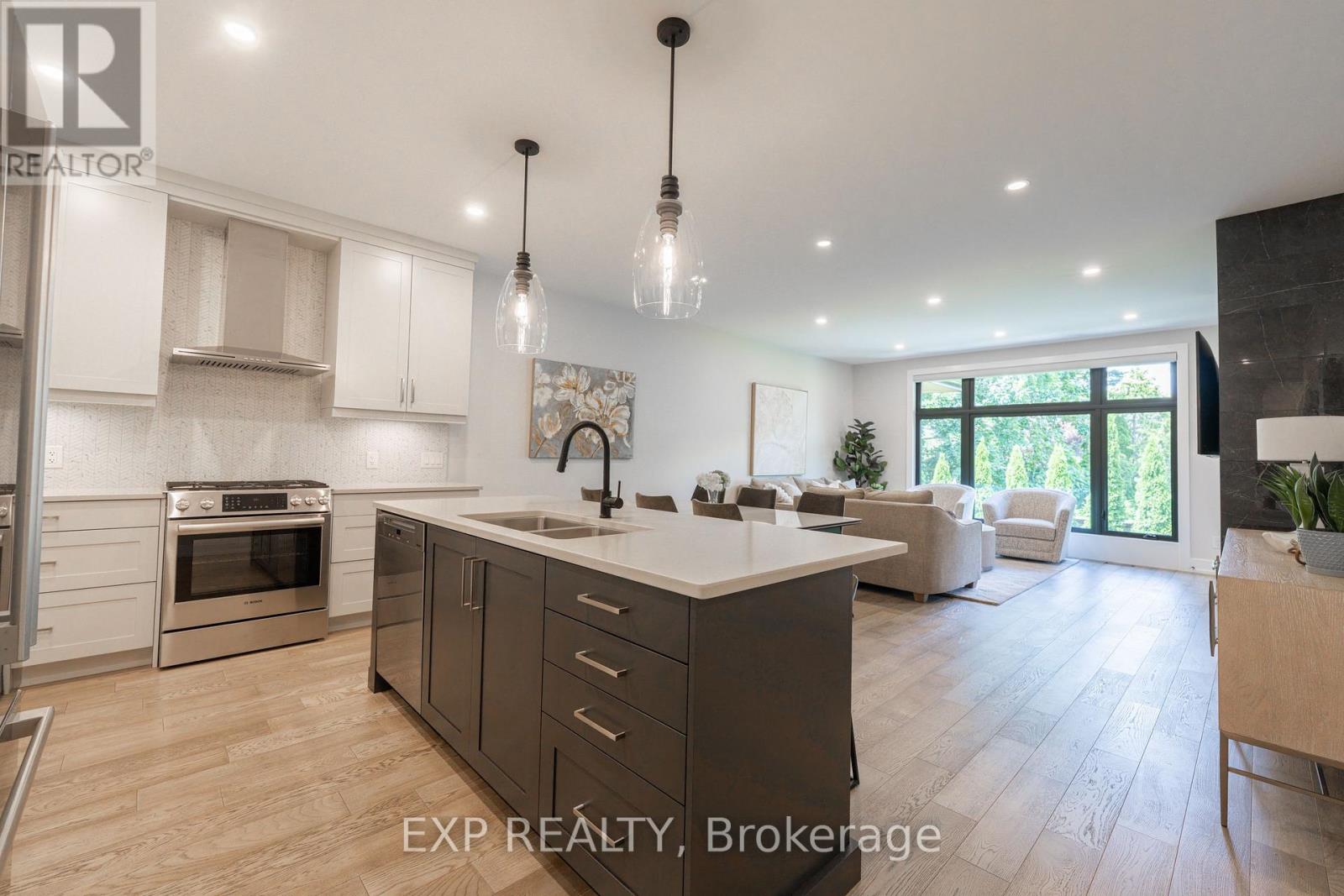 Luxury bungalow townhome located in "The Orchard", an exclusive community built by Rinaldi Homes. This exceptionally built & designed end unit in the desirable North End of St. Catharines is only a few minutes walk to Lake Ontario, beautiful water/walking trails & the quaint Port Dalhousie. The private backyard is serene - with views of mature trees you feel as though you are nestled in your own secluded retreat. Views of the lush greenery can be seen from the main living area, primary bedroom or outdoors on the private covered composite-wood back deck & lower-level interlock terrace. You can also take in the tranquil setting from the spacious covered front porch. Inside, an expansive & elegantly tiled foyer leads to an open concept kitchen, dining & living room space. The kitchen is a dream - with a walk-in chefs pantry, quartz countertops, high-end stainless-steel appliances & large island. The living room features a stunning floor to ceiling tiled gas fireplace. The primary bedroom is appointed with a custom designed walk-in closet & elegant ensuite with quartz countertop, double sinks & tiled glass shower. The main floor also has an efficiently designed laundry room, additional bedroom/office space, 4-piece bathroom & white-oak engineered hardwood & tile flooring throughout. The basement is designed for entertaining & relaxing; enjoy a custom designed wet bar, recreation area, cozy fireplace, two additional bedrooms, 3-piece bathroom & large storage room. Additional features include whole home water & air purification systems, window shades that can be controlled via remote, double car garage, separate gas hookups to BBQ & fire pit. Located just a short stroll or drive to numerous & convenient amenities, QEW Highway & the charming Niagara-on-the-Lake with its renowned wineries, restaurants, shops & Shaw Festival Theatre. This is a rare opportunity to enjoy a luxurious, carefree lifestyle in a desirable, exclusive community set in a picturesque location. (id:51158)