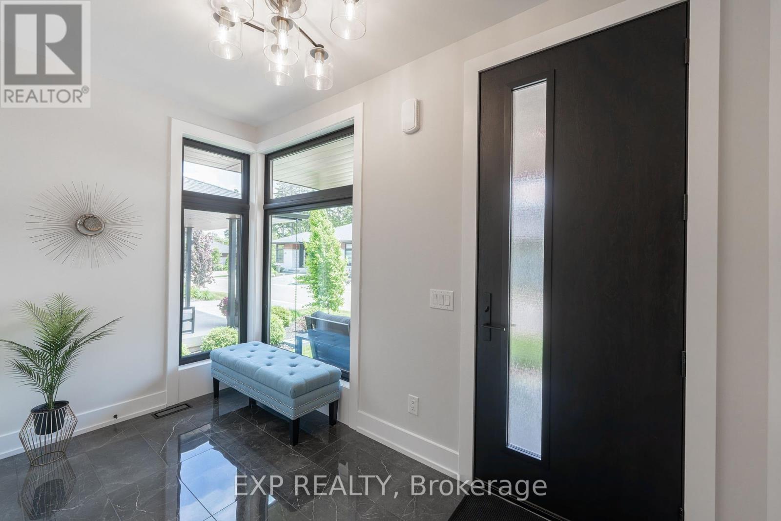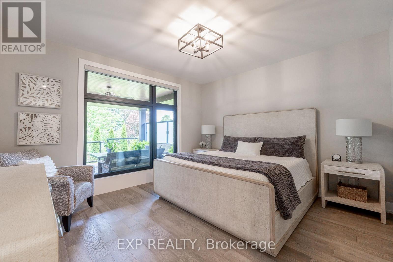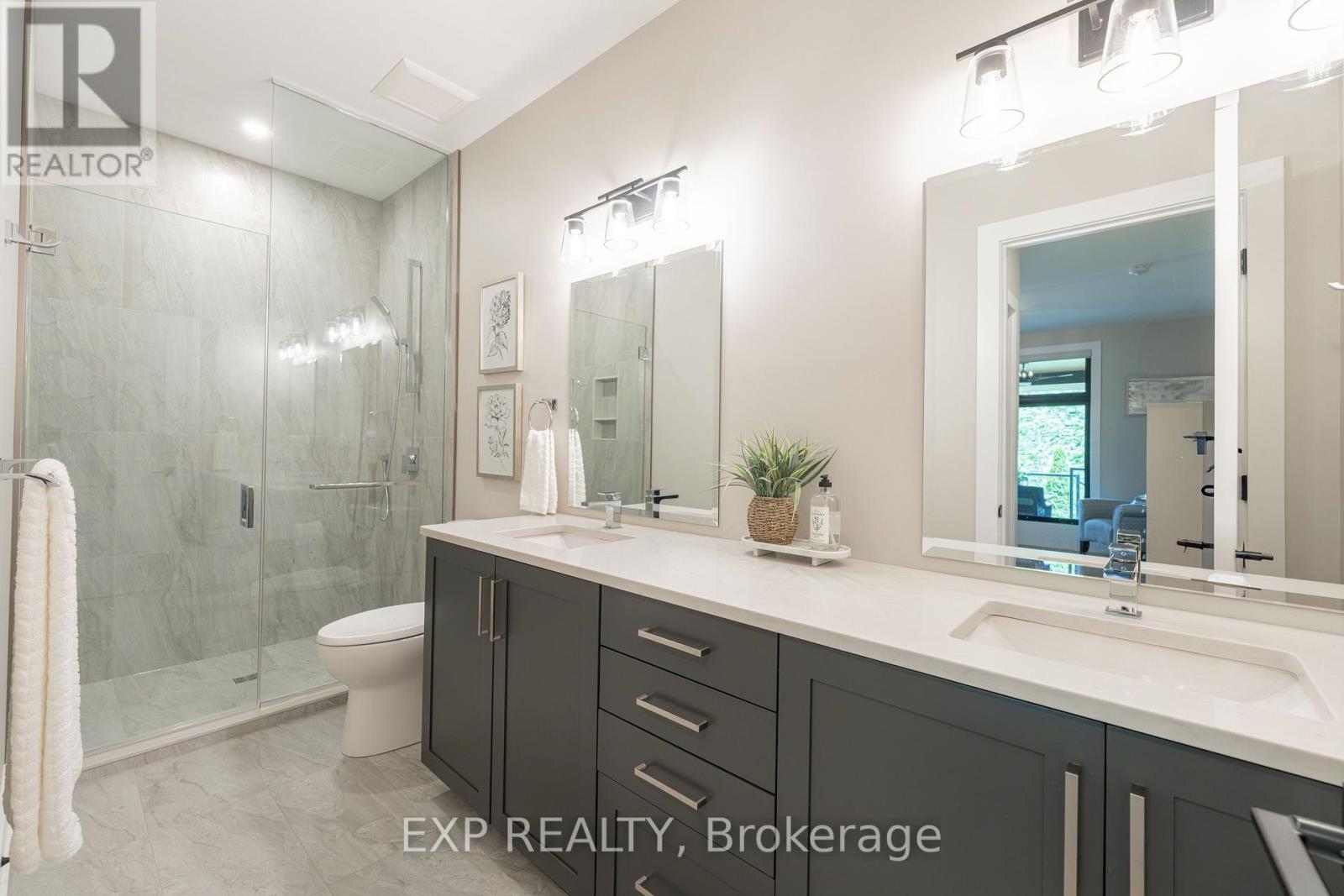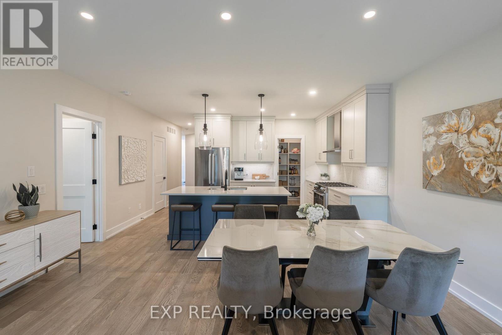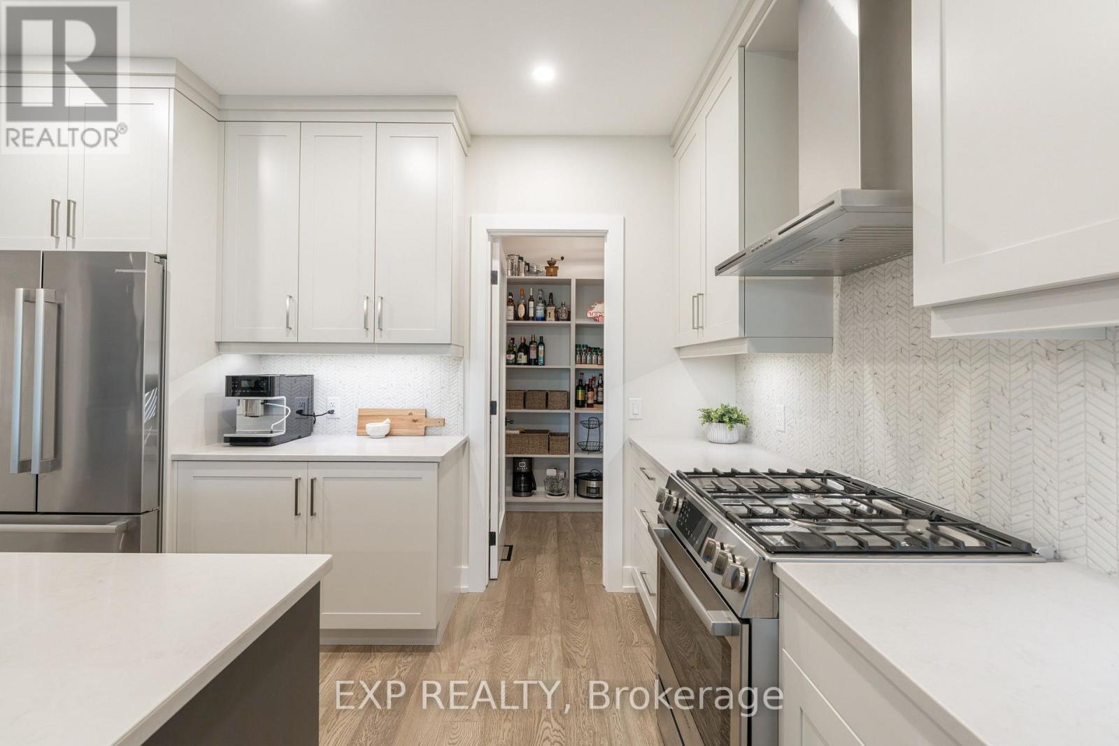 Luxury bungalow townhome located in "The Orchard", an exclusive community built by Rinaldi Homes. This exceptionally built & designed end unit in the desirable North End of St. Catharines is only a few minutes walk to Lake Ontario, beautiful water/walking trails & the quaint Port Dalhousie. The private backyard is serene - with views of mature trees you feel as though you are nestled in your own secluded retreat. Views of the lush greenery can be seen from the main living area, primary bedroom or outdoors on the private covered composite-wood back deck & lower-level interlock terrace. You can also take in the tranquil setting from the spacious covered front porch. Inside, an expansive & elegantly tiled foyer leads to an open concept kitchen, dining & living room space. The kitchen is a dream - with a walk-in chefs pantry, quartz countertops, high-end stainless-steel appliances & large island. The living room features a stunning floor to ceiling tiled gas fireplace. The primary bedroom is appointed with a custom designed walk-in closet & elegant ensuite with quartz countertop, double sinks & tiled glass shower. The main floor also has an efficiently designed laundry room, additional bedroom/office space, 4-piece bathroom & white-oak engineered hardwood & tile flooring throughout. The basement is designed for entertaining & relaxing; enjoy a custom designed wet bar, recreation area, cozy fireplace, two additional bedrooms, 3-piece bathroom & large storage room. Additional features include whole home water & air purification systems, window shades that can be controlled via remote, double car garage, separate gas hookups to BBQ & fire pit. Located just a short stroll or drive to numerous & convenient amenities, QEW Highway & the charming Niagara-on-the-Lake with its renowned wineries, restaurants, shops & Shaw Festival Theatre. This is a rare opportunity to enjoy a luxurious, carefree lifestyle in a desirable, exclusive community set in a picturesque location. (id:51158)