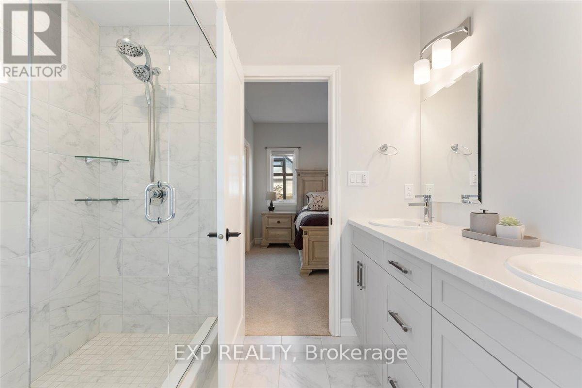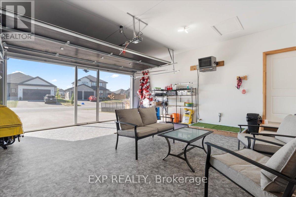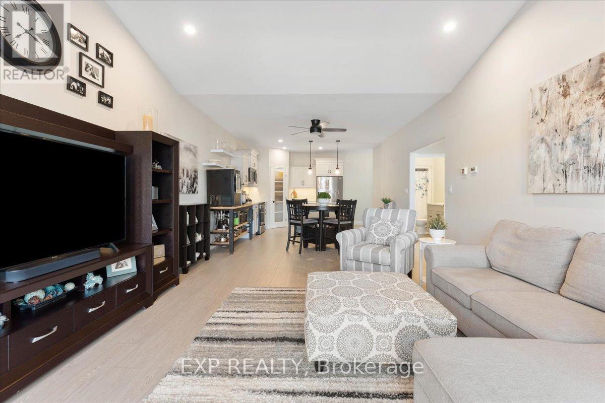 Stunning end unit bungalow townhouse, quality built by Duvanco Homes in 2023 like new and move-in ready! This bright and spacious home is filled with natural light thanks to its end unit location and thoughtfully designed layout. The open-concept main floor features vaulted ceilings with pot lights, neutral laminate and ceramic flooring, and a kitchen with quartz countertops, white cabinetry, and a custom-built walk-in pantry. Offering two generous bedrooms and two full bathrooms on the main level, including a spacious primary suite with double closets and a sleek ensuite with glass and tile shower. The insulated, heated garage with vinyl flooring & lifestyle screen door makes the perfect man cave, workshop or home gym. The lower level is partially finished with drywall, flooring, and electrical already completed, plus a rough-in for a 4-piece bath and space for an additional bedroom - just add your finishing touches. Step outside to a fully fenced, private backyard featuring a two-tiered, multi-zoned deck with privacy panels and roller shades. Enjoy low-maintenance living with astroturf and beautifully established gardens - very little grass to cut! A well-maintained, high-quality home in a desirable area, offering comfort, style, and room to grow. Settlers Ridge Subdivision offers trails, park, wide paved sidewalks, green space, Bell FIBE and is just minutes to all amenities. (id:51158)