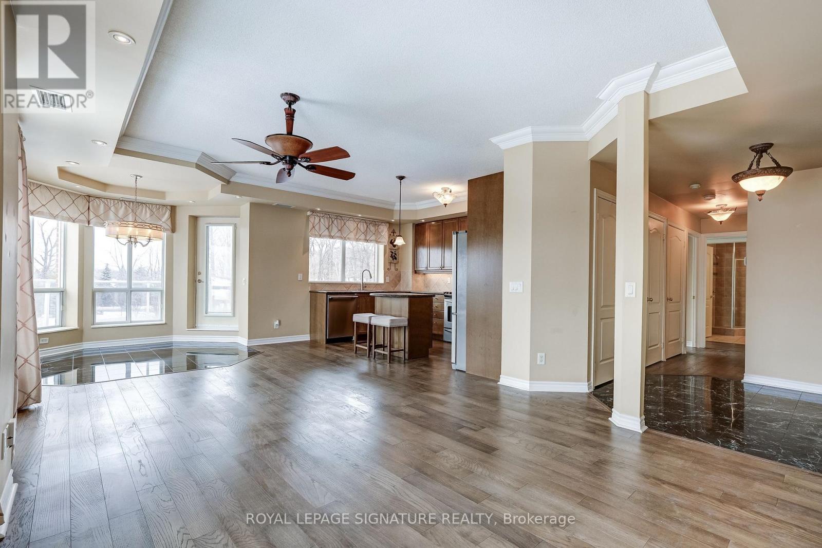 $1,328.59 MonthlyWelcome to this stunning corner suite approximately 1,238 sq. ft. in the upscale Woods End Condominiums, a well-maintained low-rise building. This original-owner home has been meticulously cared for and is surrounded by mature trees, providing privacy along with desirable south and west facing exposures. The Building backs onto green space. The open-concept layout features spacious living, family and dining areas seamlessly connected to the kitchen-ideal for both everyday living and entertaining. The kitchen is equipped with granite countertops, pot lights, under-mount lighting, stainless steel appliances and a centre island. The dining area features a walk-out to a private balcony with a gas line for BBQs. All electric blinds are conveniently operated by remote. The suite includes two generously sized bedrooms and two bathrooms. The primary bedroom features a walk-in closet and a 4-piece ensuite with a separate shower and bathtub. The second bathroom is a 3-piece. Additional highlights include two side-by-side parking spaces located steps to the entrance and one large locker. Building amenities include concierge/security services, visitor parking, guest suites, a party/meeting room and an exercise room. Ideally located near public transit, shops, greenbelt and conservation areas, recreation centres, golf and parks. A must-see home in a highly desirable community-don't miss your opportunity to make it yours! (id:51158)