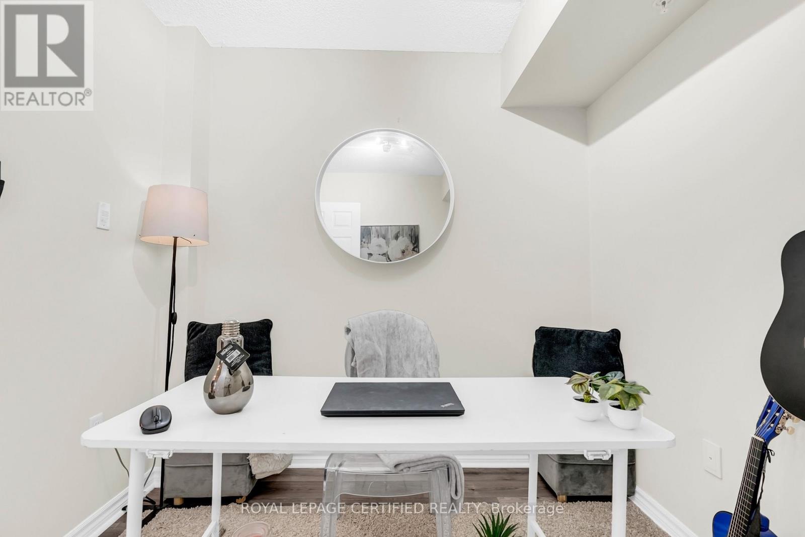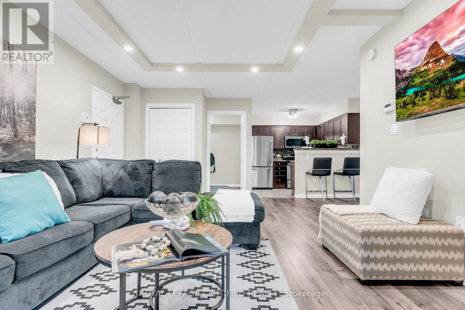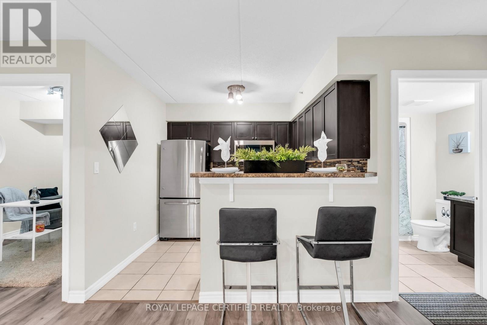 $441.77 MonthlyWelcome to this move-in ready 1-bedroom + den condo in a highly convenient and welcoming community! Located in The Bristol on Main Condos, you'll be just steps from shopping, the FirstOntario Arts Centre, community and leisure facilities, transit, major highways, parks, trails, conservation areas, and all essential amenities.This bright and inviting unit features an open-concept kitchen that flows seamlessly into a sun-filled living area, a spacious bedroom with a large window, a private patio, and a versatile den-perfect for a home office or quiet retreat. The 4-piece bathroom is conveniently located near the in-suite laundry. Enjoy newly installed laminate flooring throughout the entire unit.Residents have access to excellent building amenities including a fitness room, party room, underground parking, car wash, and an exclusive locker/storage space. Additional parking can be purchased through the condo corporation.Whether you're looking for your next home or a smart investment, this condo is a great choice! (id:51158)