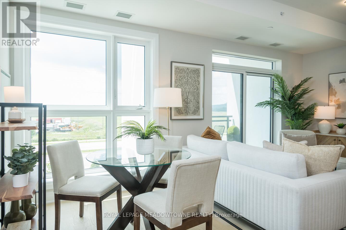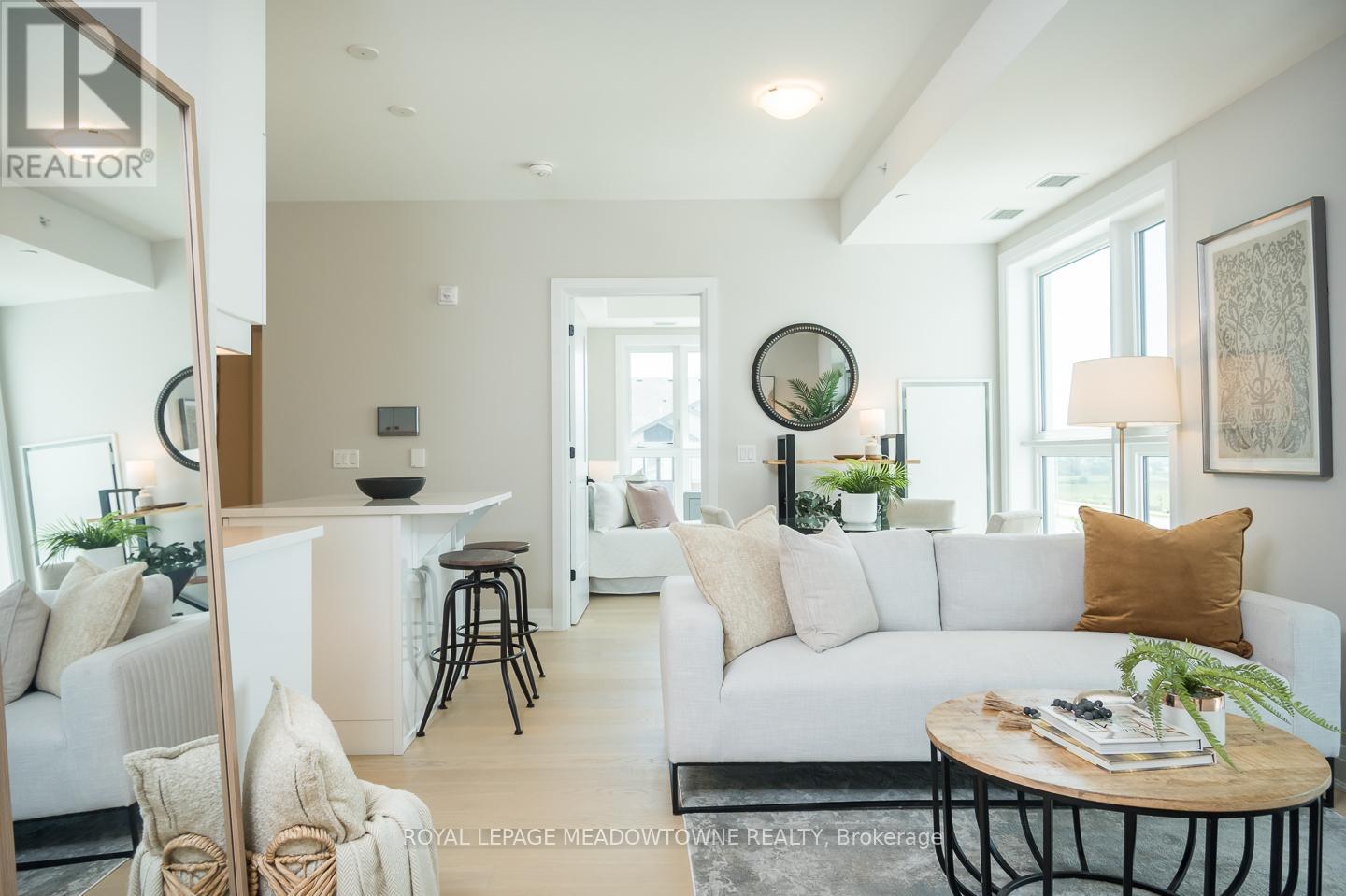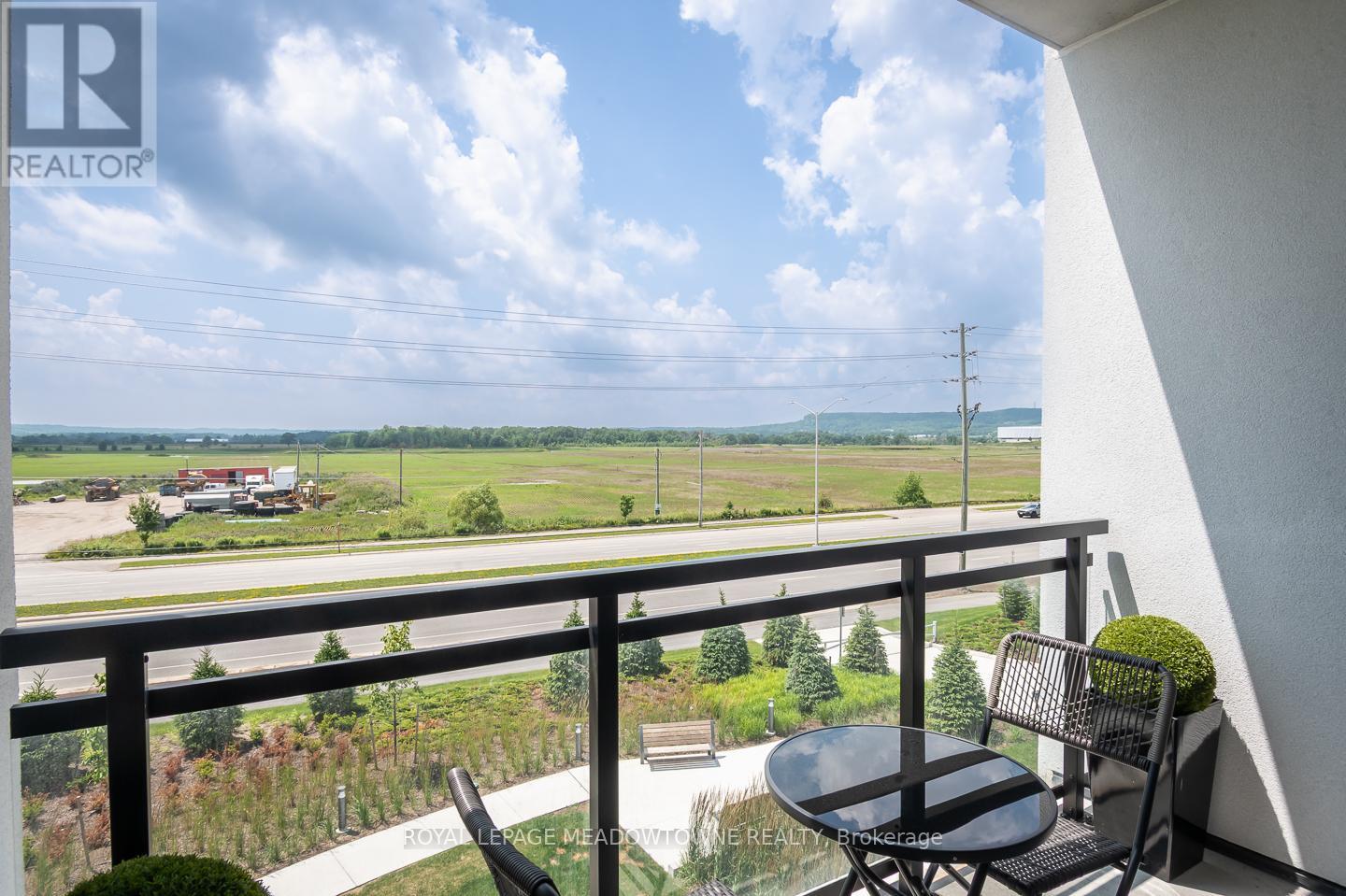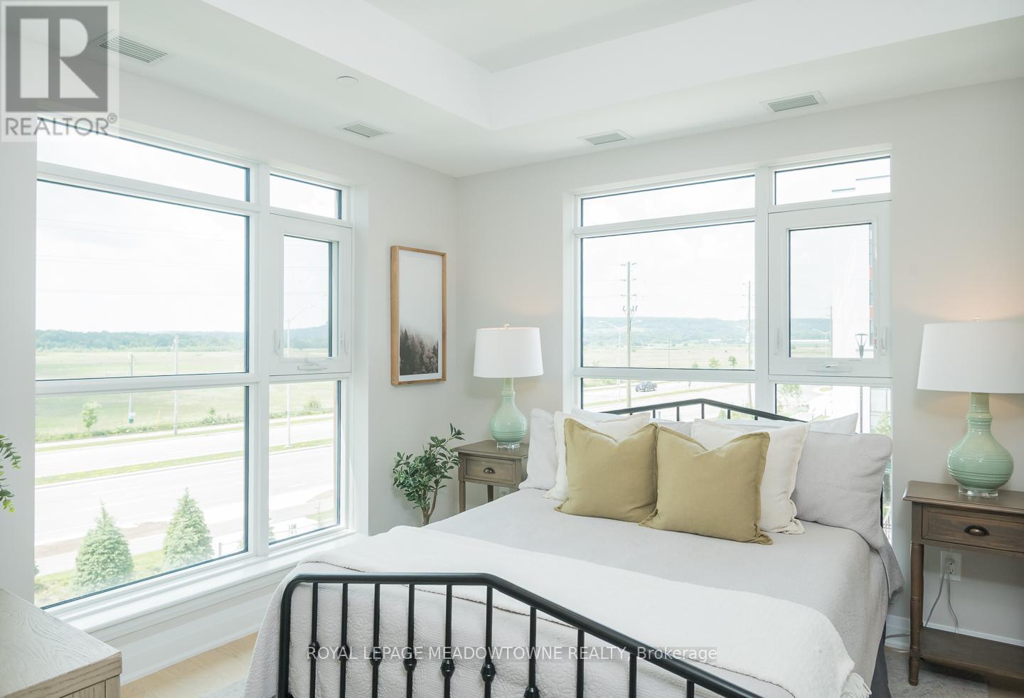 Welcome to this premium, gorgeous, brand new, double corner condo unit offering modern luxury and unbeatable convenience in one of Miltons most sought-after up coming locations. Bonus: 2 parking spots! (1 EV) Enjoy breathtaking panoramic views of the escarpment through floor-to-ceiling windows and soaring high ceilings that fill the space with natural light. This 2-bedroom + den suite features an open-concept living and dining area and a neutral colour palette, and direct access to a private balcony. The sleek high-gloss white kitchen is a chefs dream, boasting quartz countertops, matching backsplash, stainless steel appliances, under-cabinet lighting, and a large island with seating. Both bathrooms are elegantly designed, with the primary offering a 3-piece ensuite and walk-in closet. With two parking spots, in-suite laundry, laminate flooring throughout, and premium building amenitiesincluding concierge service, security cameras, rooftop terrace, party room, and co-working spacethis home has it all including 60K worth of structural and design centre upgrades, Over $50,000 in builder upgrades (flooring, countertops, cabinetry, lighting, appliances, finishes) and $10,000 premium for unit placement (view/floor/unit location). Ideally located near Kelso, Rattlesnake Point, Spring Ridge Farm, the Velodrome, and the future Milton Education Village, with excellent commuter access via the upcoming Tremaine 401 ramp. (id:51158)