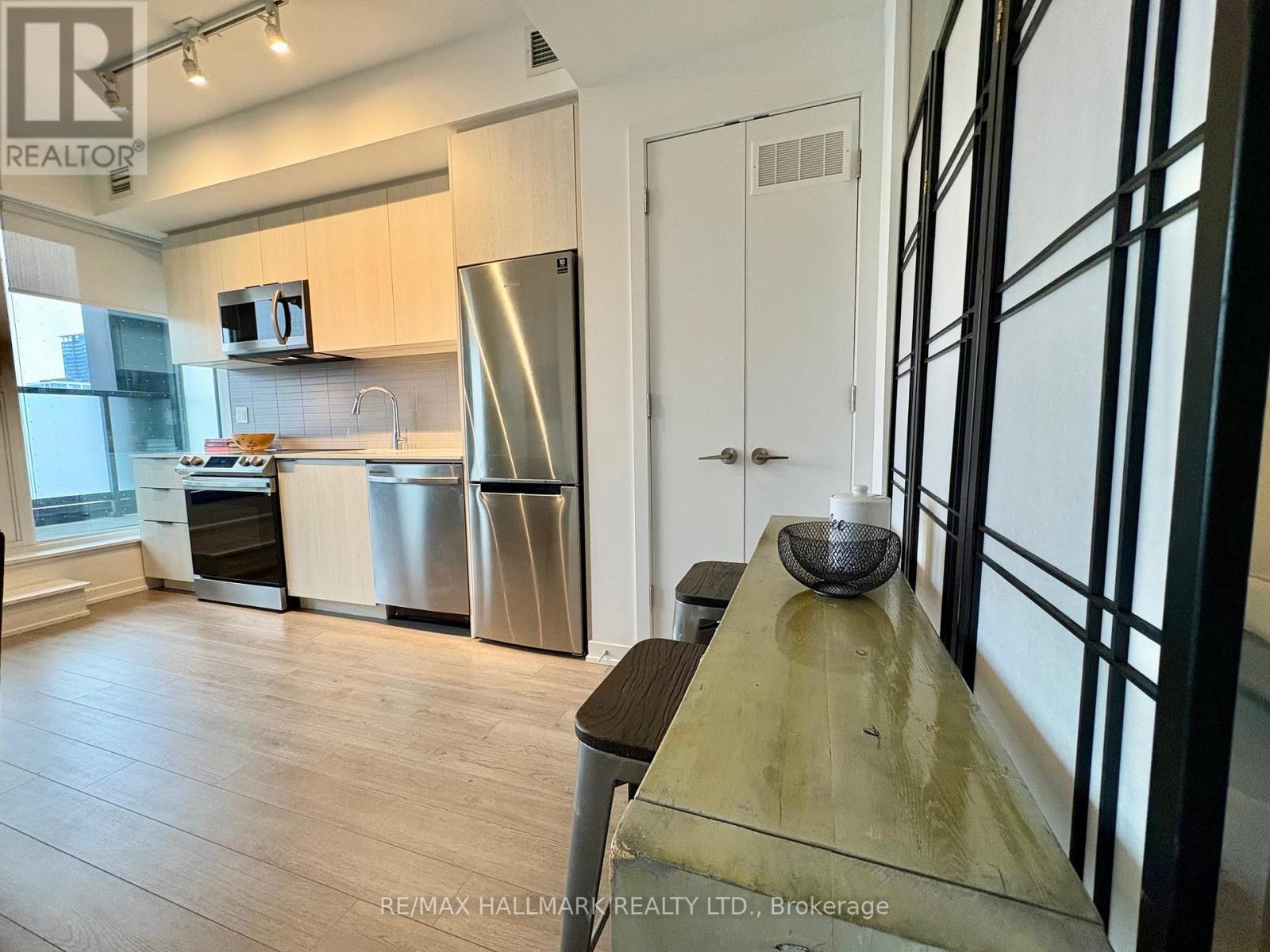 Live [ Loft [ Luxury ~ Your First Home Starts Here ~ Welcome to Suite #309, a north-facing 1 Bedroom that blends modern comfort with loft-inspired style. Floor-to-ceiling windows and sliding patio doors open onto a full-width balcony, filling the space with natural light and creating an effortless indoor-to-outdoor flow. The serene bedroom offers a restful retreat with its floor-to-ceiling double-paned glass insert, ample storage in the double sliding closet, and a chic noir accent wall that sets the mood. Full 4-piece spa-inspired bath features a fully tiled surround and a soothing rain shower head, complemented by a sleek vanity sink with a stone countertop. Two crisp white wall shelves provide convenient storage for your bath essentials, creating a space that feels both functional and luxurious. Nestled in the pulse of Toronto's most vibrant neighbourhoods, this home places you steps from the historic Distillery District and the authentic charm of the St. Lawrence Market, all within a warm and understated community vibe. 5-Star Building amenities surrounds you with exceptional services including: Double-height lobby, Artist workspace, Fitness and Yoga studio, Pet spa, Event room with caterer's kitchen, Meeting lounge, Games room, Steam rooms, Community garden, Outdoor grills and Fireplace, and the security of a 24-hour Concierge. Immerse yourself in a loft that moves you, because what you surround yourself with becomes your life, and you can Rise & Shine in Suite 309 ~ Your future feels bright by design. (id:51158)