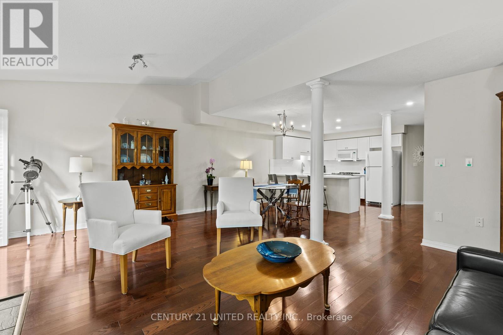 $211 MonthlyStep inside this immaculate open-concept condo townhouse. The main floor features a beautiful front entrance with hardwood floors. The bright and spacious living area is equipped with a gas fireplace and patio doors leading to a private backyard. The modern updated kitchen features white timeless granite countertops, a new sink and a newer stainless steel oven. The spacious dining room is perfect for both everyday living and entertaining. Throughout the home you'll have plenty of natural light plus beautiful updated light fixtures and new pot lights in the kitchen. Upstairs, you'll find three generous bedrooms with closets, including a lovely primary suite with a private ensuite bath with a new toilet. With three bathrooms in total, there's plenty of space for the whole family or visiting guests. The fully finished basement offers additional living space. In the utility room you'll find a newer washer and dryer and updated furnace (2018) Step outside to your own personal fenced backyard complete with deck and gazebo area, a perfect place to relax or host summer get-togethers. Updates throughout including a newer AC (2018) make this home truly move-in ready. Enjoy maintenance free living with lawn care and snow removal provided. Plenty of parking space in the single car garage, driveway and visitor parking. Located just minutes from the QEW, shopping, parks, community center and great schools, this property combines convenience with exceptional pride of ownership. (id:51158)