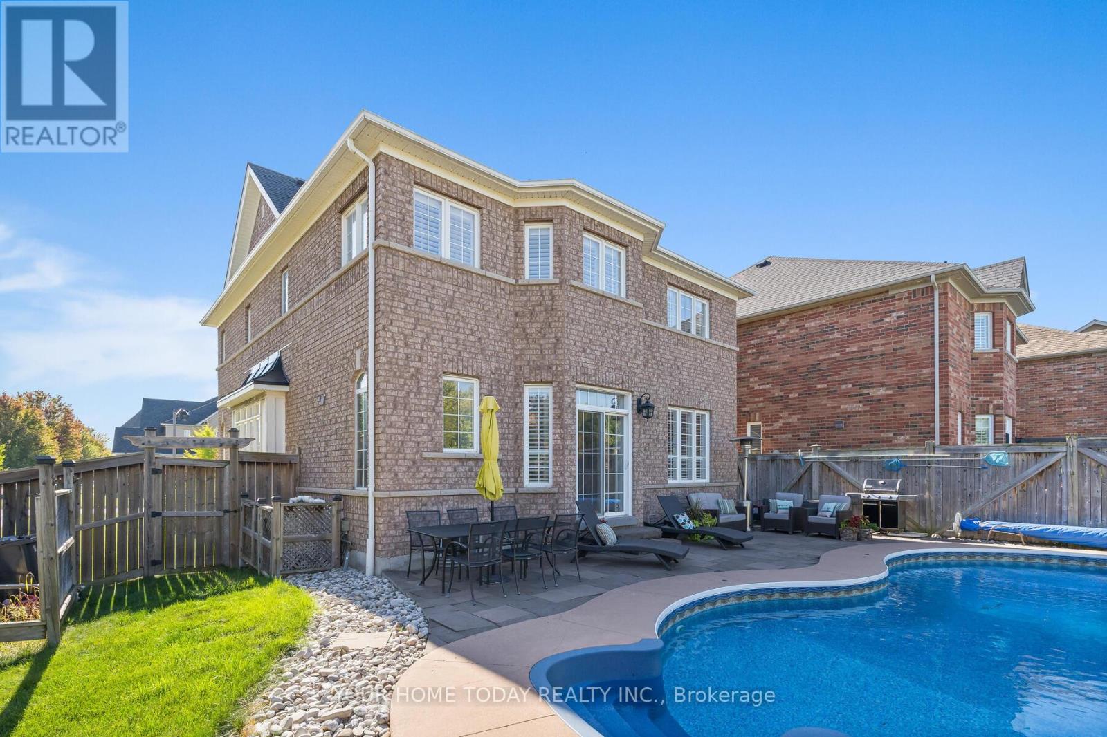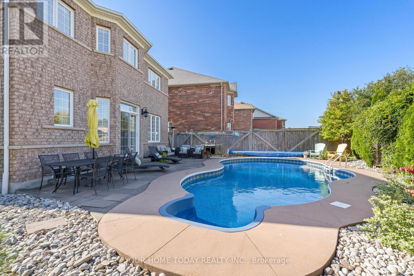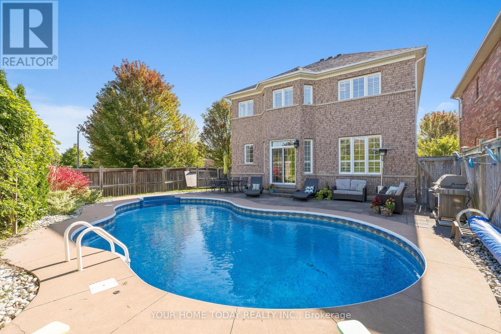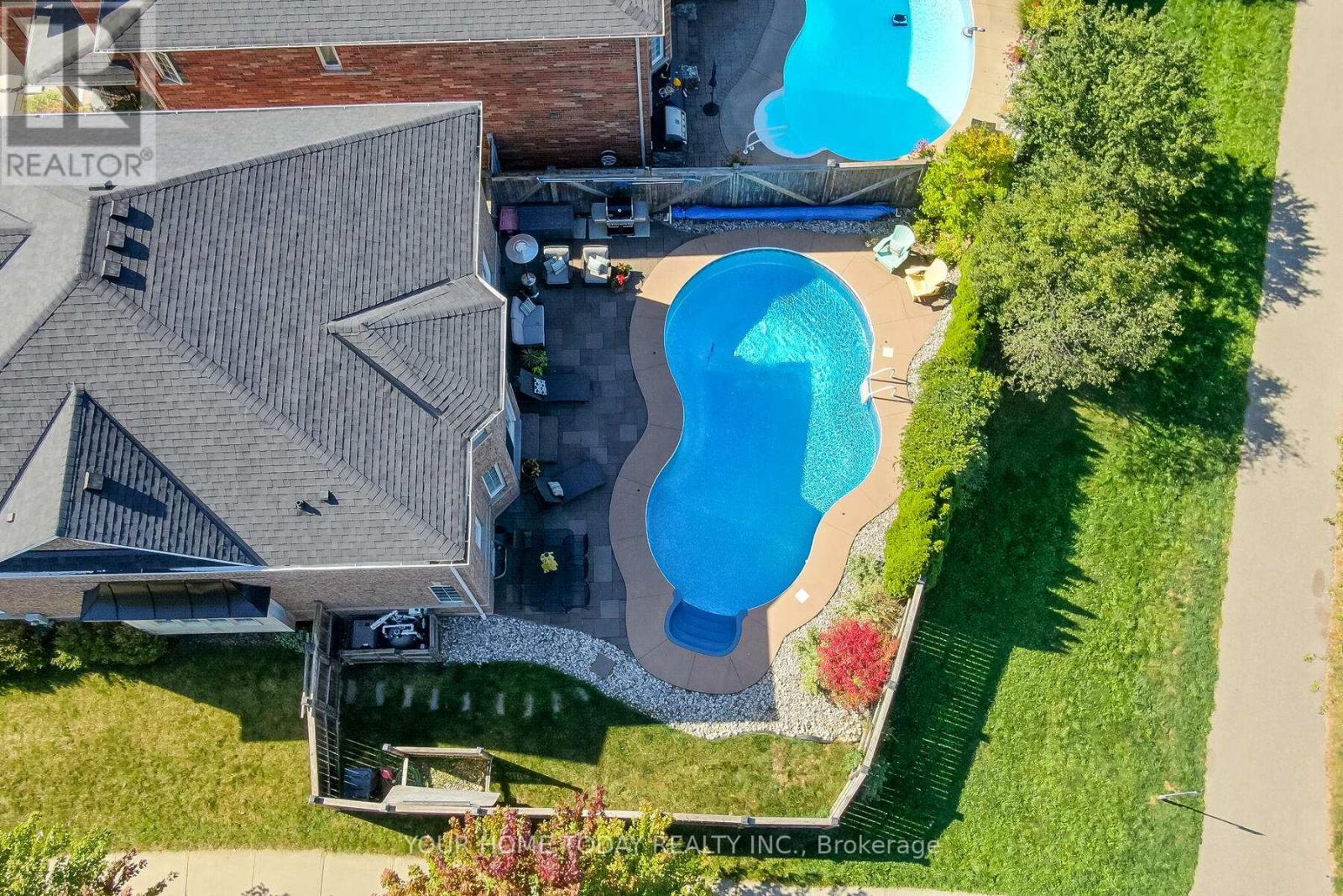 The complete package! Approximately 4,200 sq. ft. of finished living space with 5+2-bedrooms, 4.5-bathrooms, finished lower level, heated saltwater pool, gorgeous landscaping and large corner lot backing on to path (no neighbours directly behind or on one side). It doesn't get much better than this! An elegant portico, stunning entry system and large sun-filled foyer set the stage for this impressive home featuring stylish flooring, quality finishes, California shutters and classy décor throughout. The main level offers 9 ft. ceilings, formal living and dining rooms, eat-in kitchen, family room, office, powder room and laundry/mudroom with garage access. The sun-filled living and dining rooms enjoy hardwood flooring, large windows and an open concept design that's perfect for entertaining. The family-sized kitchen features ceramic tile flooring and backsplash, granite counter, warm wood cabinetry, pot drawers, island, stainless steel appliances and walk-out to a backyard oasis with pool, gorgeous yard/gardens, pergola and extensive stone patio area. A family room with toasty 2-sided gas fireplace bordered by custom built shelving and an office with 2-sided fireplace complete the level. An eye-catching wood and wrought-iron staircase carry you to the upper level where you will find 5 spacious bedrooms - 4 with ensuite/semi-ensuite bathroom access and all with ample closet space. Adding to the enjoyment of the home is the finished lower level boasting a party-sized rec room, 2 additional bedrooms, 3-piece bathroom and plenty of storage/utility space. And what a location! Close to schools (across from Gardiner Public), parks, community centre, trails, shops and more. Great location for commuters too with easy access to major roads. (id:51158)