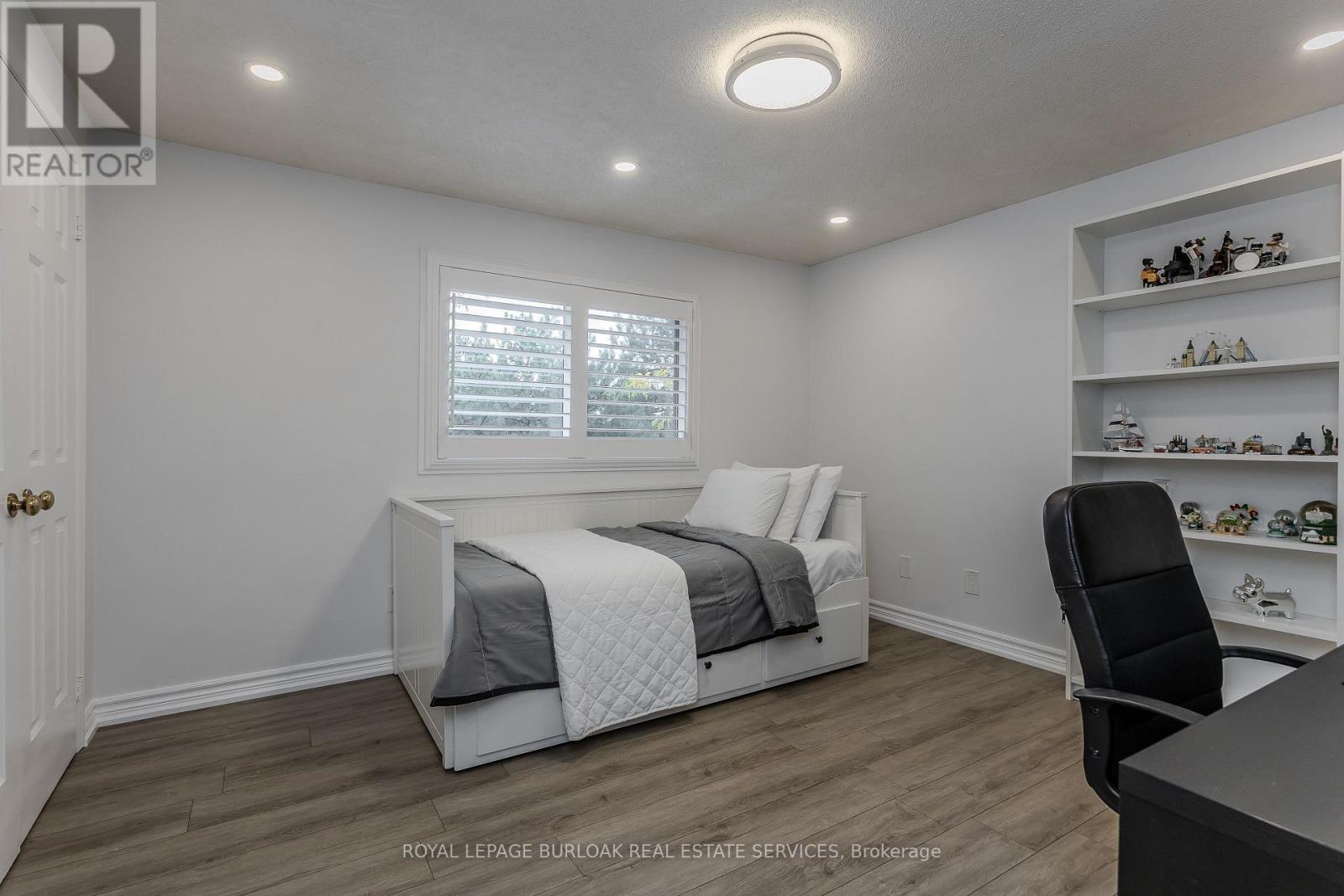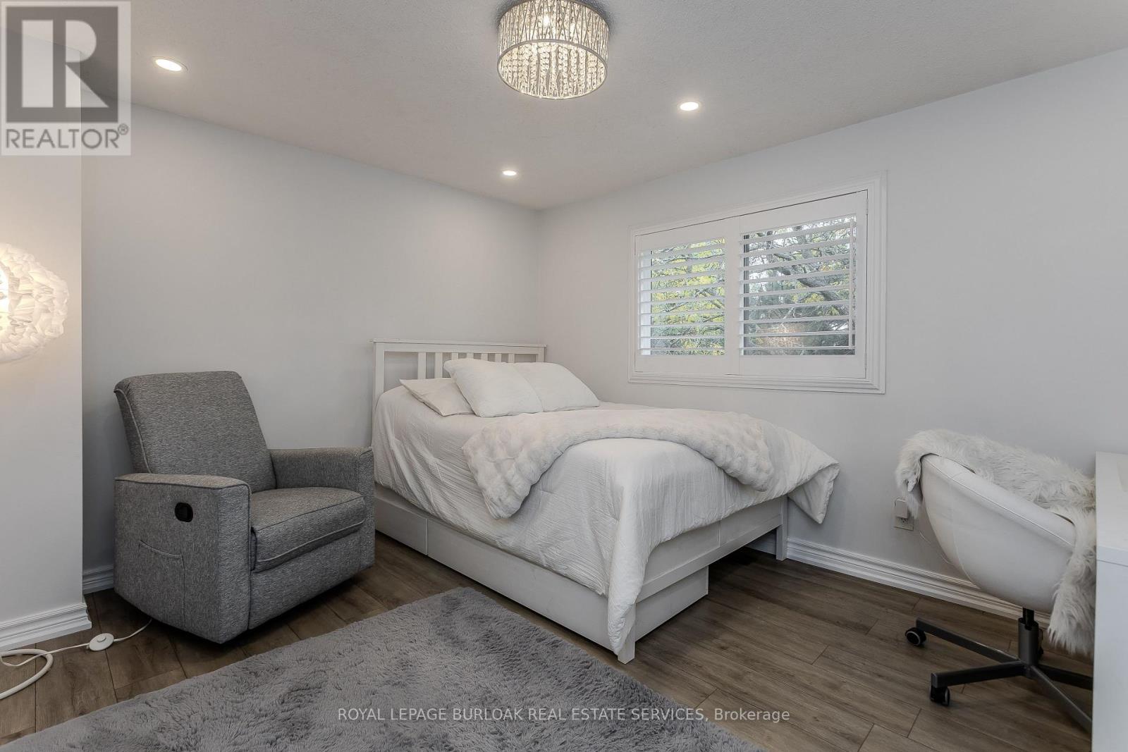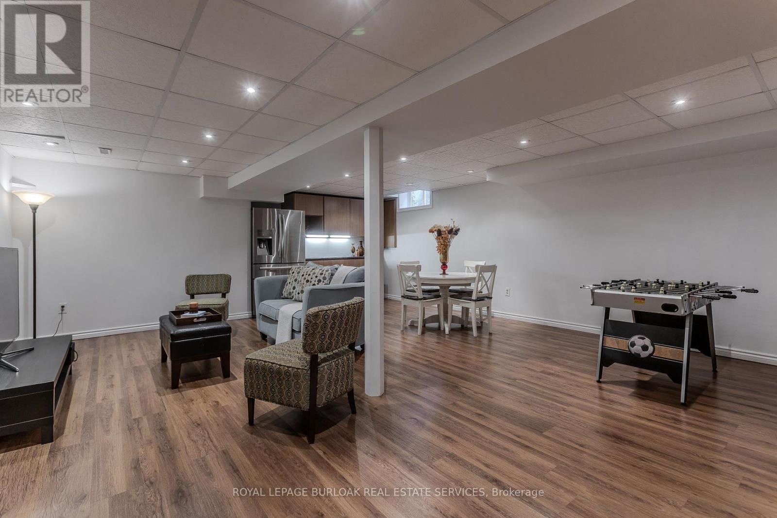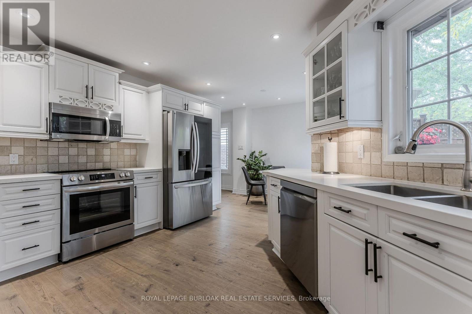 Discover the perfect Family Lifestyle Location in this updated home with 3,479 sqft total living space, nestled in one of Burlington's most well-connected neighbourhoods. Fully renovated on the main and upper levels, it blends modern comfort with a dream family lifestyle setting.  Backing onto a mini ravine with Ireland Park just beyond, and schools, parks, trails, amenities, and highway access mins away, life flows with ease. The exceptional curb appeal sets the tone-professionally landscaped, mature trees, all-brick façade, and a stone walkway lead to a double door entry. A side trail next to the home connects directly to the park, making family adventures effortless. Inside, the bright, open-concept main level is designed for family living and connection. Wide plank light oak hardwood and California shutters flow throughout. The living and dining spaces are perfect for gatherings, while the spacious eat-in kitchen impresses with custom cabinetry, quartz countertops ,premium SS appliances, brick backsplash, and a breakfast nook w/ walkout to the rear deck. A sunken family room with a contemporary stone fireplace and gallery lighting invites memorable evenings. The convenience of a main-floor laundry room with side yard access is ideal for busy households. Upstairs, hardwood continues across 4 generous bedrooms. The expansive primary suite offers multiple oversized windows, a vanity nook, walk-in closet, and a spa-like ensuite with a glass shower and freestanding tub. A 4pc main bath with dual sinks completes this level. The lower level expands the lifestyle possibilities: a versatile rec room, kitchenette, additional bedroom with 2 large closets, and a 3-piece bath, perfect for teens, in-laws, guests, or a nanny. Step outside to your private entertaining oasis. The fully fenced yard, mature trees, interlock patio, and spacious 2-tier deck set the stage for family BBQs, outdoor dining, and year-round fun. This is a home where families grow, gather, and truly live. (id:51158)