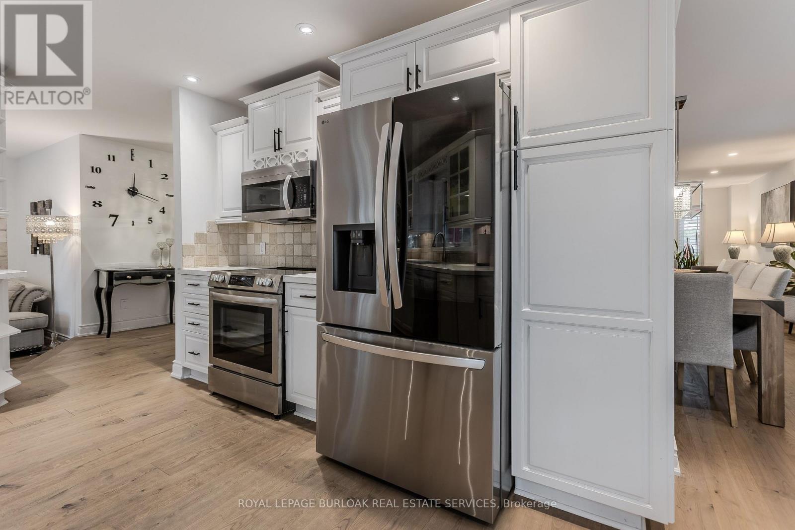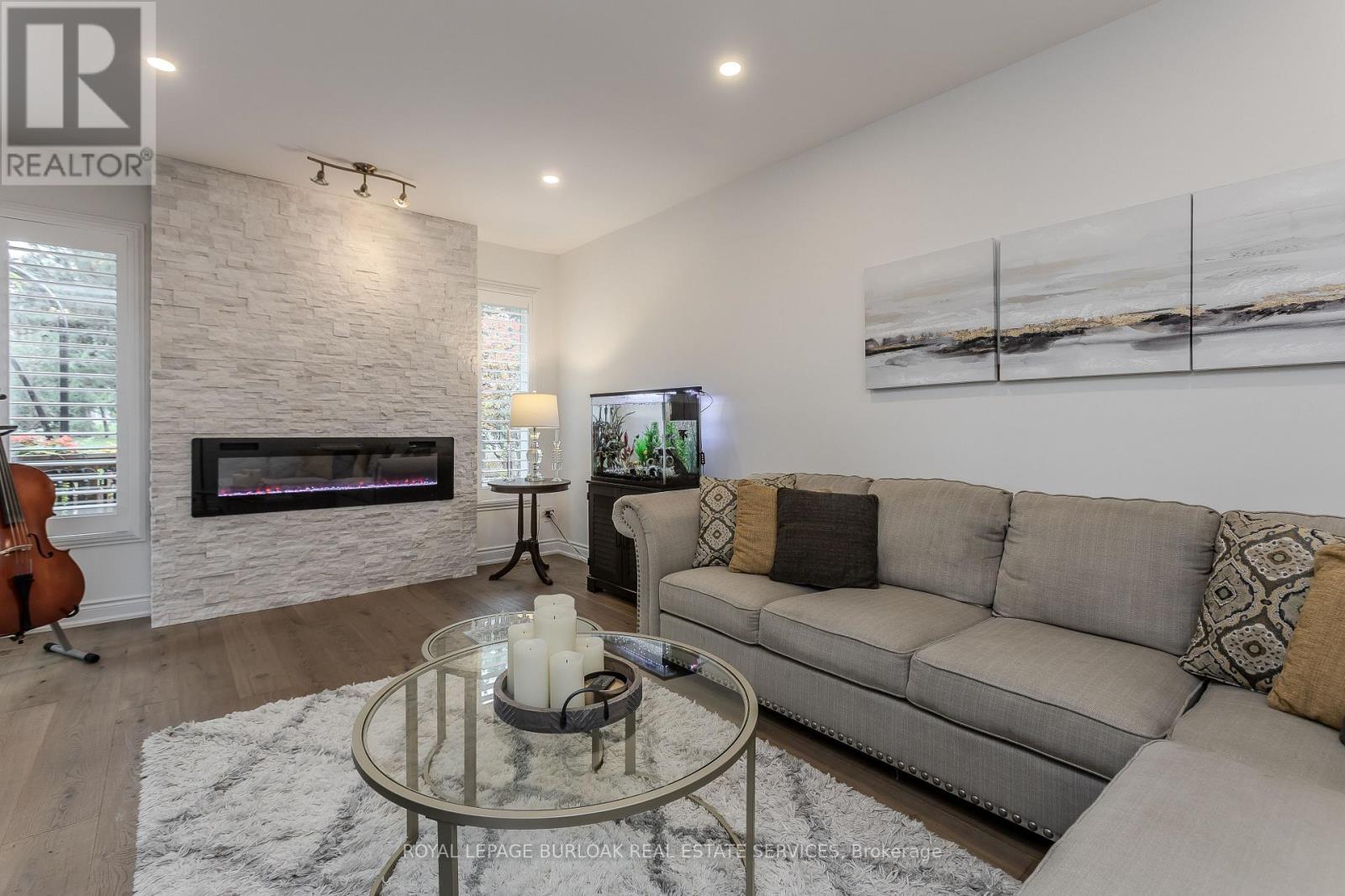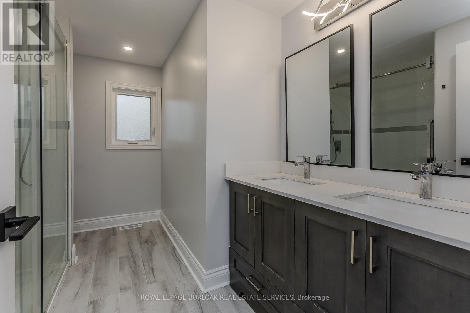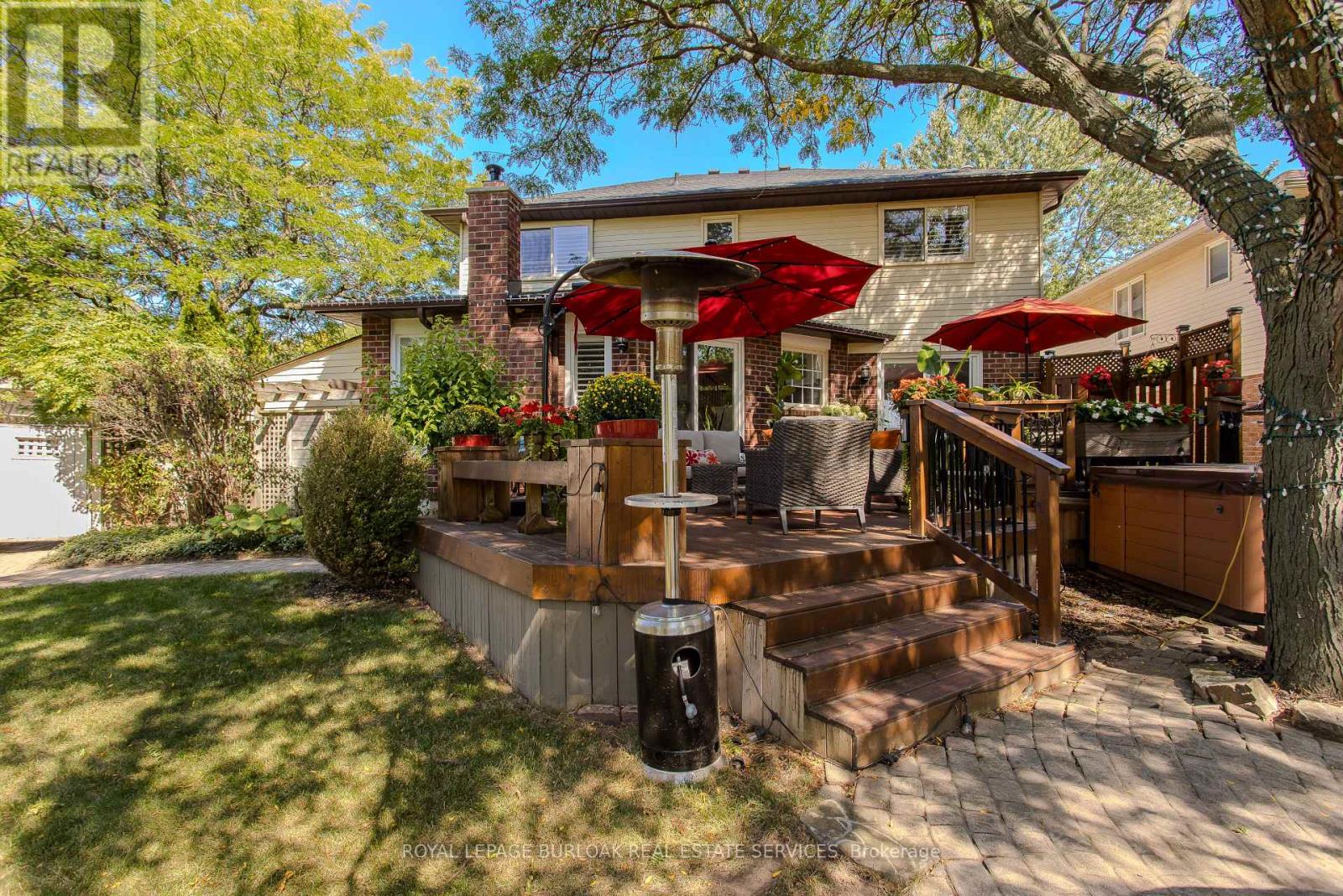 Discover the perfect Family Lifestyle Location in this updated home with 3,479 sqft total living space, nestled in one of Burlington's most well-connected neighbourhoods. Fully renovated on the main and upper levels, it blends modern comfort with a dream family lifestyle setting.  Backing onto a mini ravine with Ireland Park just beyond, and schools, parks, trails, amenities, and highway access mins away, life flows with ease. The exceptional curb appeal sets the tone-professionally landscaped, mature trees, all-brick façade, and a stone walkway lead to a double door entry. A side trail next to the home connects directly to the park, making family adventures effortless. Inside, the bright, open-concept main level is designed for family living and connection. Wide plank light oak hardwood and California shutters flow throughout. The living and dining spaces are perfect for gatherings, while the spacious eat-in kitchen impresses with custom cabinetry, quartz countertops ,premium SS appliances, brick backsplash, and a breakfast nook w/ walkout to the rear deck. A sunken family room with a contemporary stone fireplace and gallery lighting invites memorable evenings. The convenience of a main-floor laundry room with side yard access is ideal for busy households. Upstairs, hardwood continues across 4 generous bedrooms. The expansive primary suite offers multiple oversized windows, a vanity nook, walk-in closet, and a spa-like ensuite with a glass shower and freestanding tub. A 4pc main bath with dual sinks completes this level. The lower level expands the lifestyle possibilities: a versatile rec room, kitchenette, additional bedroom with 2 large closets, and a 3-piece bath, perfect for teens, in-laws, guests, or a nanny. Step outside to your private entertaining oasis. The fully fenced yard, mature trees, interlock patio, and spacious 2-tier deck set the stage for family BBQs, outdoor dining, and year-round fun. This is a home where families grow, gather, and truly live. (id:51158)