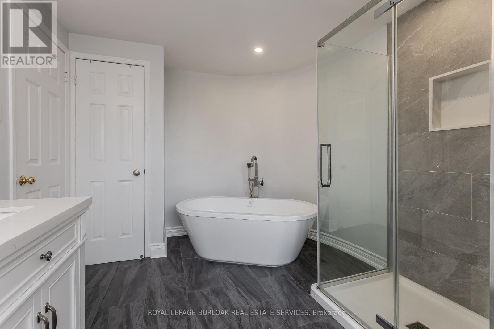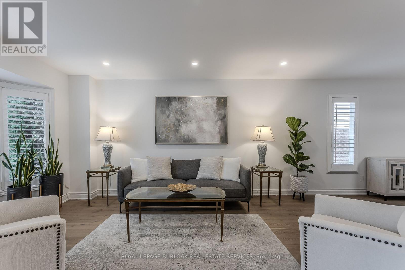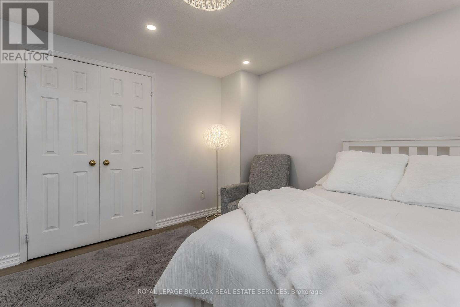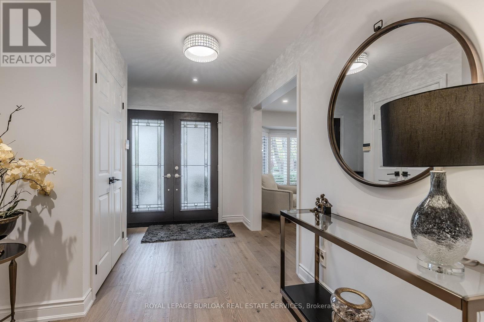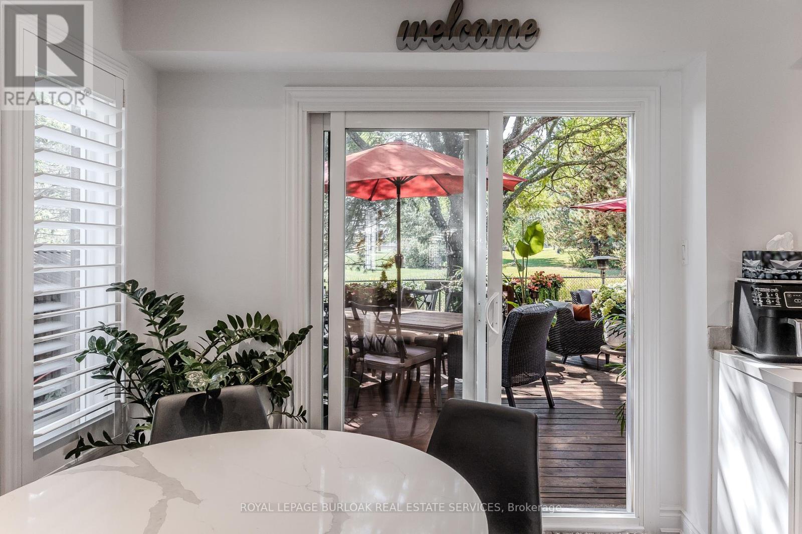 Discover the perfect Family Lifestyle Location in this updated home with 3,479 sqft total living space, nestled in one of Burlington's most well-connected neighbourhoods. Fully renovated on the main and upper levels, it blends modern comfort with a dream family lifestyle setting.  Backing onto a mini ravine with Ireland Park just beyond, and schools, parks, trails, amenities, and highway access mins away, life flows with ease. The exceptional curb appeal sets the tone-professionally landscaped, mature trees, all-brick façade, and a stone walkway lead to a double door entry. A side trail next to the home connects directly to the park, making family adventures effortless. Inside, the bright, open-concept main level is designed for family living and connection. Wide plank light oak hardwood and California shutters flow throughout. The living and dining spaces are perfect for gatherings, while the spacious eat-in kitchen impresses with custom cabinetry, quartz countertops ,premium SS appliances, brick backsplash, and a breakfast nook w/ walkout to the rear deck. A sunken family room with a contemporary stone fireplace and gallery lighting invites memorable evenings. The convenience of a main-floor laundry room with side yard access is ideal for busy households. Upstairs, hardwood continues across 4 generous bedrooms. The expansive primary suite offers multiple oversized windows, a vanity nook, walk-in closet, and a spa-like ensuite with a glass shower and freestanding tub. A 4pc main bath with dual sinks completes this level. The lower level expands the lifestyle possibilities: a versatile rec room, kitchenette, additional bedroom with 2 large closets, and a 3-piece bath, perfect for teens, in-laws, guests, or a nanny. Step outside to your private entertaining oasis. The fully fenced yard, mature trees, interlock patio, and spacious 2-tier deck set the stage for family BBQs, outdoor dining, and year-round fun. This is a home where families grow, gather, and truly live. (id:51158)