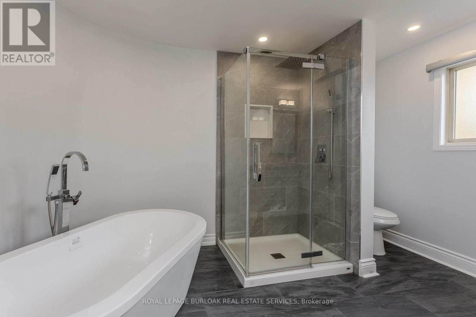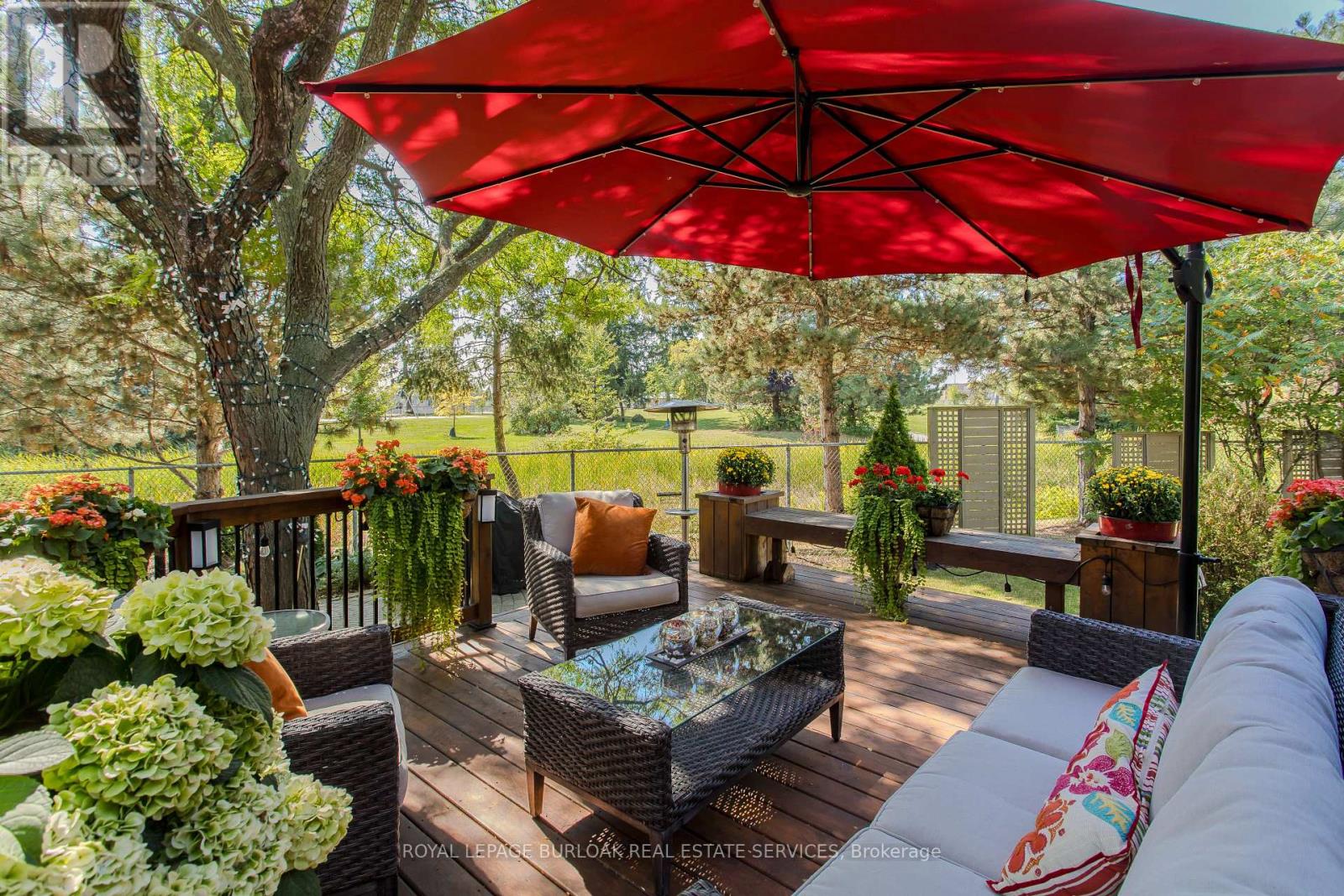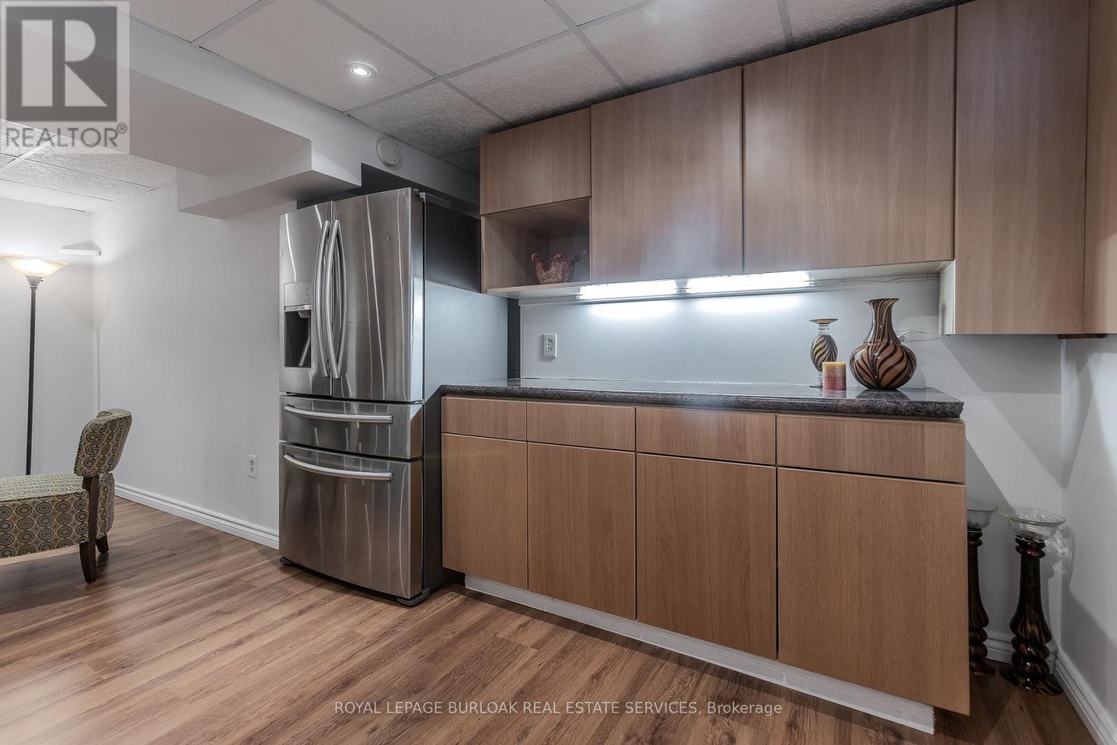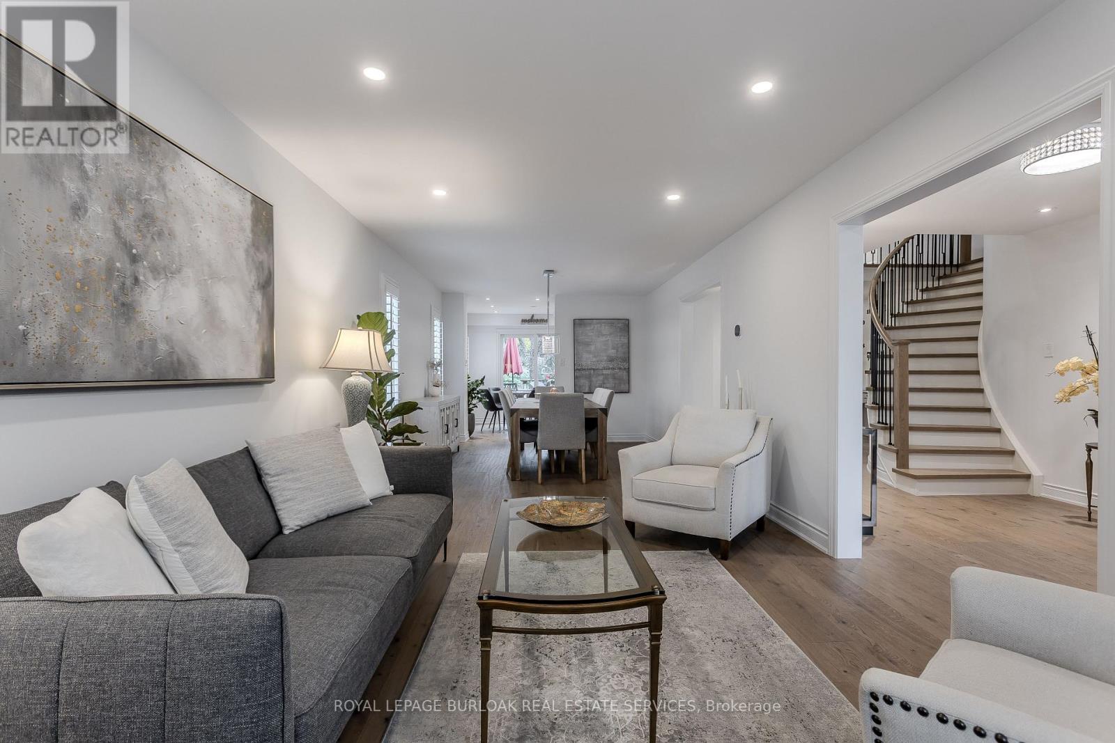 Discover the perfect Family Lifestyle Location in this updated home with 3,479 sqft total living space, nestled in one of Burlington's most well-connected neighbourhoods. Fully renovated on the main and upper levels, it blends modern comfort with a dream family lifestyle setting.  Backing onto a mini ravine with Ireland Park just beyond, and schools, parks, trails, amenities, and highway access mins away, life flows with ease. The exceptional curb appeal sets the tone-professionally landscaped, mature trees, all-brick façade, and a stone walkway lead to a double door entry. A side trail next to the home connects directly to the park, making family adventures effortless. Inside, the bright, open-concept main level is designed for family living and connection. Wide plank light oak hardwood and California shutters flow throughout. The living and dining spaces are perfect for gatherings, while the spacious eat-in kitchen impresses with custom cabinetry, quartz countertops ,premium SS appliances, brick backsplash, and a breakfast nook w/ walkout to the rear deck. A sunken family room with a contemporary stone fireplace and gallery lighting invites memorable evenings. The convenience of a main-floor laundry room with side yard access is ideal for busy households. Upstairs, hardwood continues across 4 generous bedrooms. The expansive primary suite offers multiple oversized windows, a vanity nook, walk-in closet, and a spa-like ensuite with a glass shower and freestanding tub. A 4pc main bath with dual sinks completes this level. The lower level expands the lifestyle possibilities: a versatile rec room, kitchenette, additional bedroom with 2 large closets, and a 3-piece bath, perfect for teens, in-laws, guests, or a nanny. Step outside to your private entertaining oasis. The fully fenced yard, mature trees, interlock patio, and spacious 2-tier deck set the stage for family BBQs, outdoor dining, and year-round fun. This is a home where families grow, gather, and truly live. (id:51158)