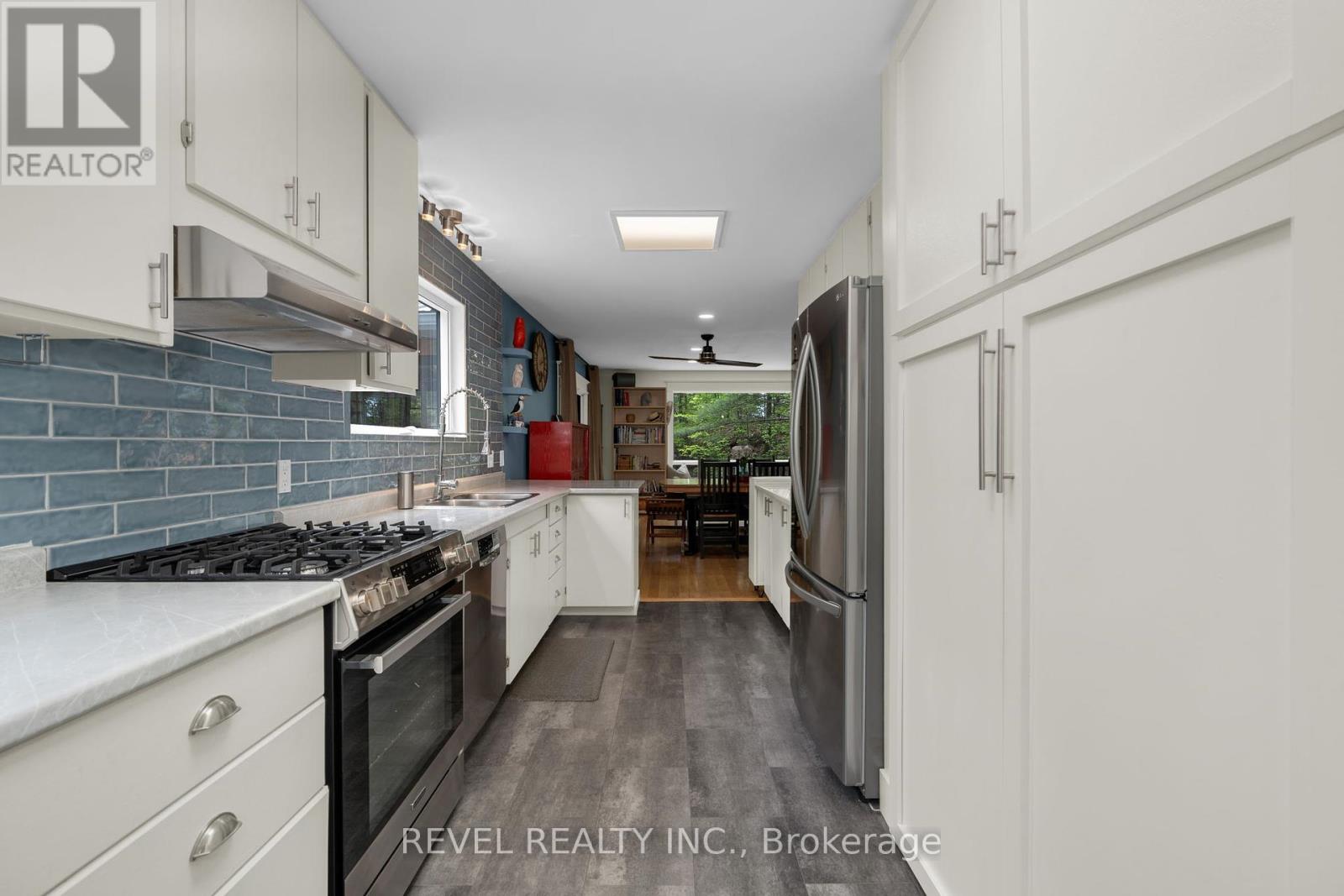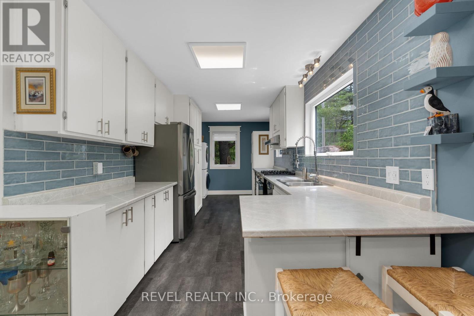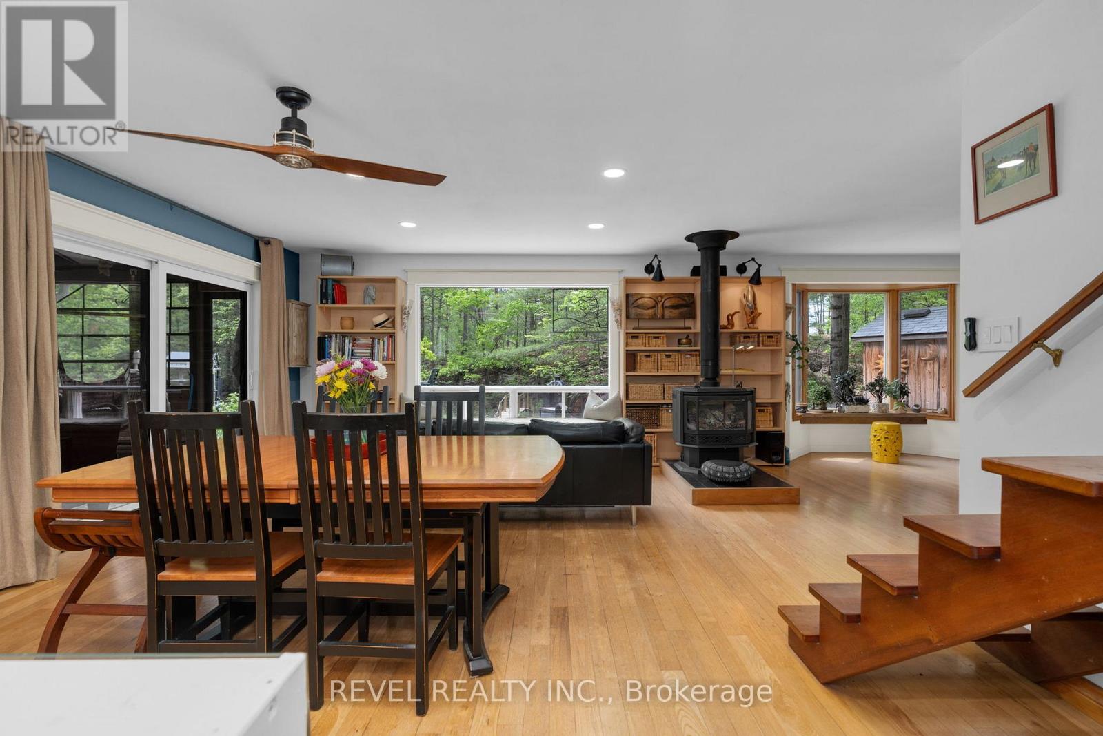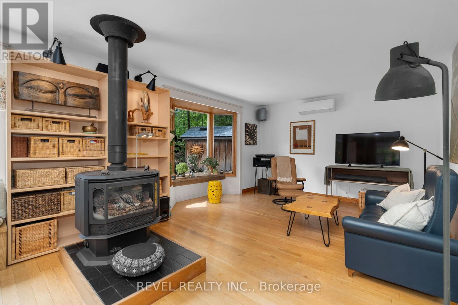 Welcome to 3248 Muskoka Street - a dreamy woodland retreat offering a peaceful, private setting with the convenience of walking to charming downtown Washago. Nestled on over half an acre, this 3 bedroom, 2 bath home is surrounded by mature trees, perennial gardens, and a gentle stream running through the property, creating a truly storybook setting. The main floor features open-concept living and dining spaces with a cozy gas fireplace that warms the home beautifully. The updated galley-style kitchen offers newer stainless steel appliances, including a propane stove, extended counters, and pull-out pantry storage - perfect for keeping everything neat and organized. The bright, heated 3 season sunroom with new windows is a welcoming space to relax and unwind. You'll also find a convenient 3-piece bathroom on the main level as well as access to the large attached workshop - ideal for hobbyists and handymen alike. Head upstairs to 3 generously sized bedrooms- 2 with walk in closets, a 4 piece bath, and a thoughtful storage room. Outdoors, enjoy the private sauna and hot tub tucked amongst the tree canopy, let your creativity flow in the studio shed (2023) with its own electrical panel, or use the charming bridge to cross the stream. This property also features a large carport, and plenty of parking for vehicles and recreational toys. Just steps to the Green and Black Rivers, public boat launch into Lake Couchiching, local beach, shops, cafés, and community events. Quick access to Hwy 11, Orillia, and Gravenhurst. Washago will be a stop in the upcoming relaunch of the Northlander passenger train from the GTA. Recent updates include roof (2023), windows (2022), heat pump (2022), exterior paint (2024), hwt (2024), side deck (2022), and more. A rare opportunity to own a unique property that blends cottage-country serenity with in-town convenience. Easy to show. Don't miss this one! (id:51158)