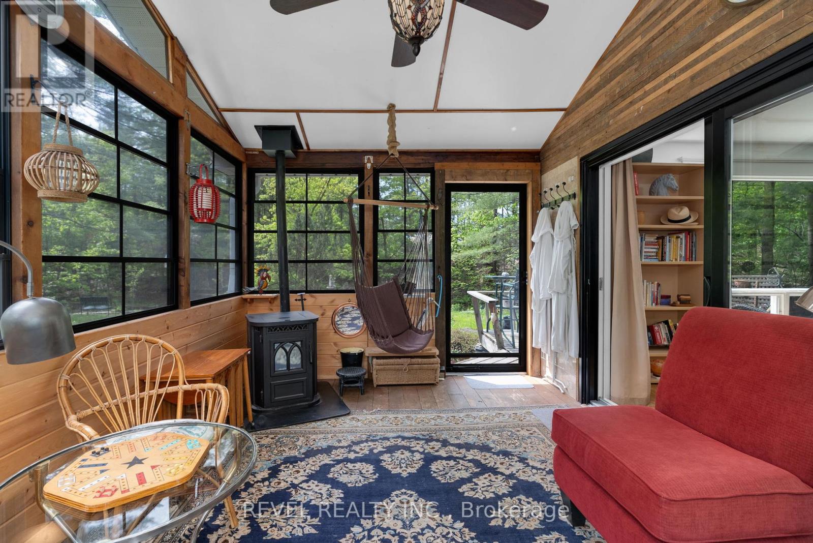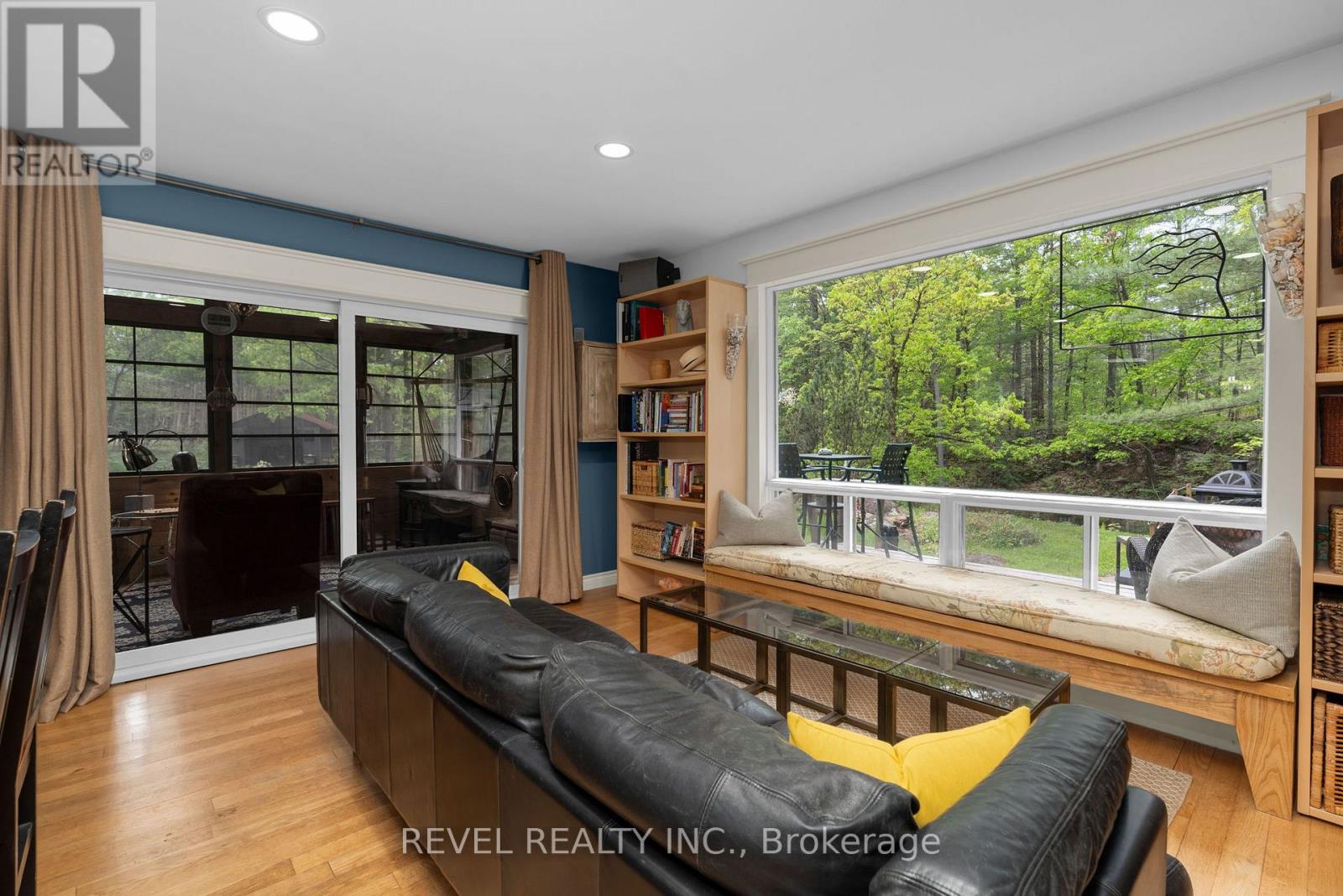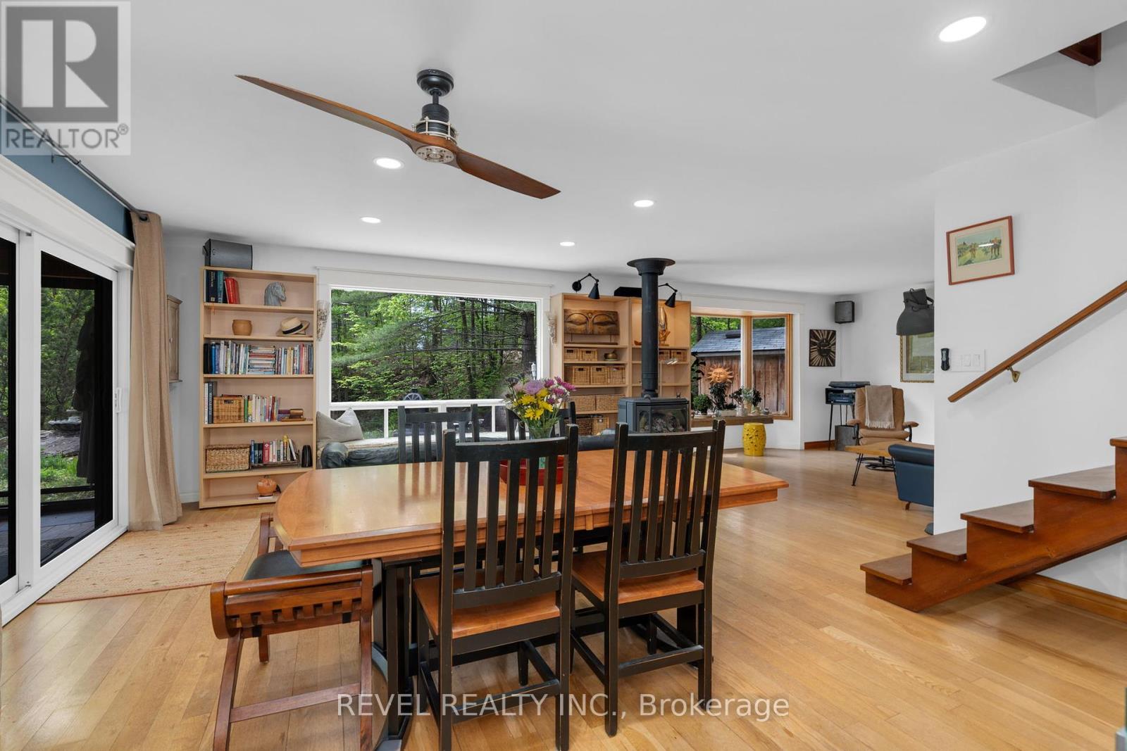 Welcome to 3248 Muskoka Street - a dreamy woodland retreat offering a peaceful, private setting with the convenience of walking to charming downtown Washago. Nestled on over half an acre, this 3 bedroom, 2 bath home is surrounded by mature trees, perennial gardens, and a gentle stream running through the property, creating a truly storybook setting. The main floor features open-concept living and dining spaces with a cozy gas fireplace that warms the home beautifully. The updated galley-style kitchen offers newer stainless steel appliances, including a propane stove, extended counters, and pull-out pantry storage - perfect for keeping everything neat and organized. The bright, heated 3 season sunroom with new windows is a welcoming space to relax and unwind. You'll also find a convenient 3-piece bathroom on the main level as well as access to the large attached workshop - ideal for hobbyists and handymen alike. Head upstairs to 3 generously sized bedrooms- 2 with walk in closets, a 4 piece bath, and a thoughtful storage room. Outdoors, enjoy the private sauna and hot tub tucked amongst the tree canopy, let your creativity flow in the studio shed (2023) with its own electrical panel, or use the charming bridge to cross the stream. This property also features a large carport, and plenty of parking for vehicles and recreational toys. Just steps to the Green and Black Rivers, public boat launch into Lake Couchiching, local beach, shops, cafés, and community events. Quick access to Hwy 11, Orillia, and Gravenhurst. Washago will be a stop in the upcoming relaunch of the Northlander passenger train from the GTA. Recent updates include roof (2023), windows (2022), heat pump (2022), exterior paint (2024), hwt (2024), side deck (2022), and more. A rare opportunity to own a unique property that blends cottage-country serenity with in-town convenience. Easy to show. Don't miss this one! (id:51158)