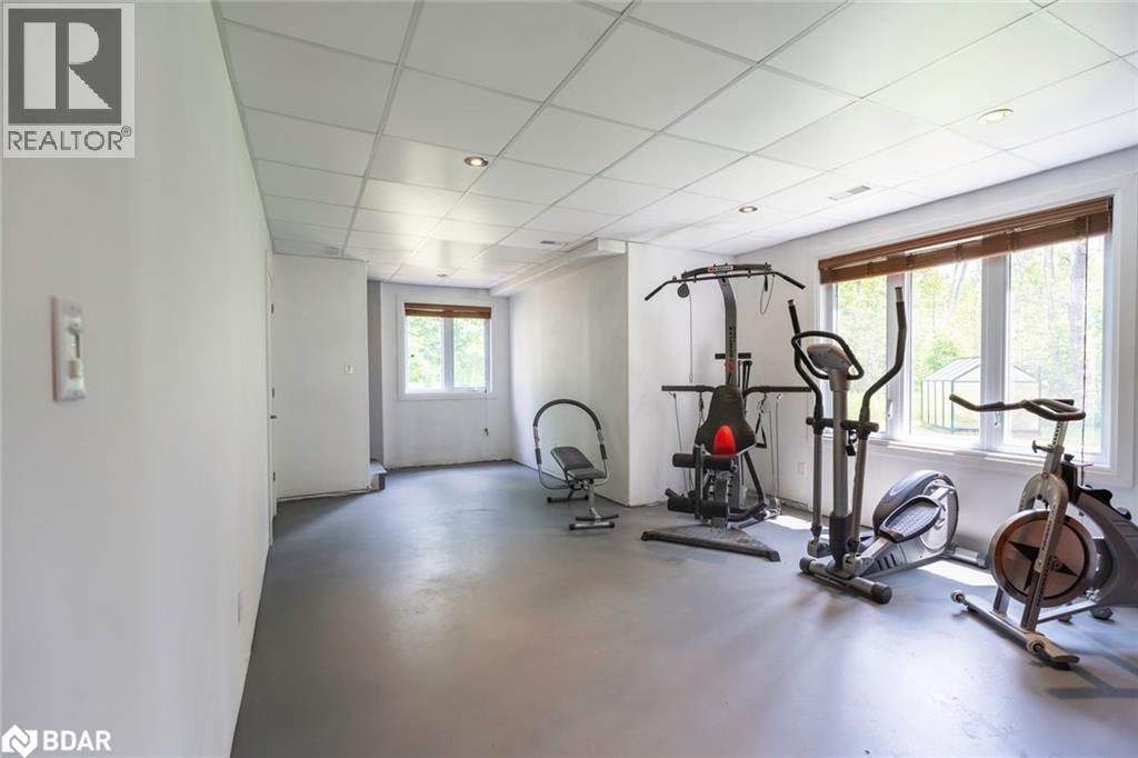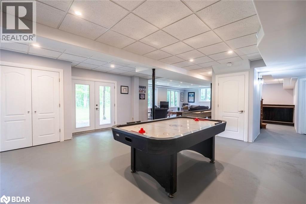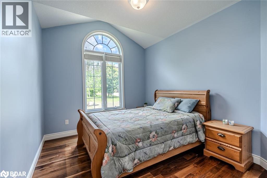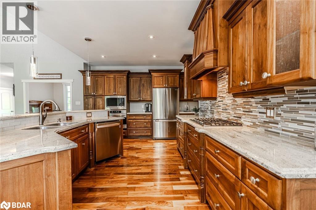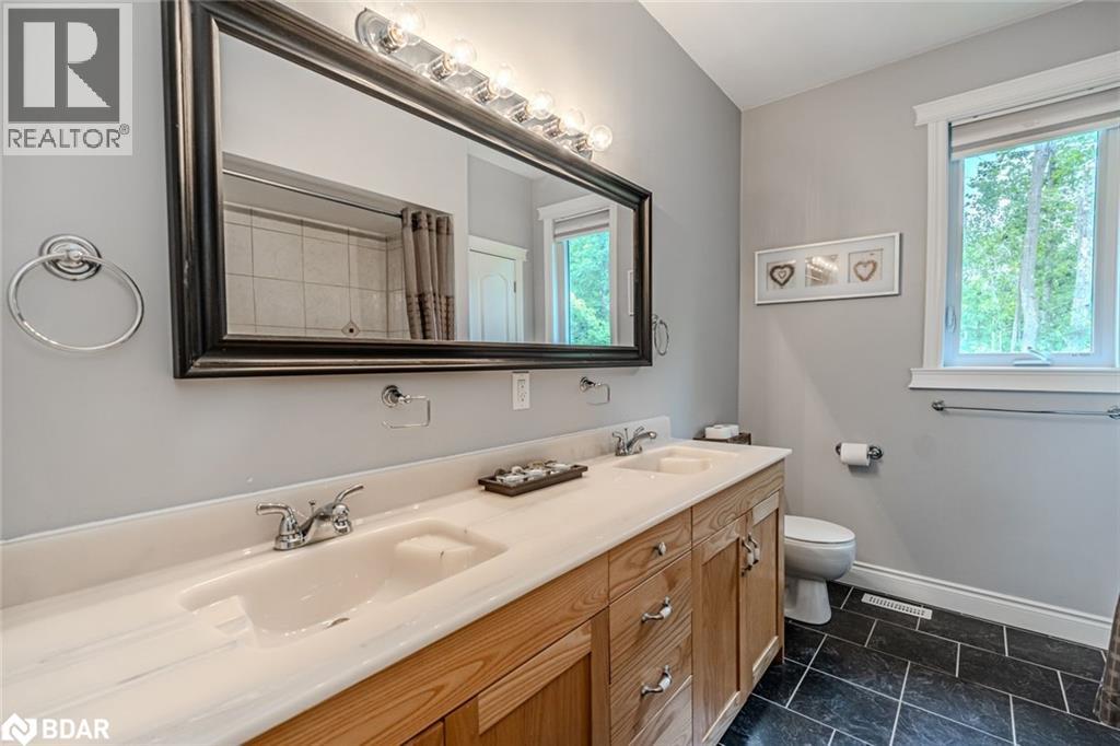 OVER 3,500 SQ FT OF LIVING SPACE ON 1.3 ACRES WITH A TRIPLE GARAGE & A 15-MINUTE WALK TO THE BEACH! Tucked among mature trees and moments from the water, this impressive all-brick bungalow offers over 3,500 finished square feet of upgraded living on a peaceful 1.3-acre lot within walking distance to the beach and Bayview Memorial Park with a playground. Enjoy quick access to marinas, trails, schools, and Hwy 11, with both Orillia and Barrie less than 20 minutes away. The landscaped grounds include a greenhouse, perennial gardens, and a welcoming front porch that adds timeless curb appeal. A triple garage and oversized driveway provide ample space for parking, storage, and recreational gear. Vaulted ceilings, walnut-stained hardwood, pot lights, contemporary paint tones, and a dramatic floor-to-ceiling stone fireplace elevate the main living space. The custom kitchen is designed with wood cabinetry, crown moulding, granite counters, a glass tile backsplash, an oversized breakfast bar, and stainless steel appliances including a gas cooktop, wall oven, and built-in microwave. The dining area opens to an elevated deck with peaceful treetop views. A spacious laundry room with storage and sink, along with an open-concept office or playroom, add everyday function. Three bedrooms complete the main level, including a primary suite with pot lights, a walk-in closet, walkout, and a 5-piece ensuite. The finished walkout basement expands the living space with a massive rec room, gym area, den, 3-piece bath, pot lights, concrete floors, and potential for in-floor heating. Two separate lower-level entrances offer flexibility for future plans, including the option to add an elevator. Added upgrades include high-efficiency windows, upgraded insulation, and an ERV/HRV system. Settle into a #HomeToStay that offers long-term comfort in a setting you’ll never outgrow. (id:51158)