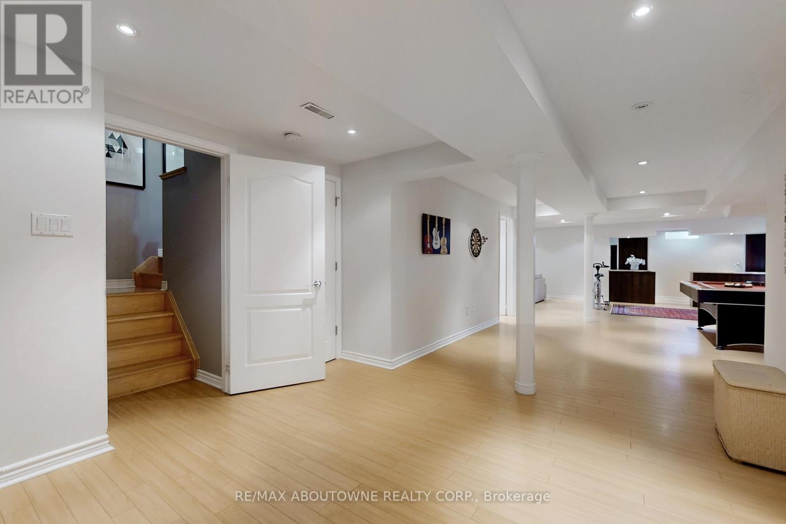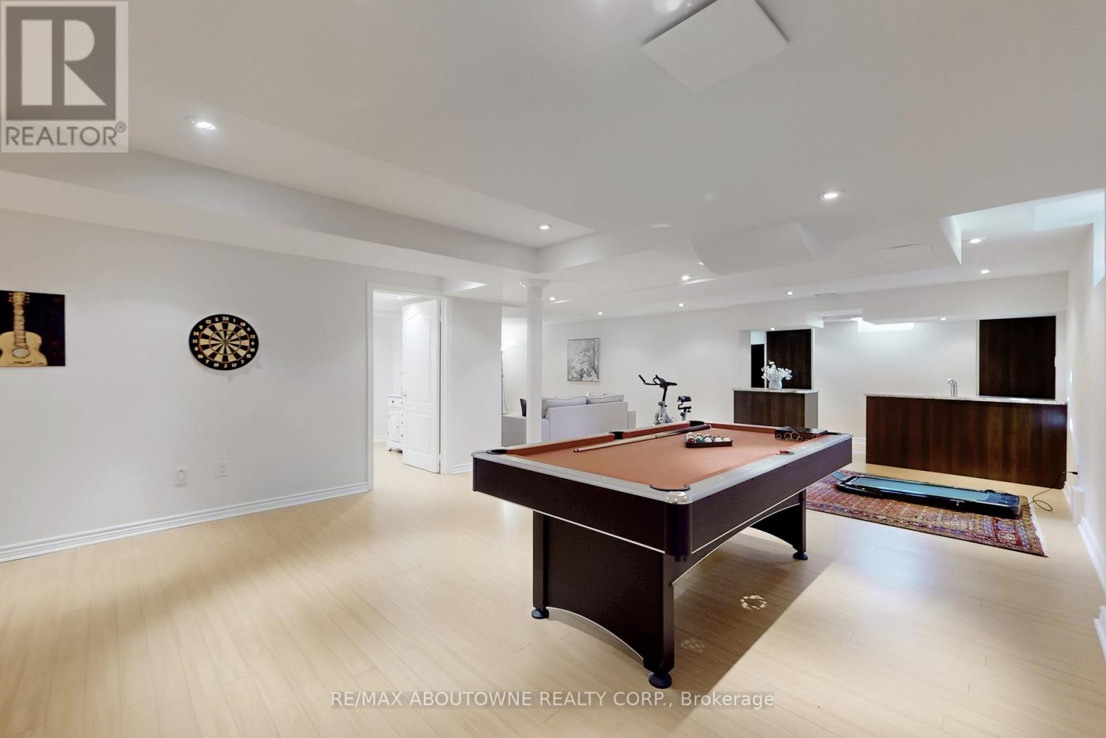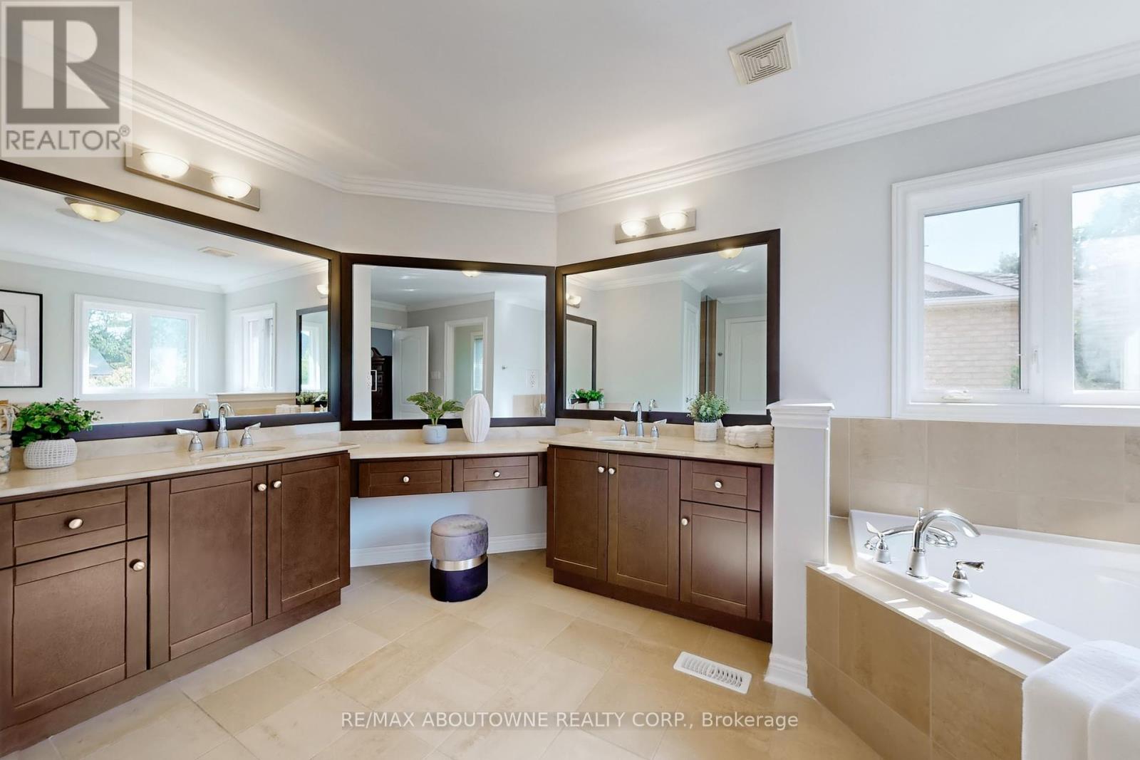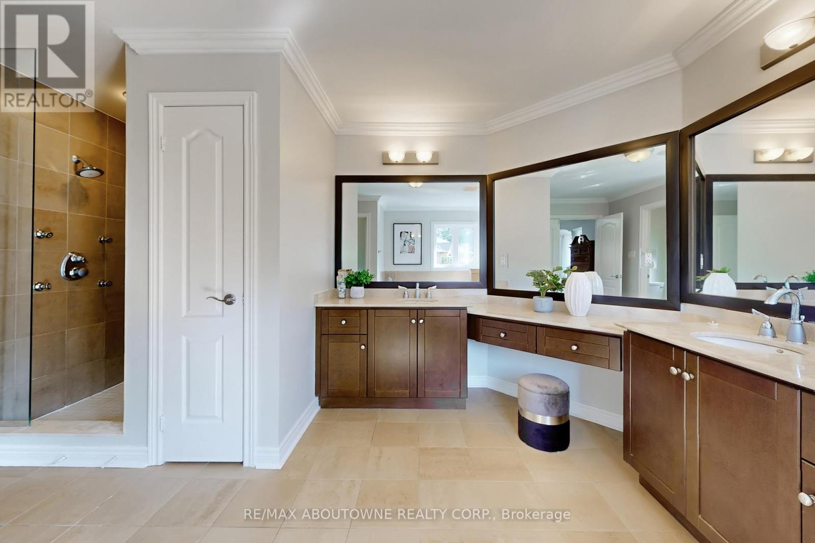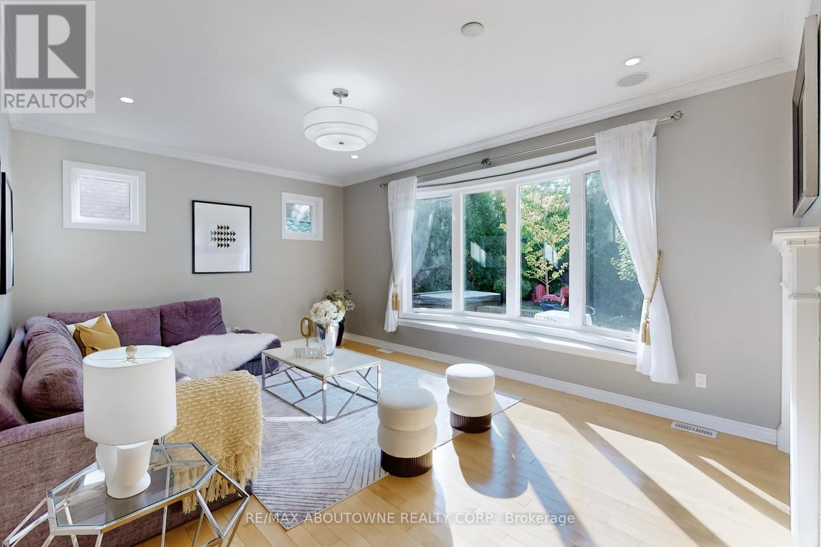 Prestigious Lakeshore Woods community! This exceptional residence sits on a rare pie-shaped lot that widens at the back, offering one of the largest and most private yards in the neighbourhood. With over 5000 sq ft of elegant living space plus a tandem 3-car garage, the home combines timeless curb appeal with modern comfort. A double-door entry leads to a soaring 10 ft foyer with walk-in closet, flanked by a bright front office. Formal living and dining rooms with coffered ceilings provide an elegant setting, while the gourmet white kitchen features granite counters, induction cooktop, LG built-in oven, newer fridge, chefs desk and triple pantry. The adjoining breakfast area is filled with natural light and overlooks the backyard, opening to the family room with two-sided fireplace, soaring windows and chandelier. A large laundry/mudroom and powder room complete the main level. Upstairs, four spacious bedrooms each have ensuite baths and walk-in closets. The luxurious primary retreat offers a king-sized bedroom, sitting area with decorative columns, sunroom-style alcove, two walk-in closets with built-ins and windows, and a spa-like ensuite with dual vanities, makeup station, soaker tub, glass shower, private toilet room and bonus storage. A generous walk-in linen closet adds practicality. The professionally finished lower level expands living space with a recreation and billiards area, media/TV lounge, fitness zone, kitchenette, guest bedroom, full bath and storage. Outdoor living includes a multi-level deck with gas line for BBQ, hot tub and outdoor sauna (both in as is condition), a half basketball court and mature trees for complete privacy. A reinforced pad at the front allows boat parking. Steps from Lake Ontario, Shell Park, trails and dog park, this is a rare lifestyle opportunity in one of Oakvilles most desirable neighbourhoods. (id:51158)